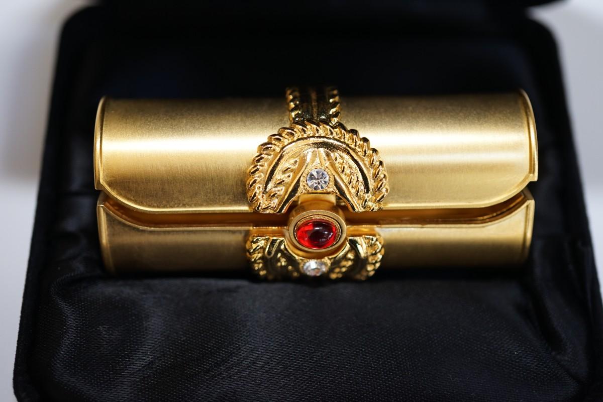 Collectible Princess Marcella era 1970's Italian brass lipstick holder with a red cabochon stone and facet style rhinestones in crystal accent the clasp. The brushed brass lipstick holder comes with the original black satin lined and felt presentation box.