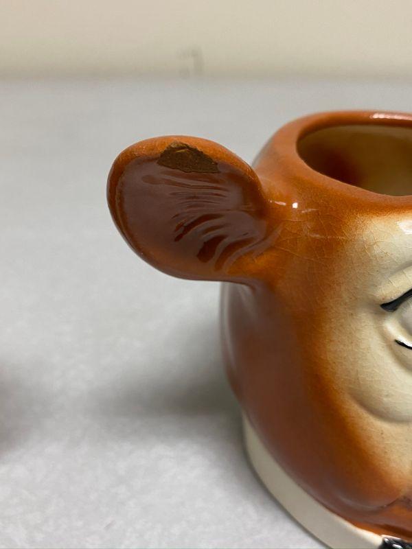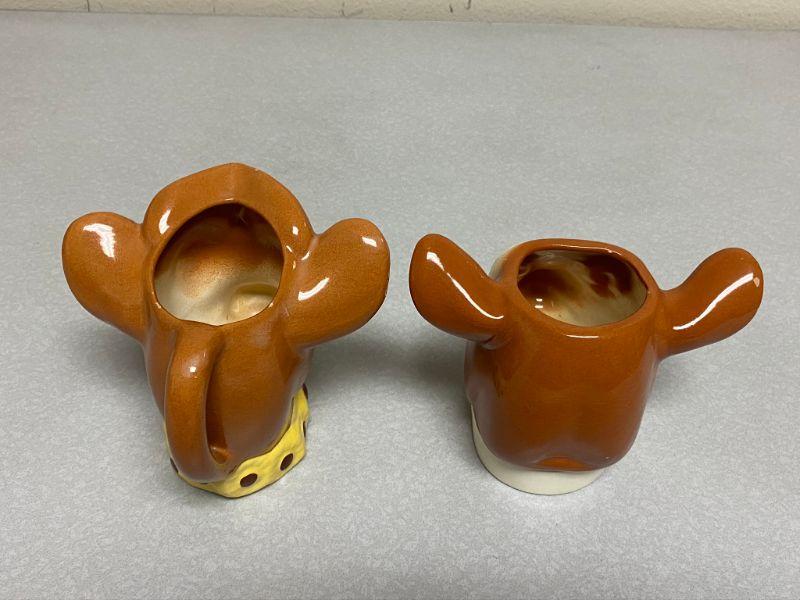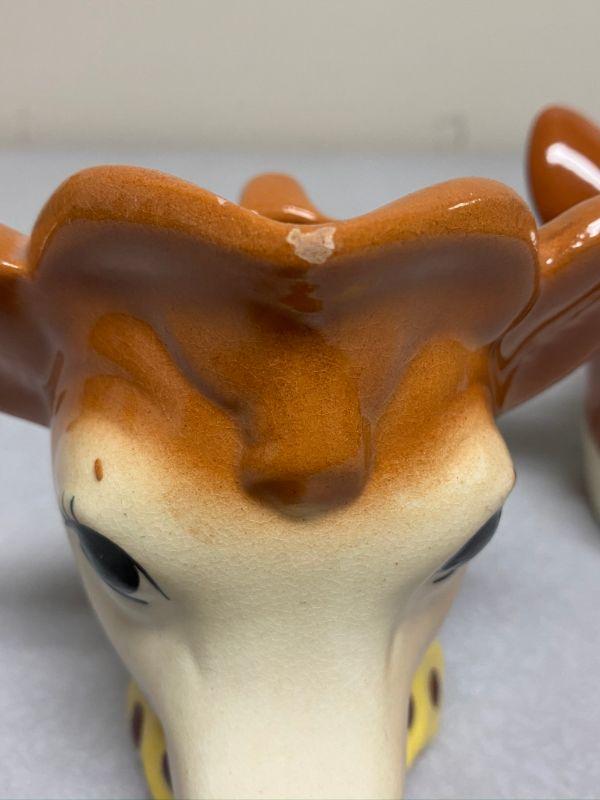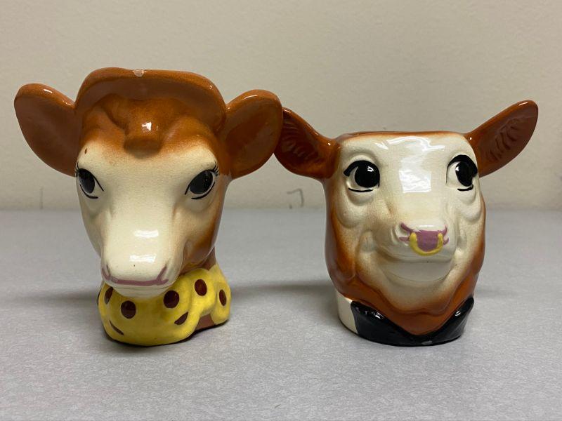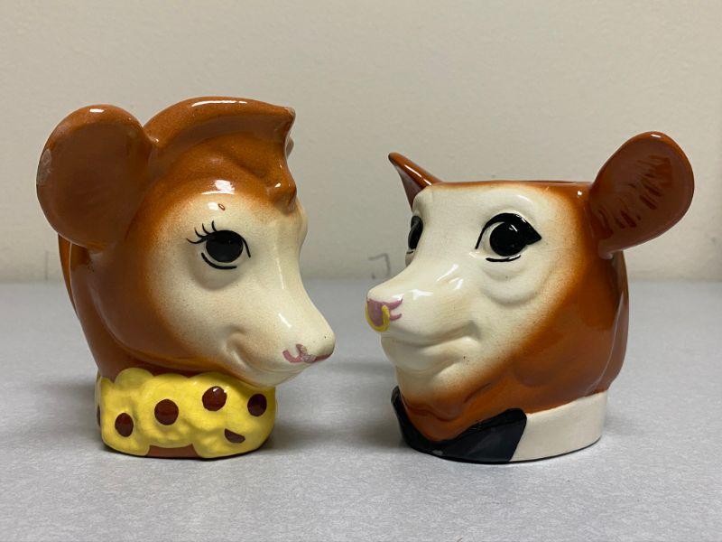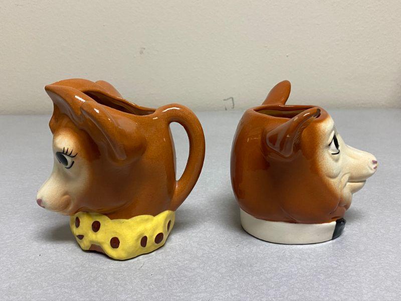 Vintage Borden's Elsie the Cow and Elmer the Bull cream & sugar set. Elmer is missing his hat (lid). There is crazing on both pieces. Elmer has a chip in ear, photo'd. a couple small chips in the glaze of Elsie. Really cute and display well.