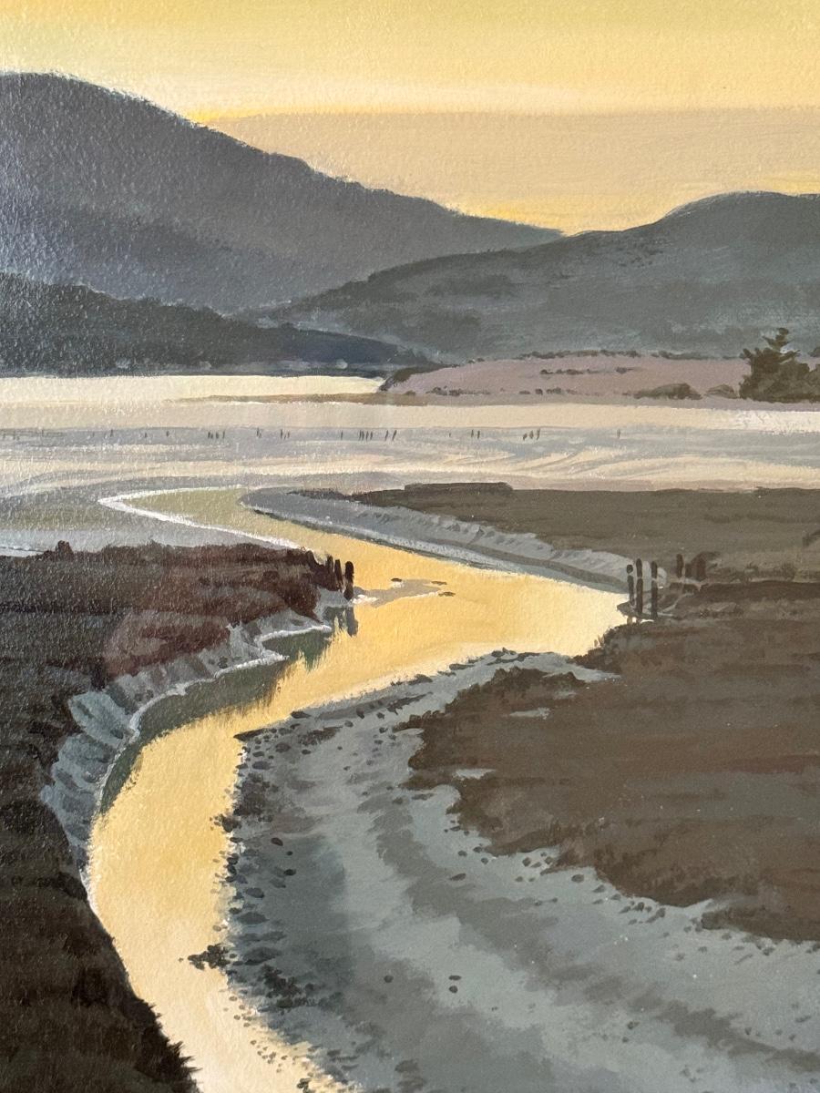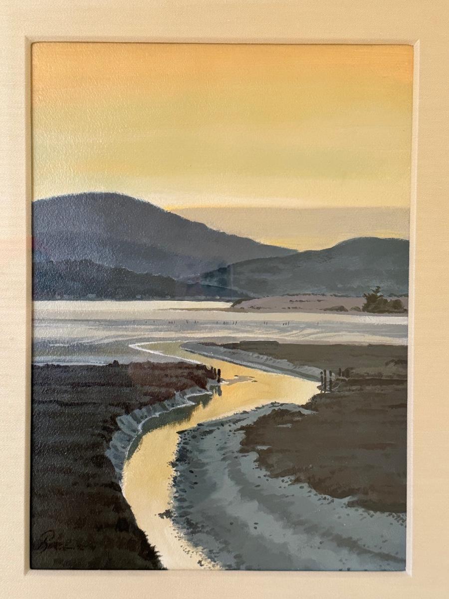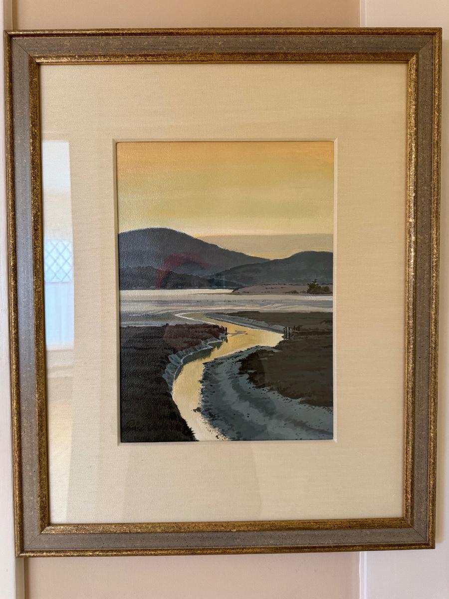 Borg, 1992, framed gouache painting, river landscape, 1992