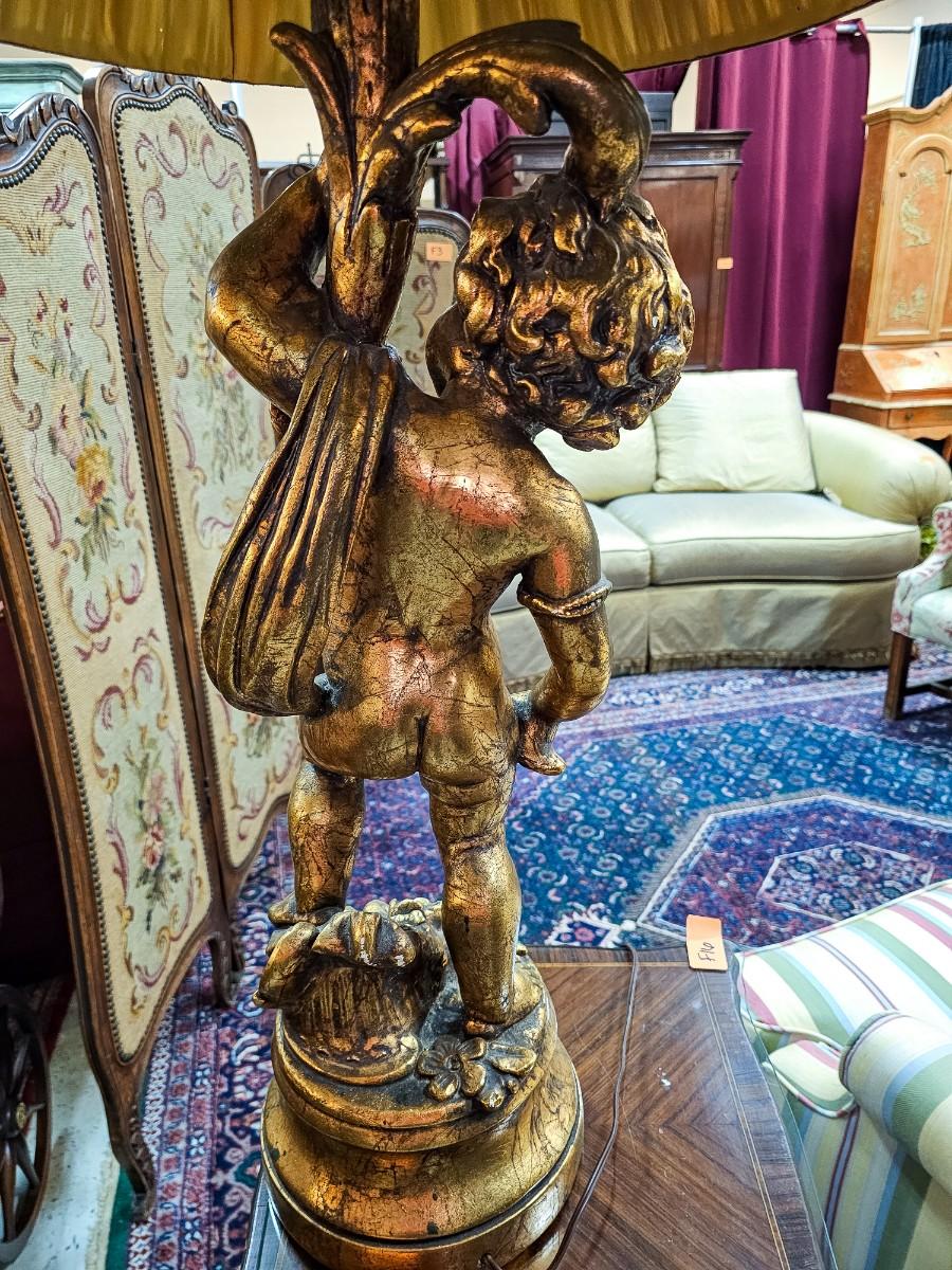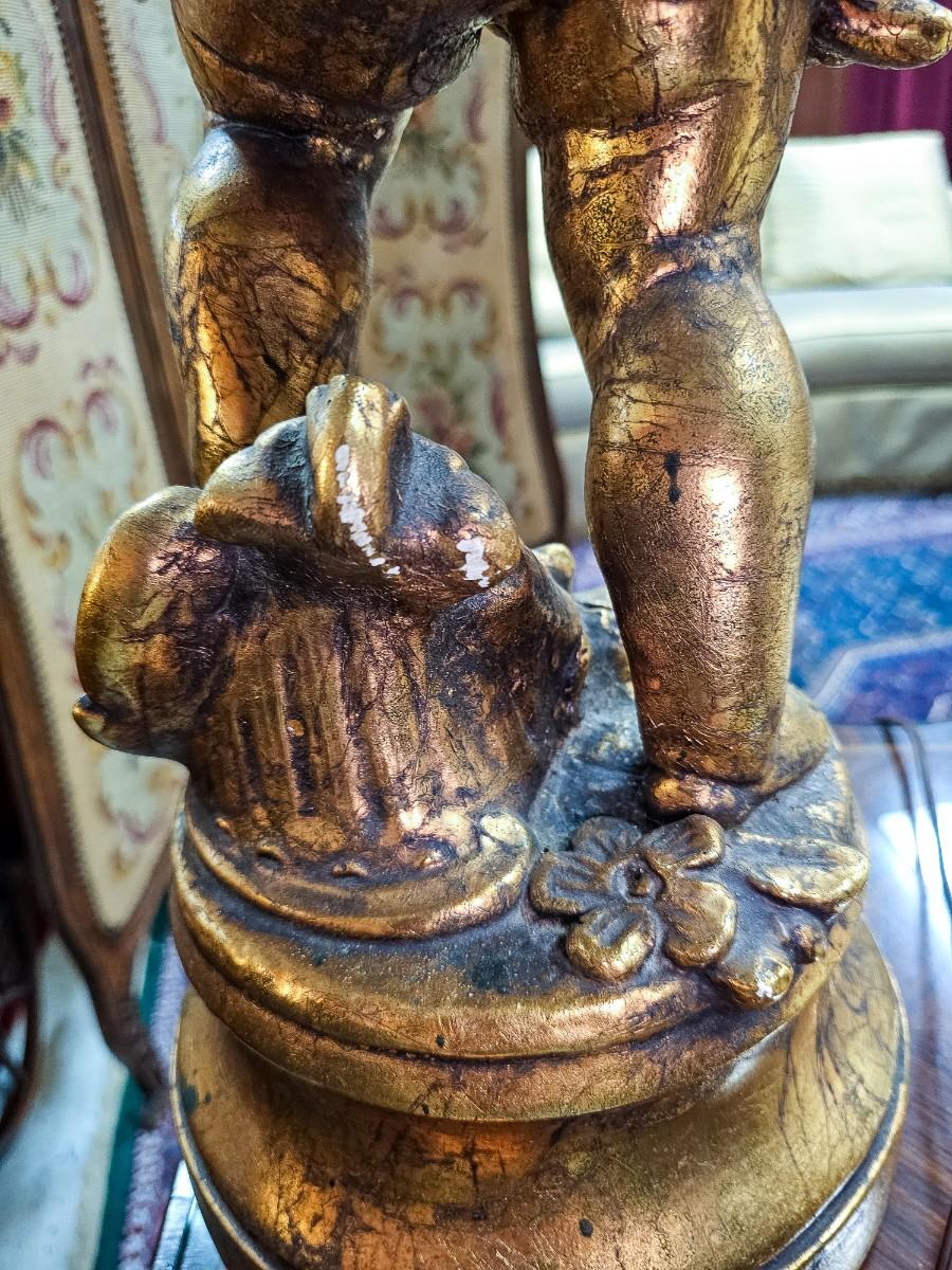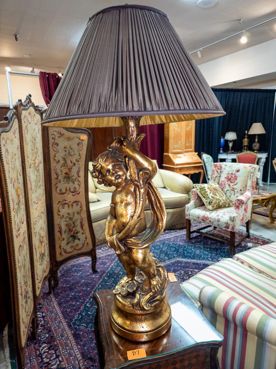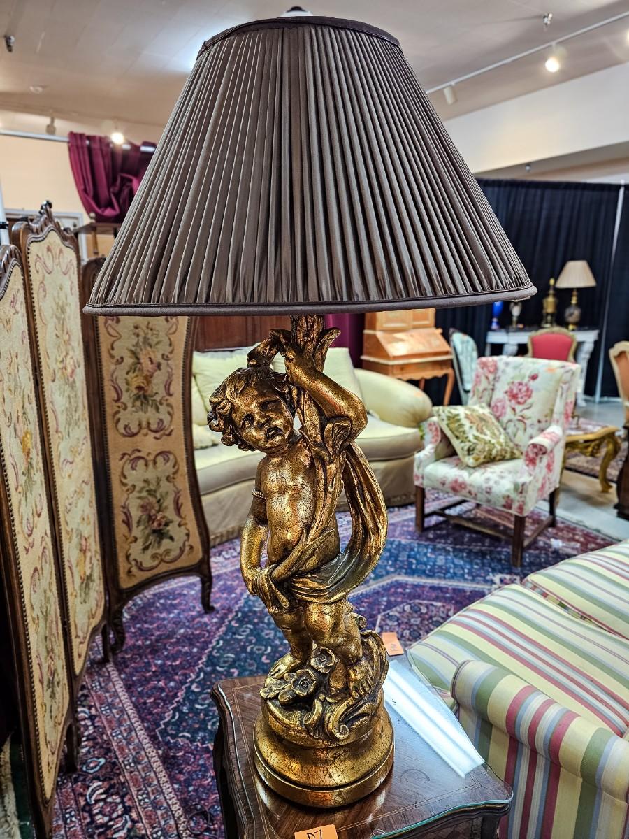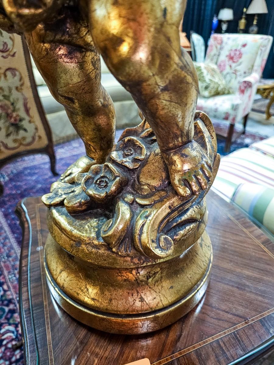 Large Hollywood Regency Gilt Borghese cherub lamp, some scuffs and wear 10" W x 42" H