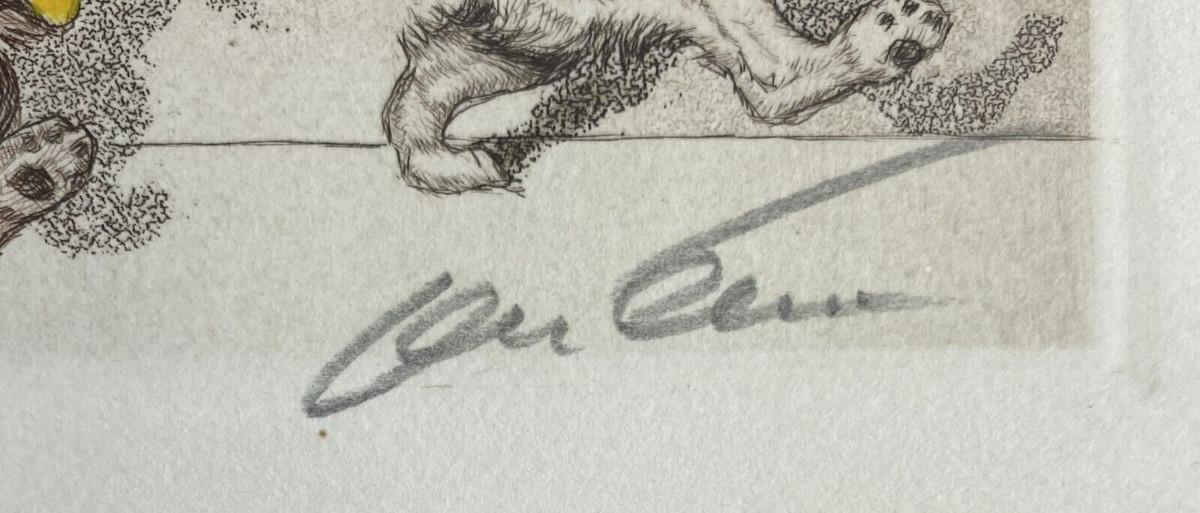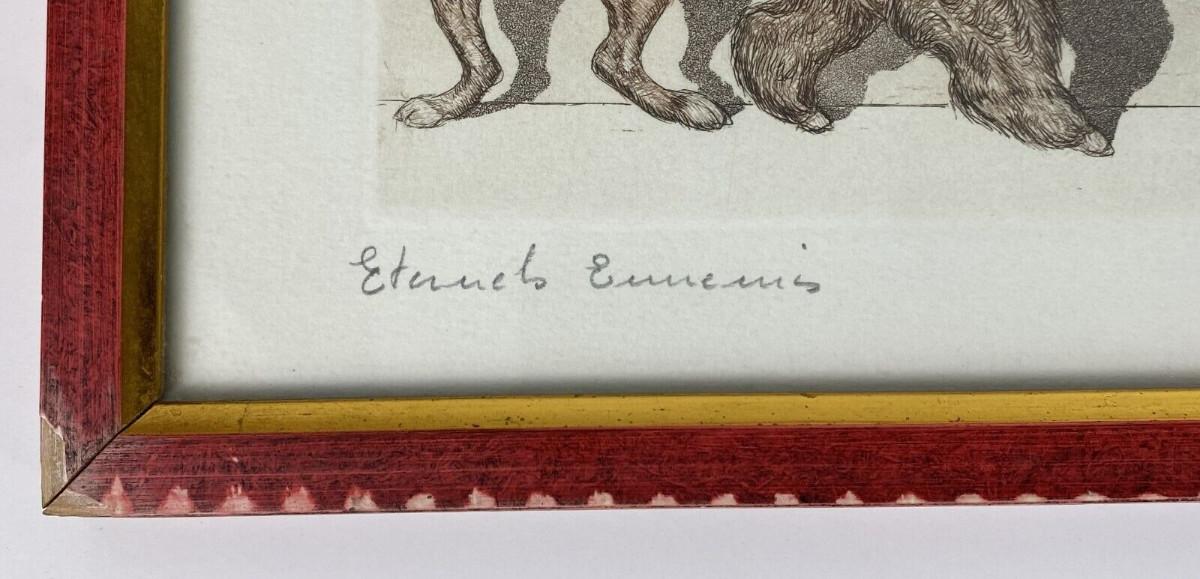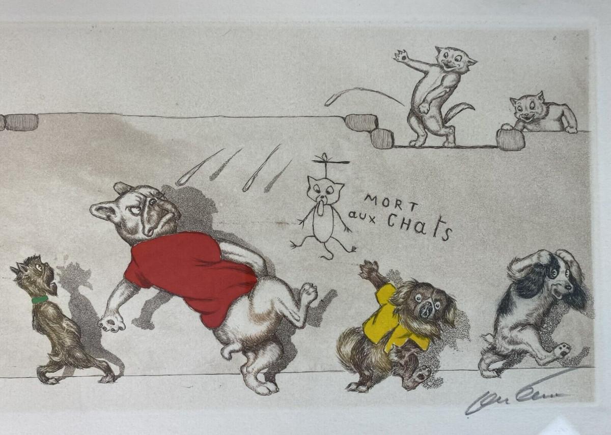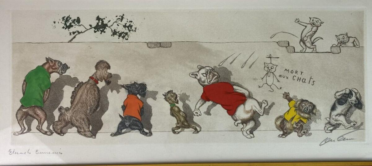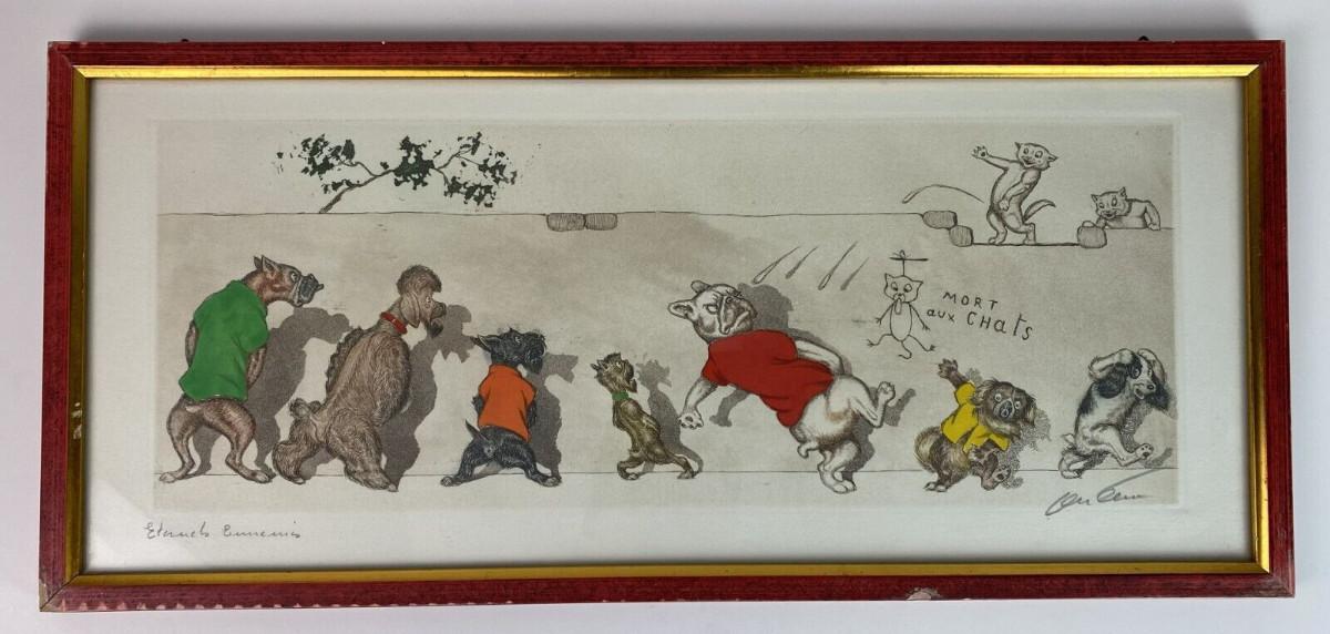 Here is a signed and framed hand-colored etching of Boris O'Klein titled 'Eternels ennemis' also referred to as 'Mort aux chats'...Part of his Naughty or Dirty Dogs series...Titled and signed in pencil...Excellent condition...Light frame wear with age...The artist was born in Russia in 1893..his family emigrated to France where he lived and worked in Paris until 1985...'Death to cats'...'Eternal Enemies'...Frame is 30.25 x 8.25"...The image measures 17 x 6.5".