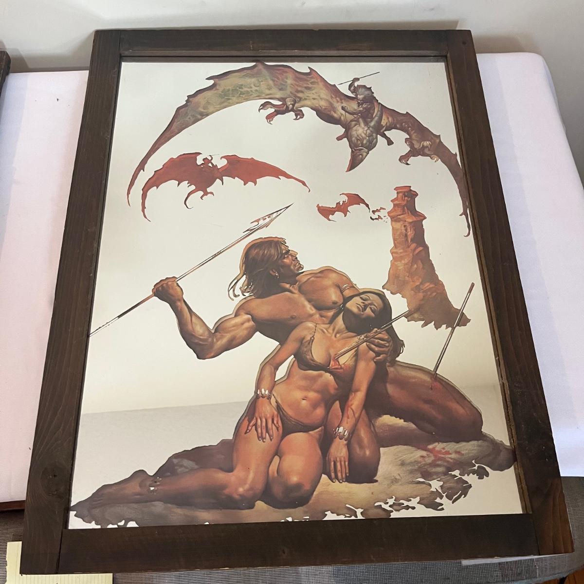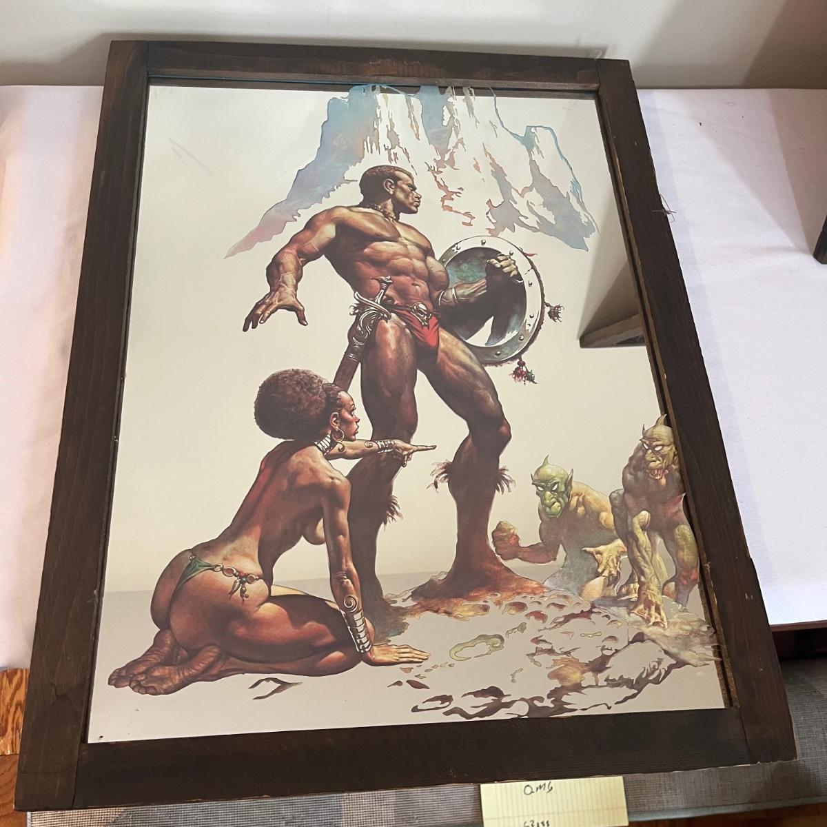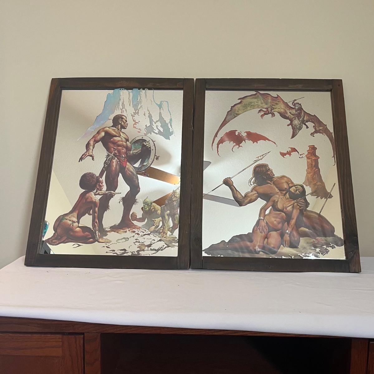 Lot includes two pieces of framed mirror art that appears to be by Boris Vallejo. One is titled Nubian Warriors and the other is titled Last Stand. Wooden Frames measure 20.5” x 26.5”. One frame has duct tape on back.