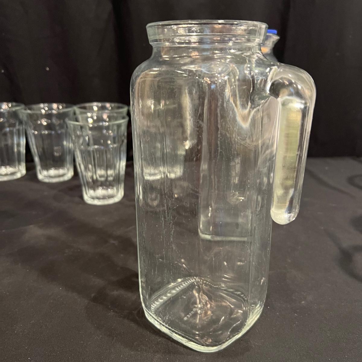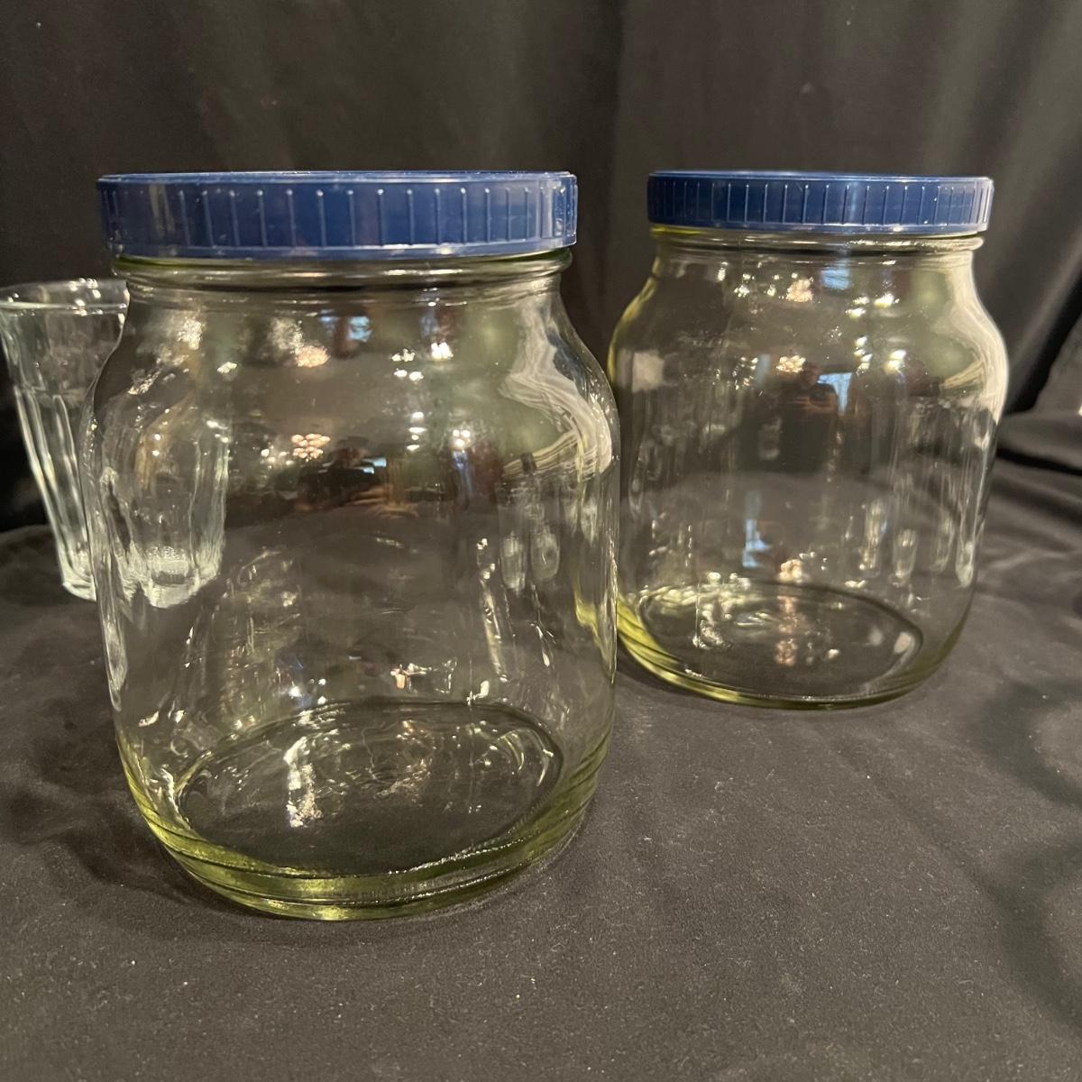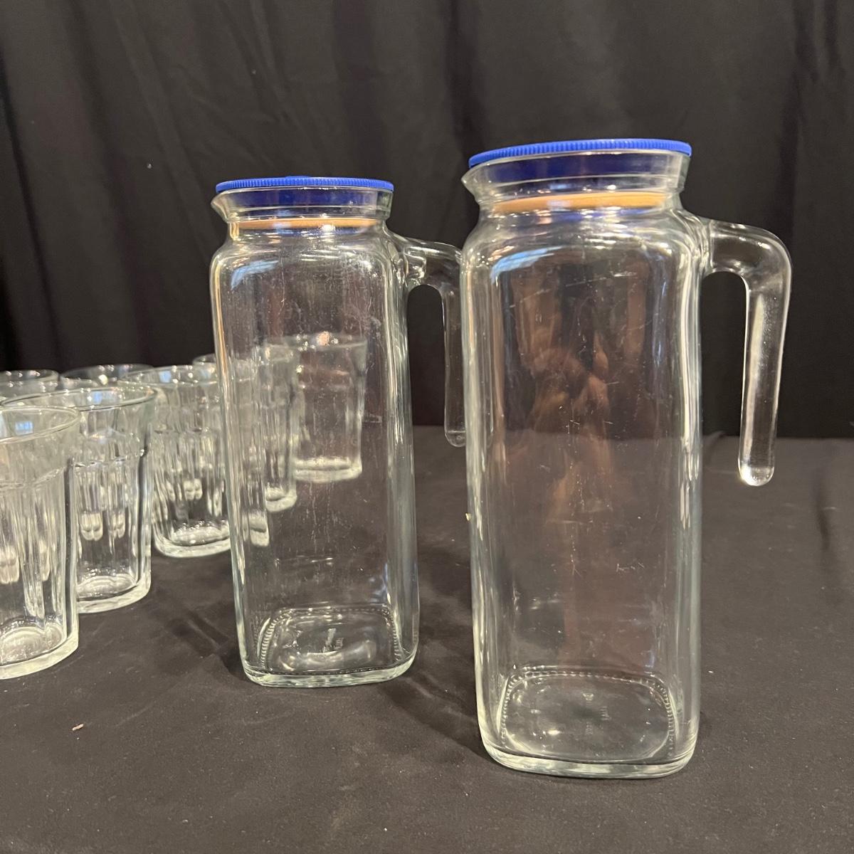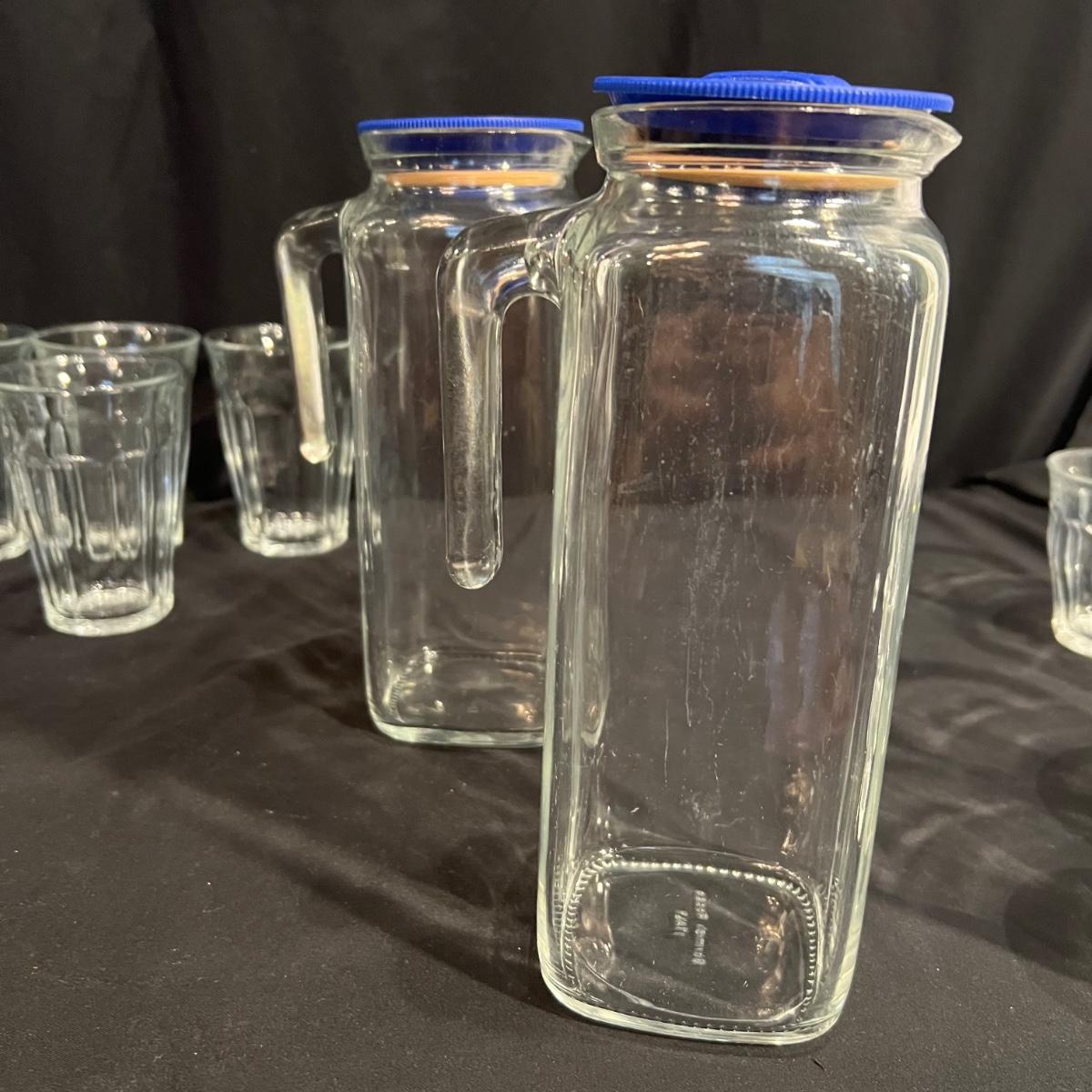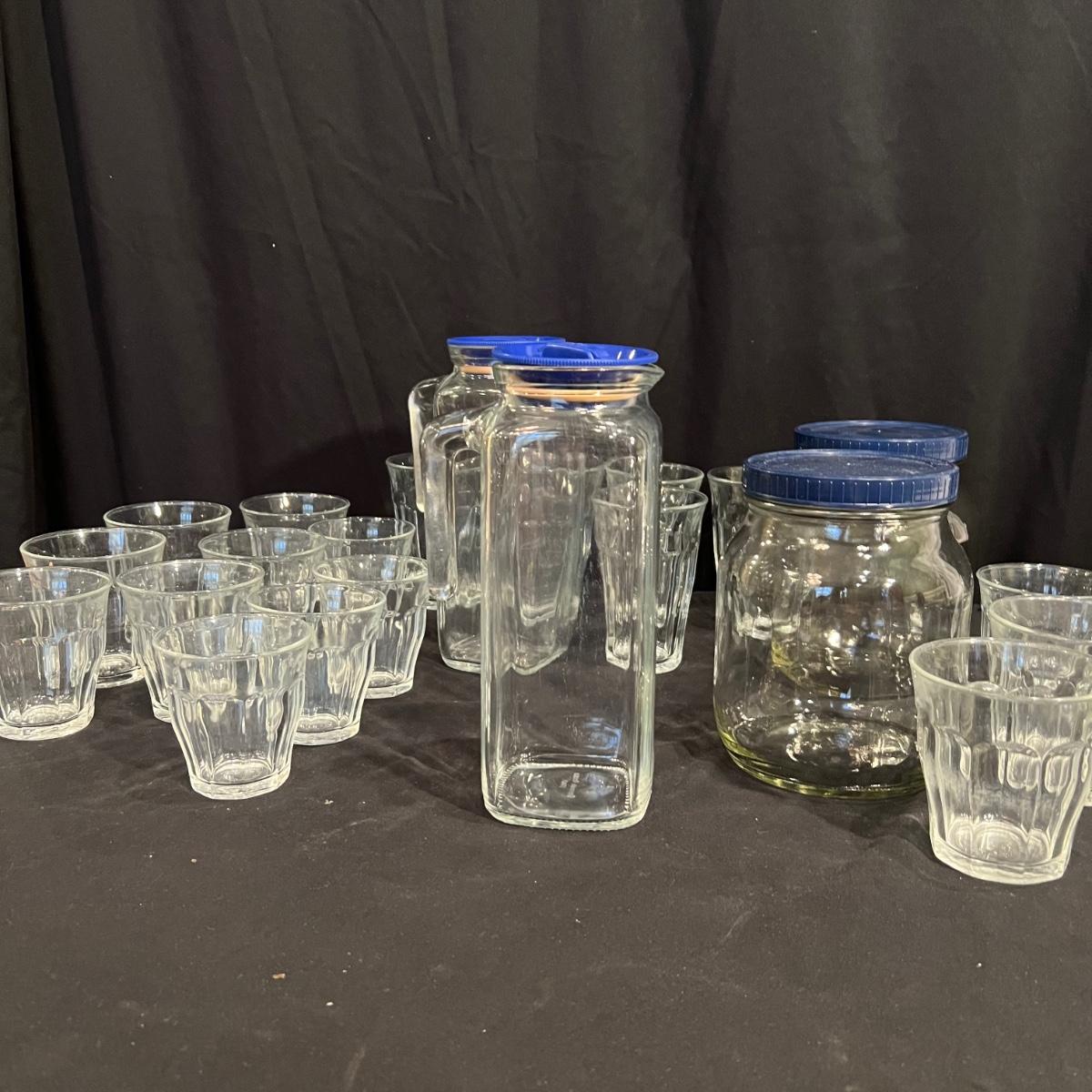 This pair of glass pitchers are stamped 'Bormioli Rocco, made in Italy'. They measure 4” x 4” x 9”H and have blue plastic lids with seals. A pair of glass canisters also have blue plastic lids. The drinking glasses are a set with four different sizes. There are twenty total, largest measures 3.5”D x 5”H.