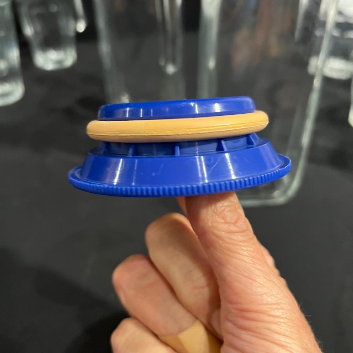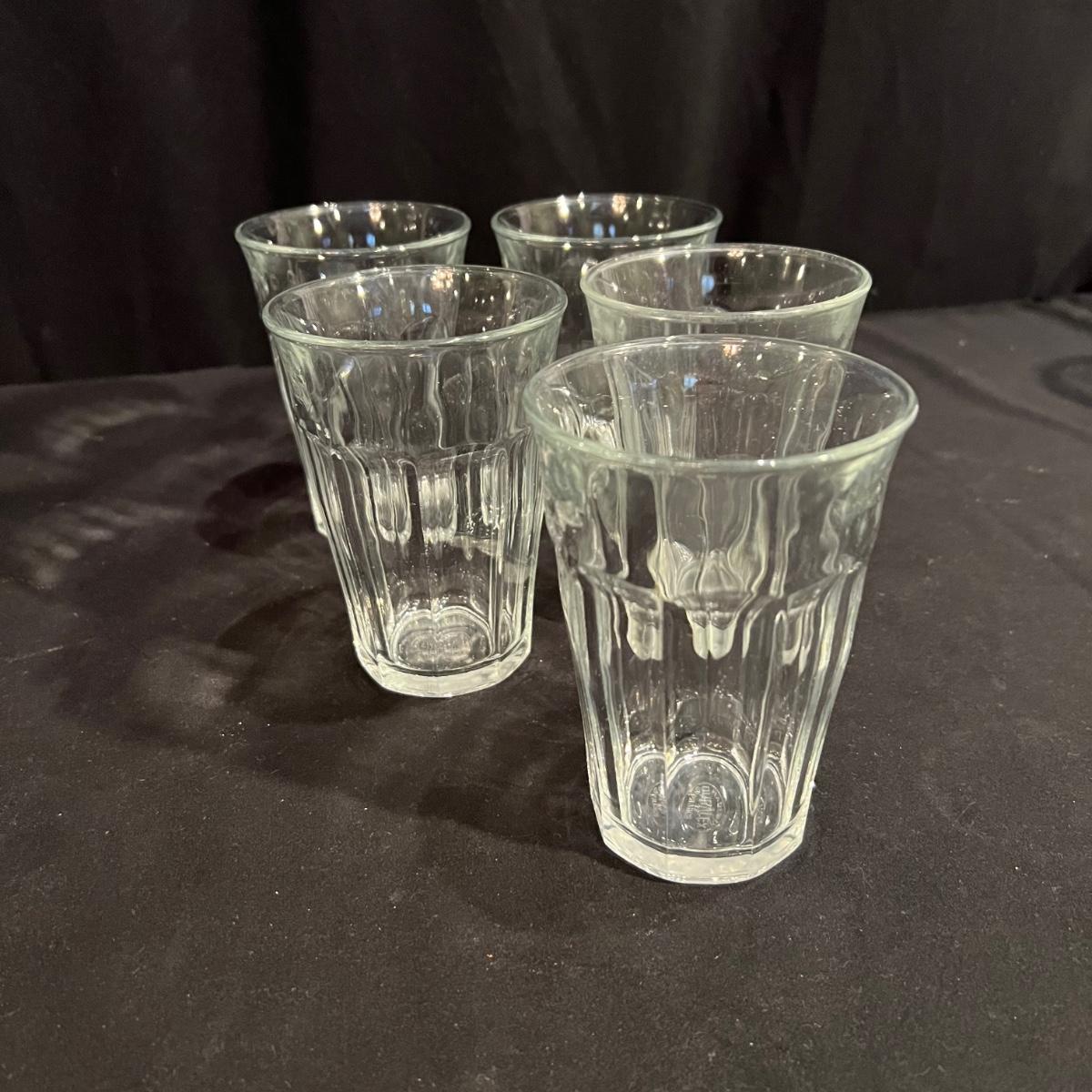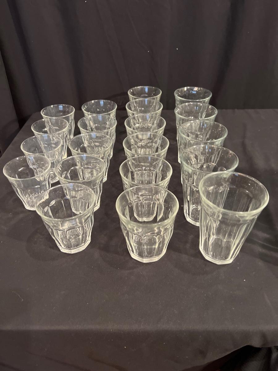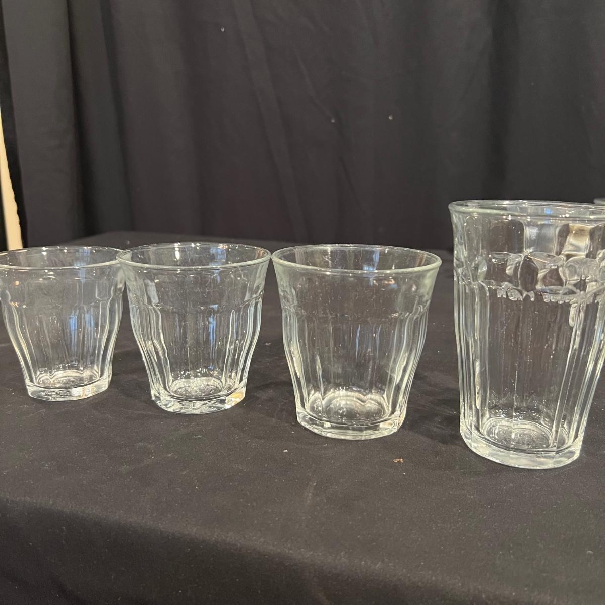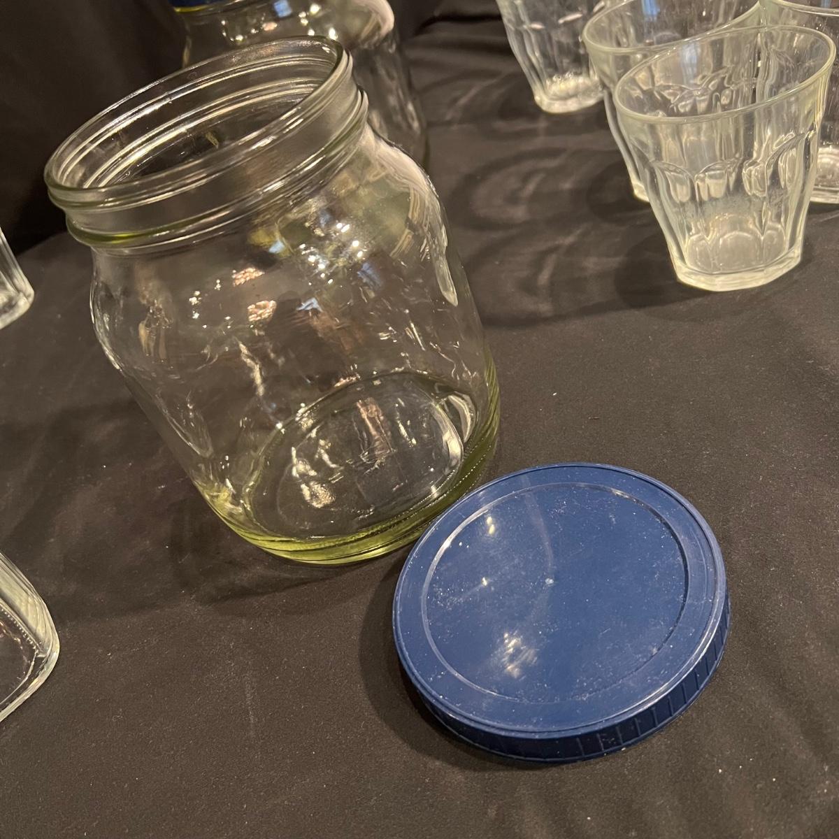 This pair of glass pitchers are stamped 'Bormioli Rocco, made in Italy'. They measure 4” x 4” x 9”H and have blue plastic lids with seals. A pair of glass canisters also have blue plastic lids. The drinking glasses are a set with four different sizes. There are twenty total, largest measures 3.5”D x 5”H.