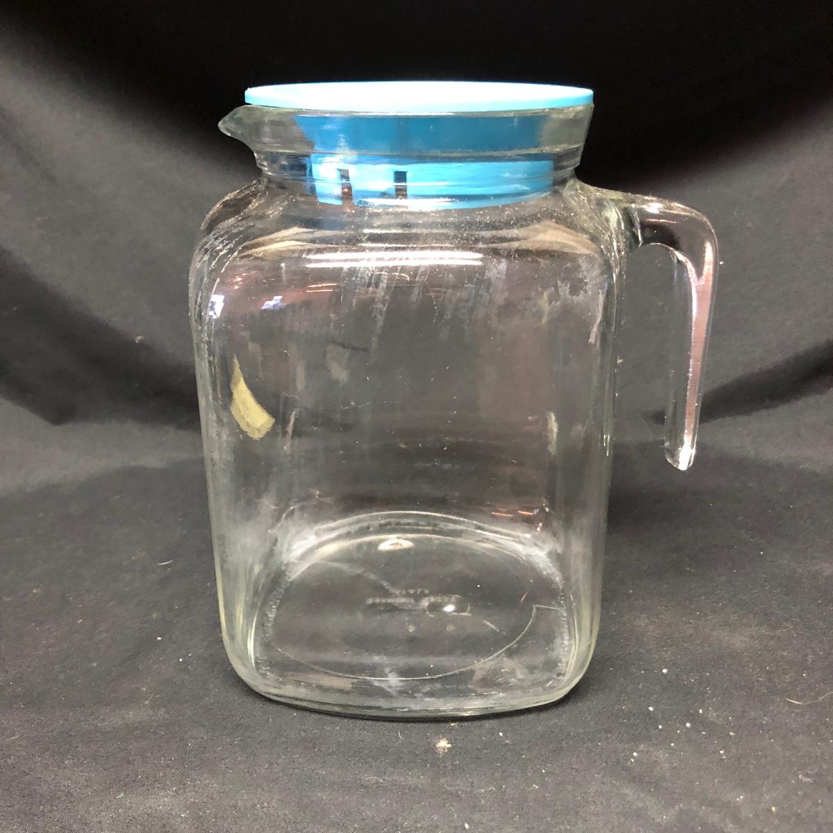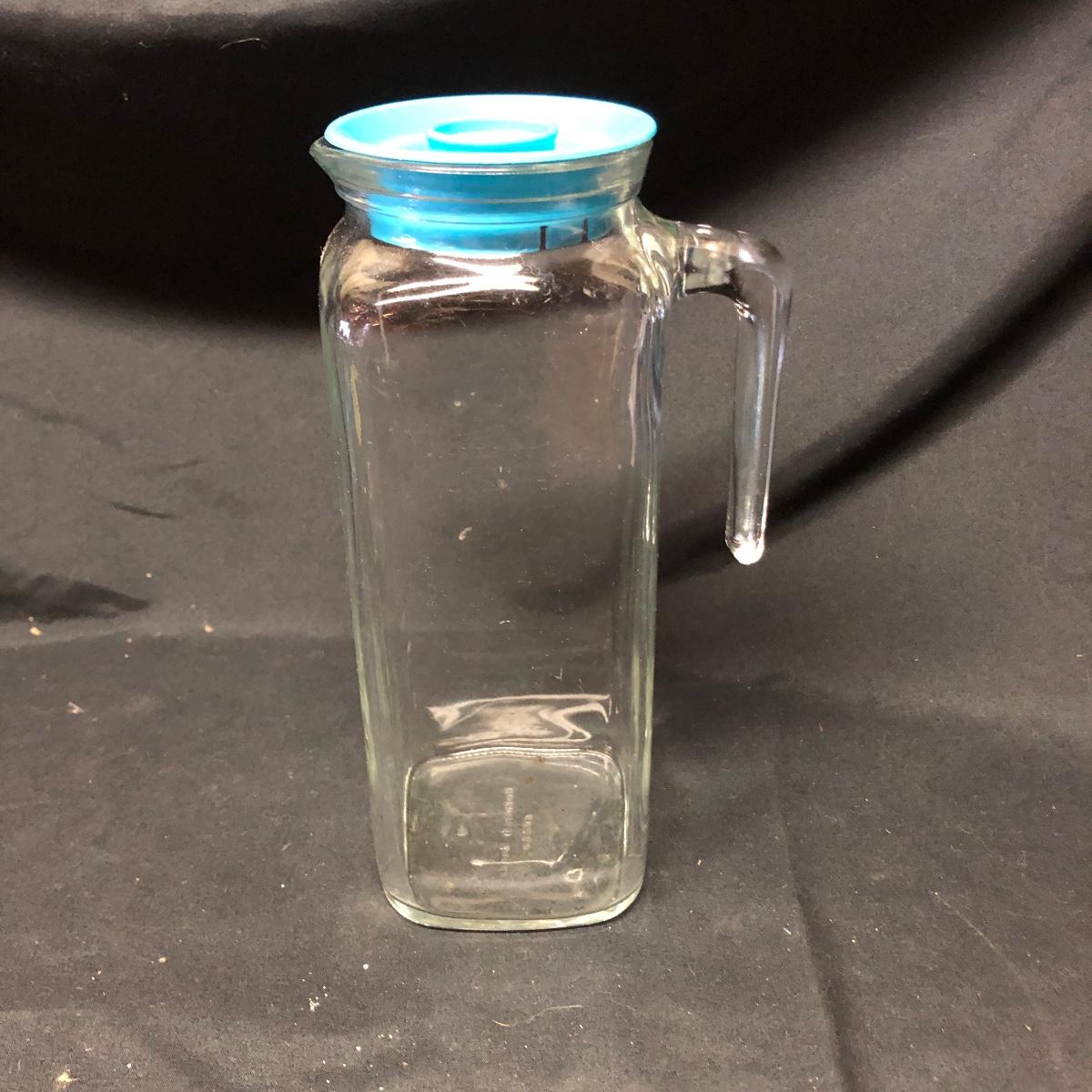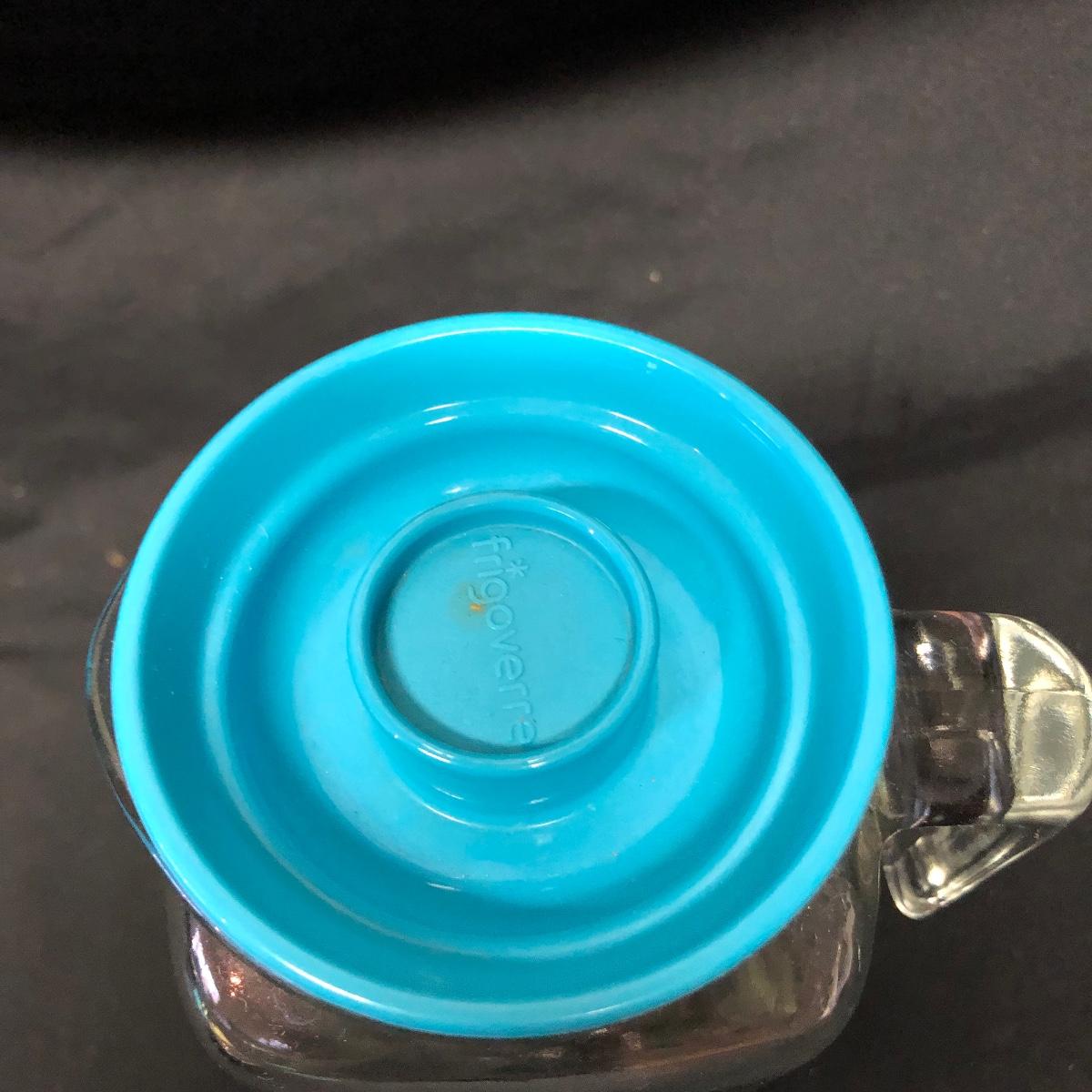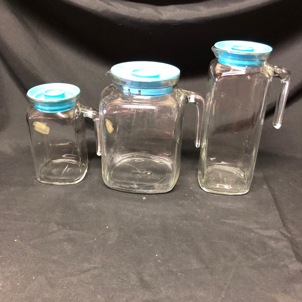 Lot includes three Bormioli Rocco Frigoverre glass pitchers with teal tops. Widest pitcher measures 5” x 5” 7.75”.