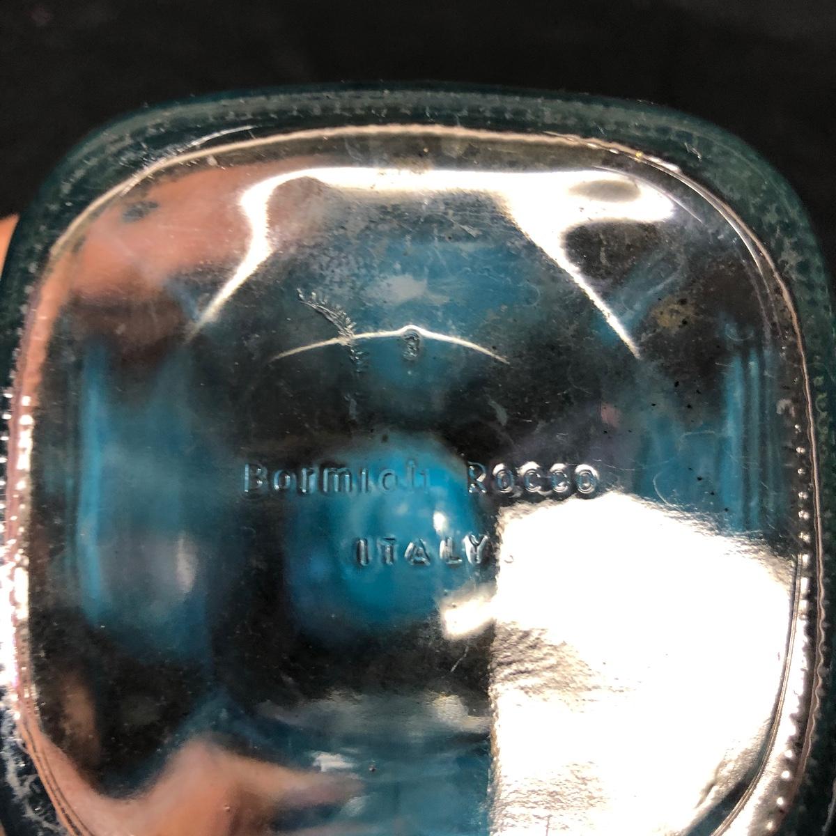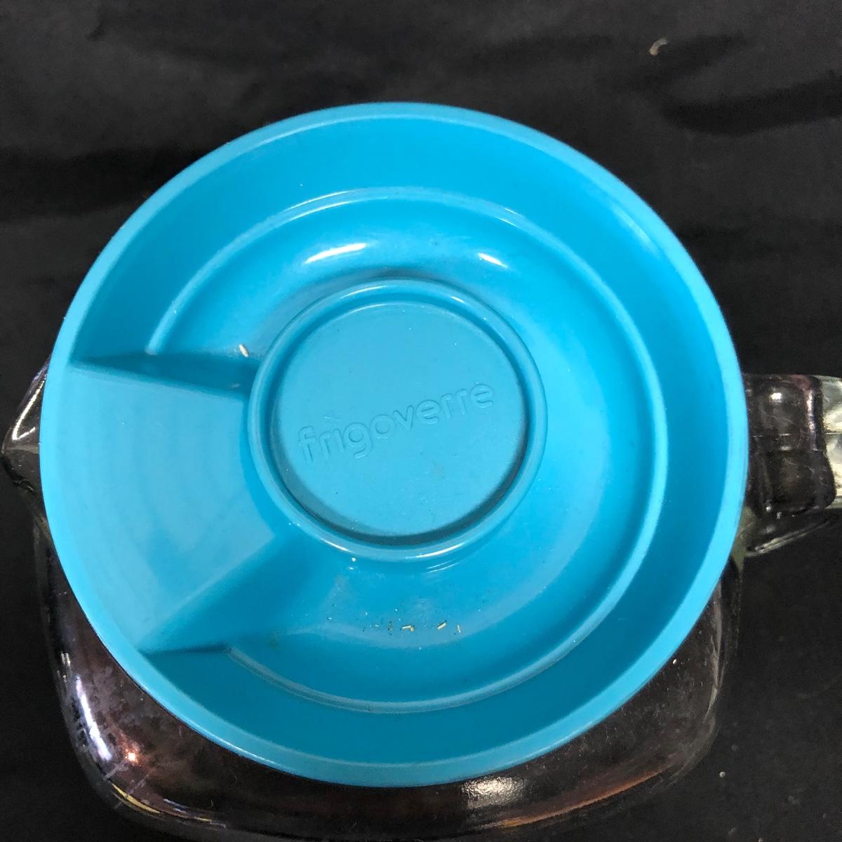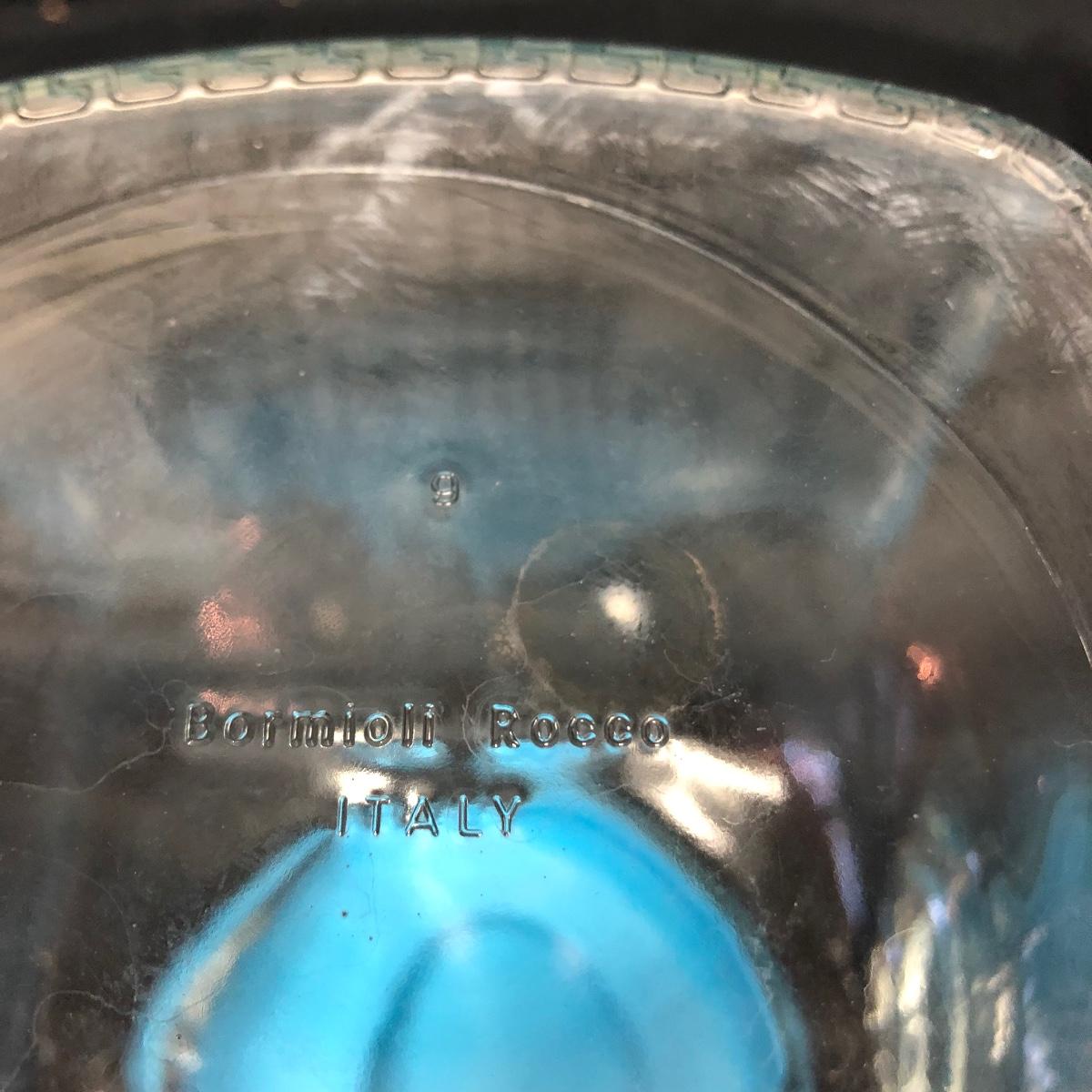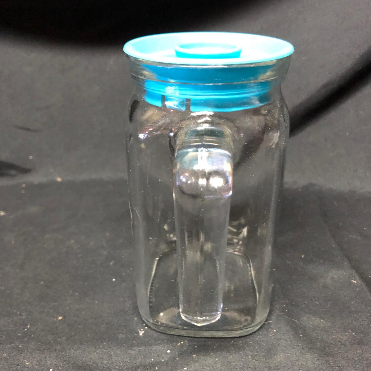 Lot includes three Bormioli Rocco Frigoverre glass pitchers with teal tops. Widest pitcher measures 5” x 5” 7.75”.
