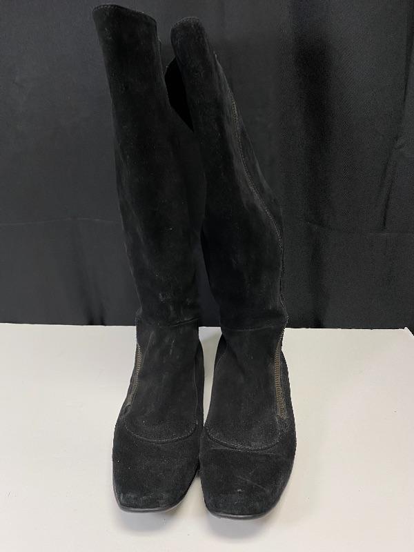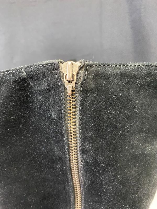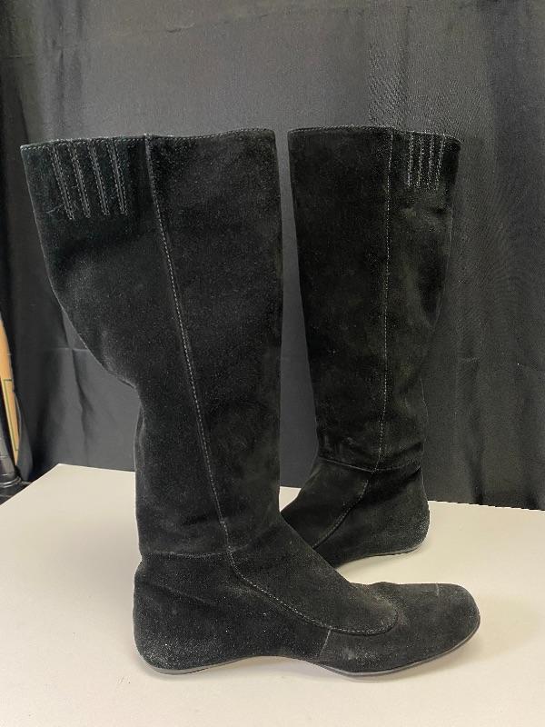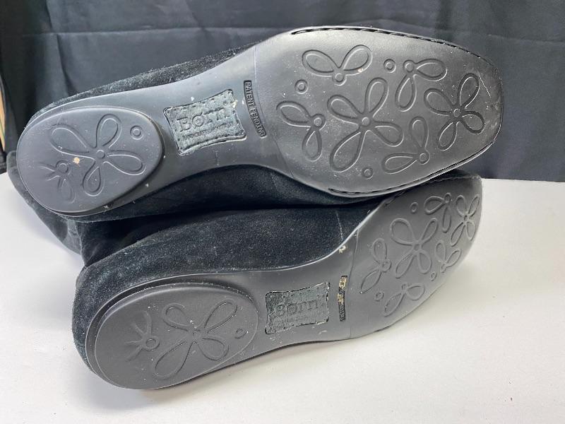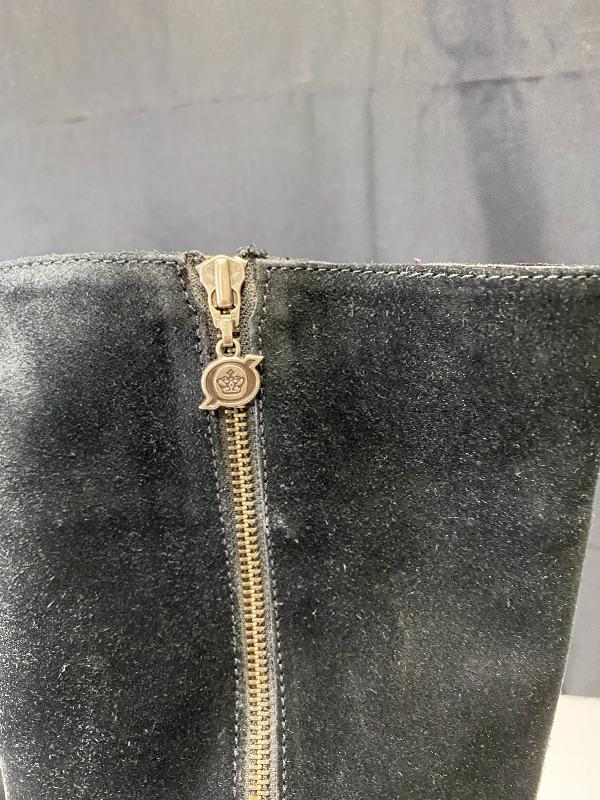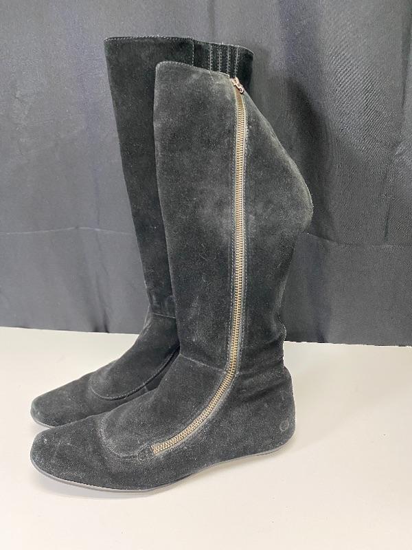 Born brand black suede knee high boots. Zipper on the outside of boot. Have added stretch at calf for comfort. The zipper pull on one is broken making it hard to zip, but zipper works. Soles show wear. Size 8.5.