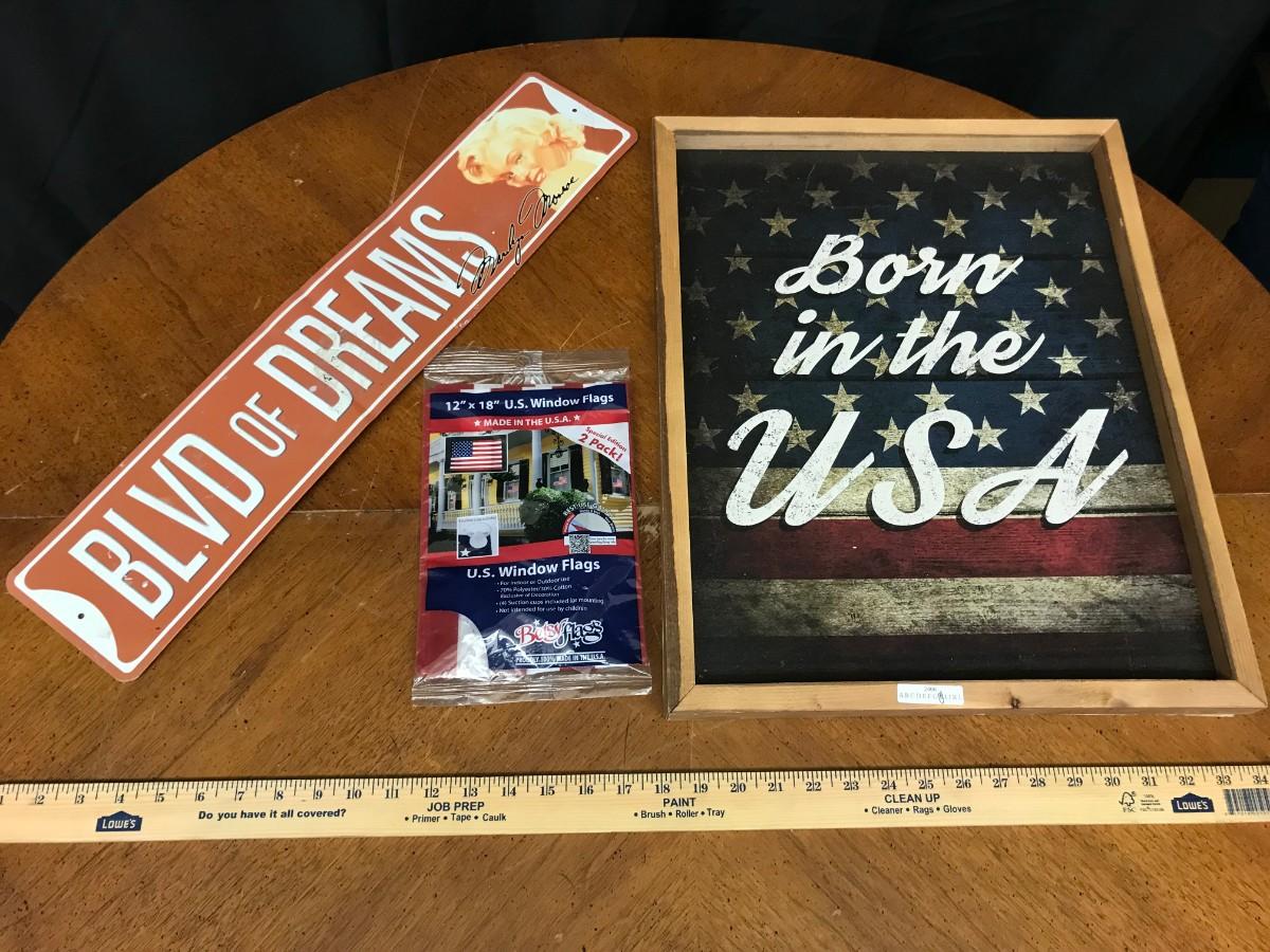 usa decor: born in the USA, flag, signage featuring marilyn monroe;