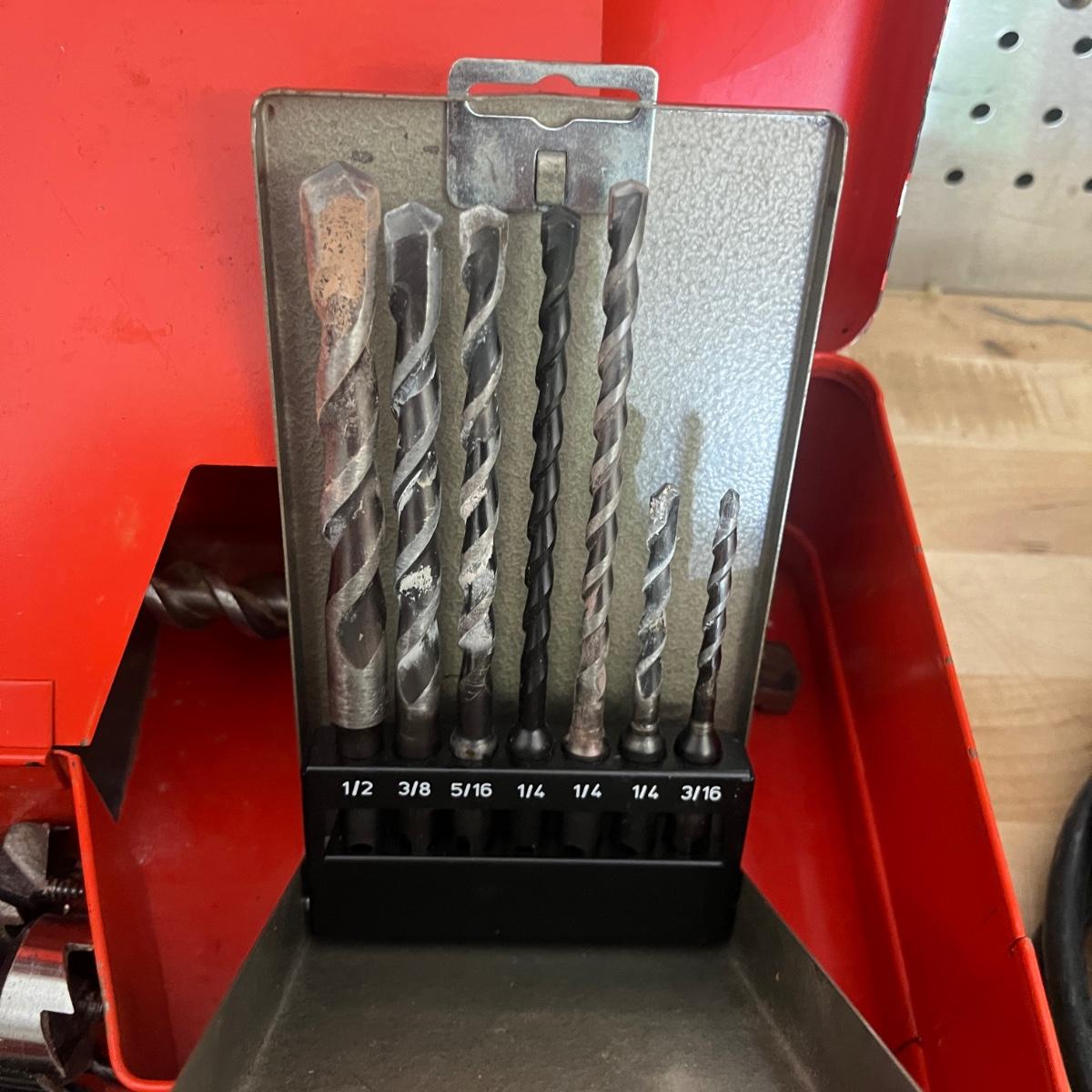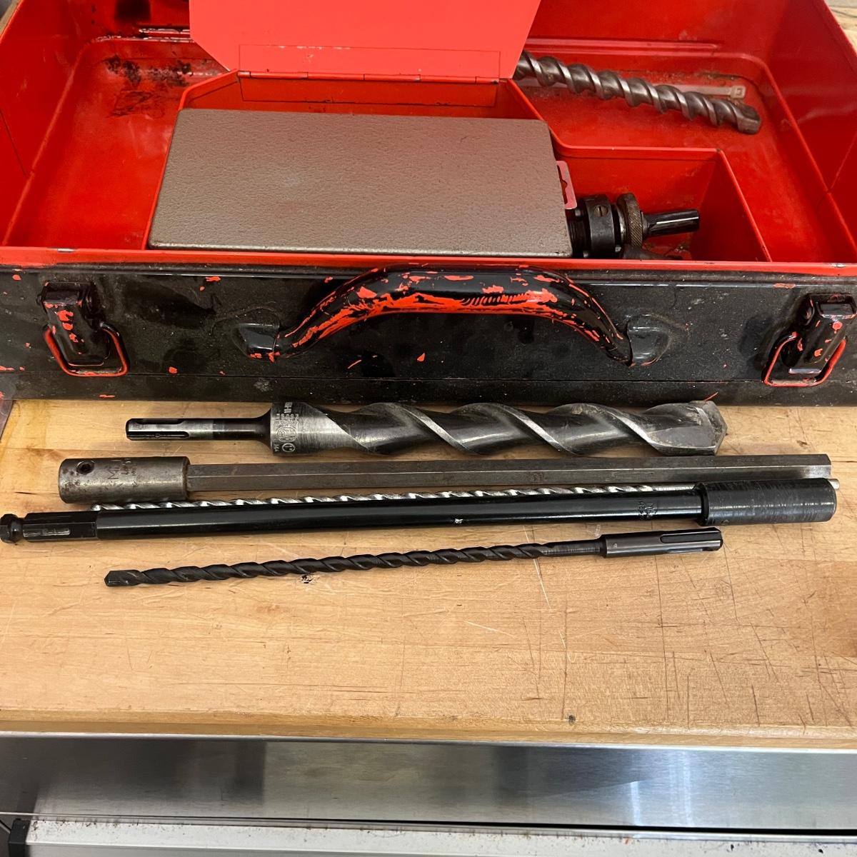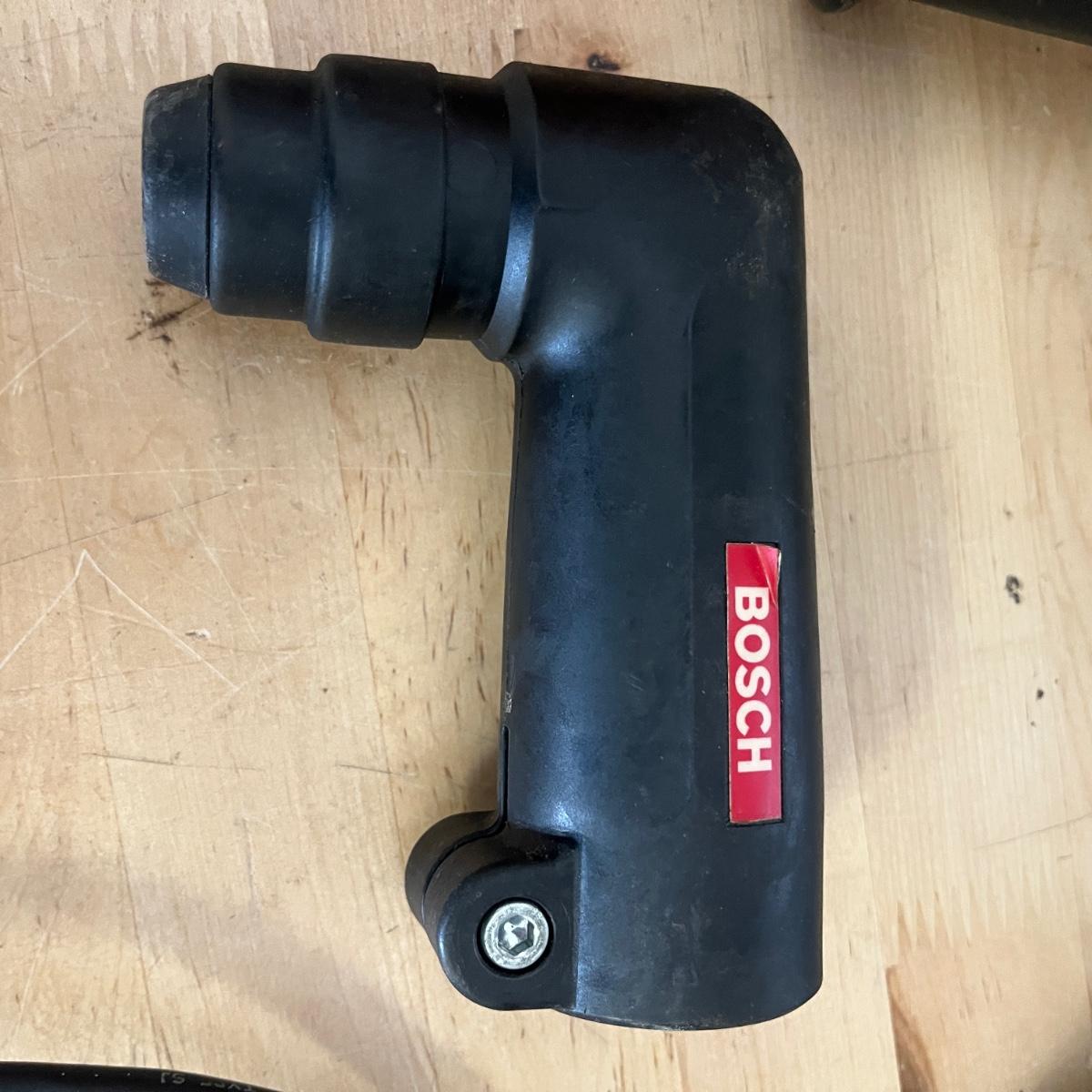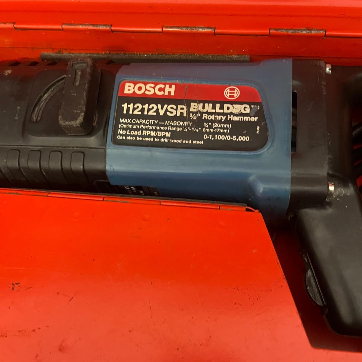Lot includes a Bosch 3/4 rotary hammer drill with metal carrying case. Also includes a collection of large and small drill bits and a 90 degree attachment. Carrying case measures 17” x 11” x 5”H.