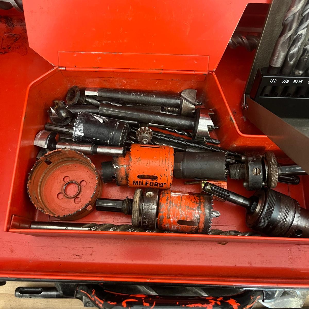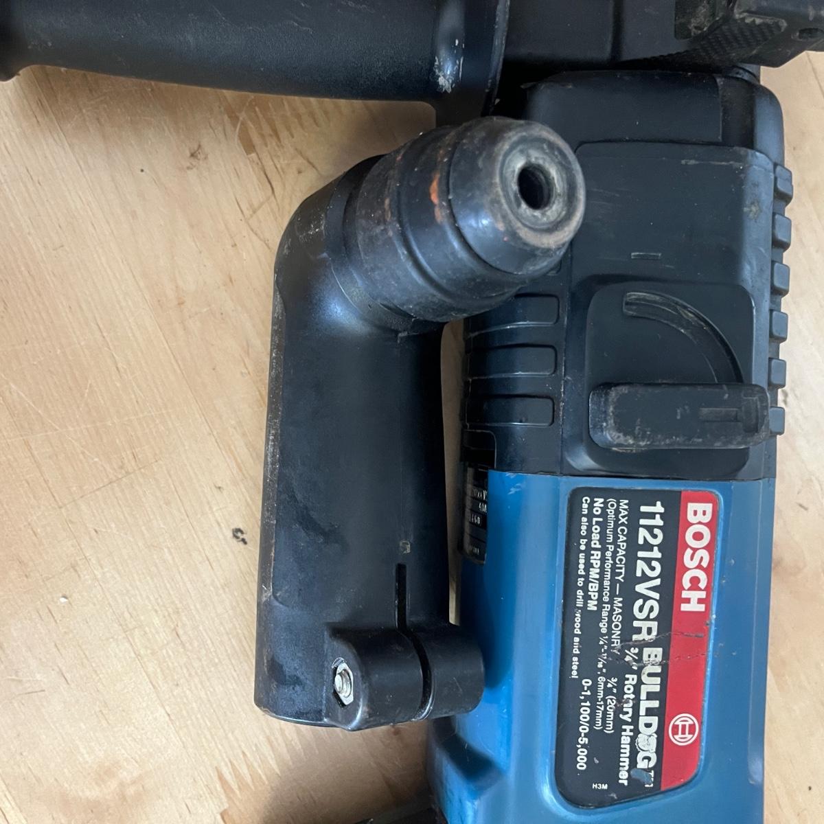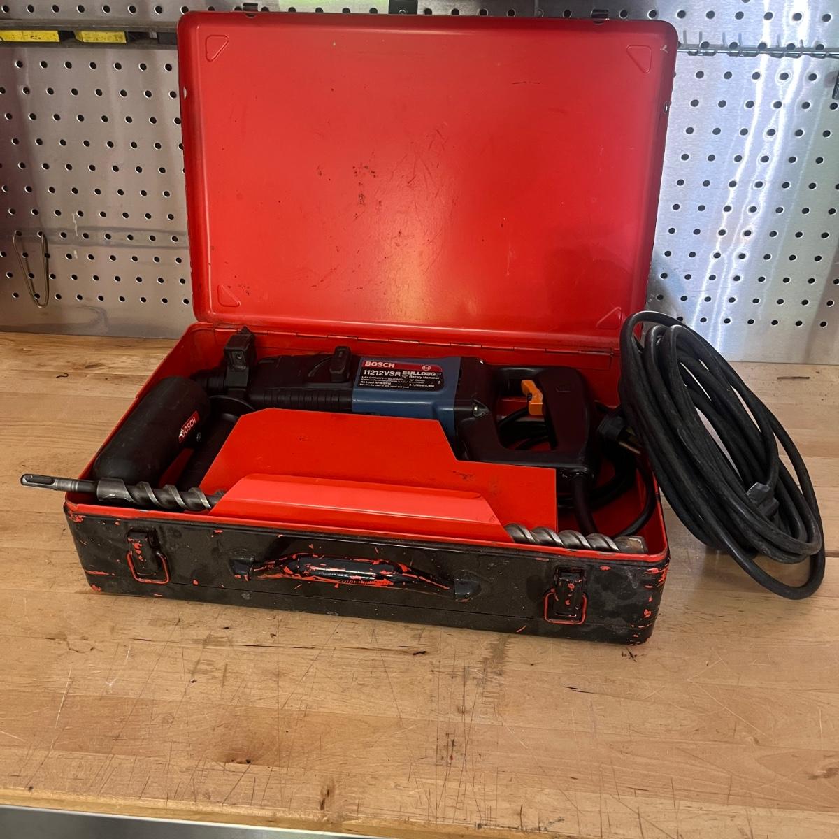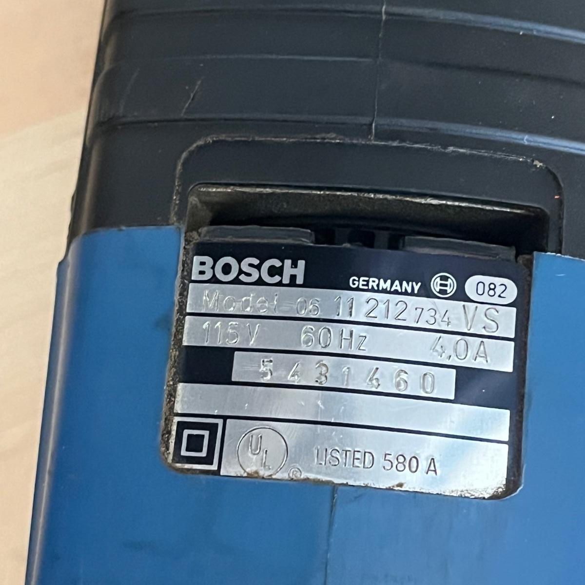 Lot includes a Bosch 3/4 rotary hammer drill with metal carrying case. Also includes a collection of large and small drill bits and a 90 degree attachment. Carrying case measures 17” x 11” x 5”H.