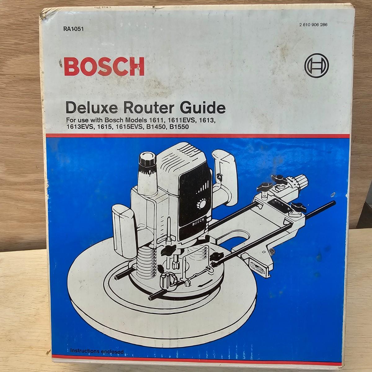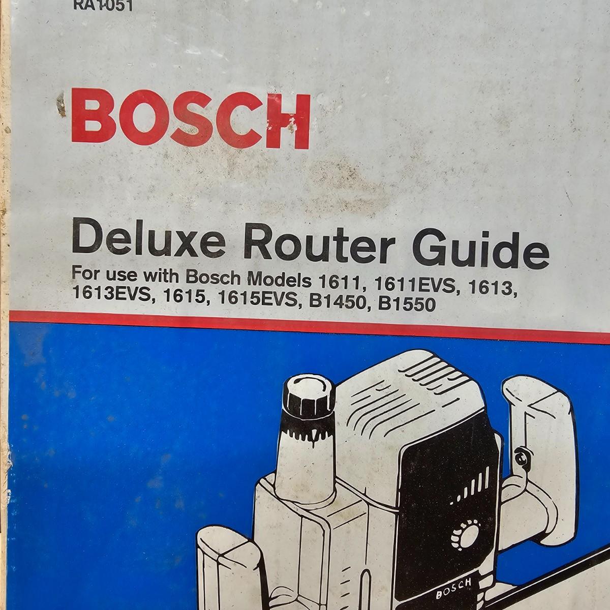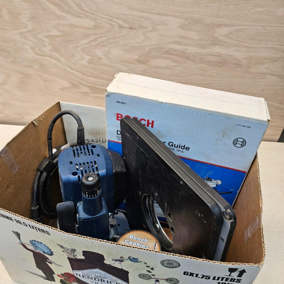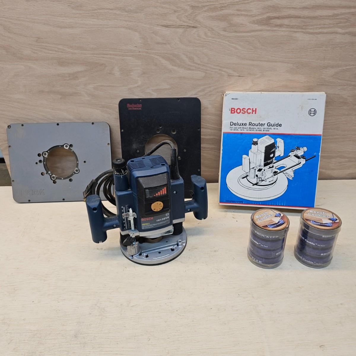 Two handled Bosch Router with three separate guide plates. Router has no case, measures 11.5" x 6" x 9"H, powered on when plugged in. Includes an Incra and a Woodpeckers guide which are mountable to the bottom of the tool. Both items are approximately 11.75" x 9.5". Also a Bosch deluxe router guide in box with instructions. Two tubes of Rockler brand bench cookies to raise and stabilize pieces for work or routing. See photos for details. Shipping available.