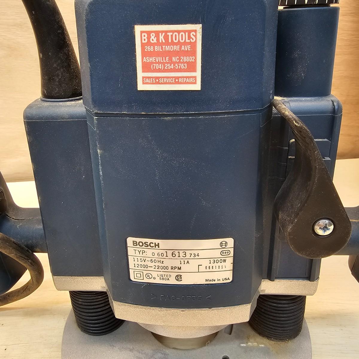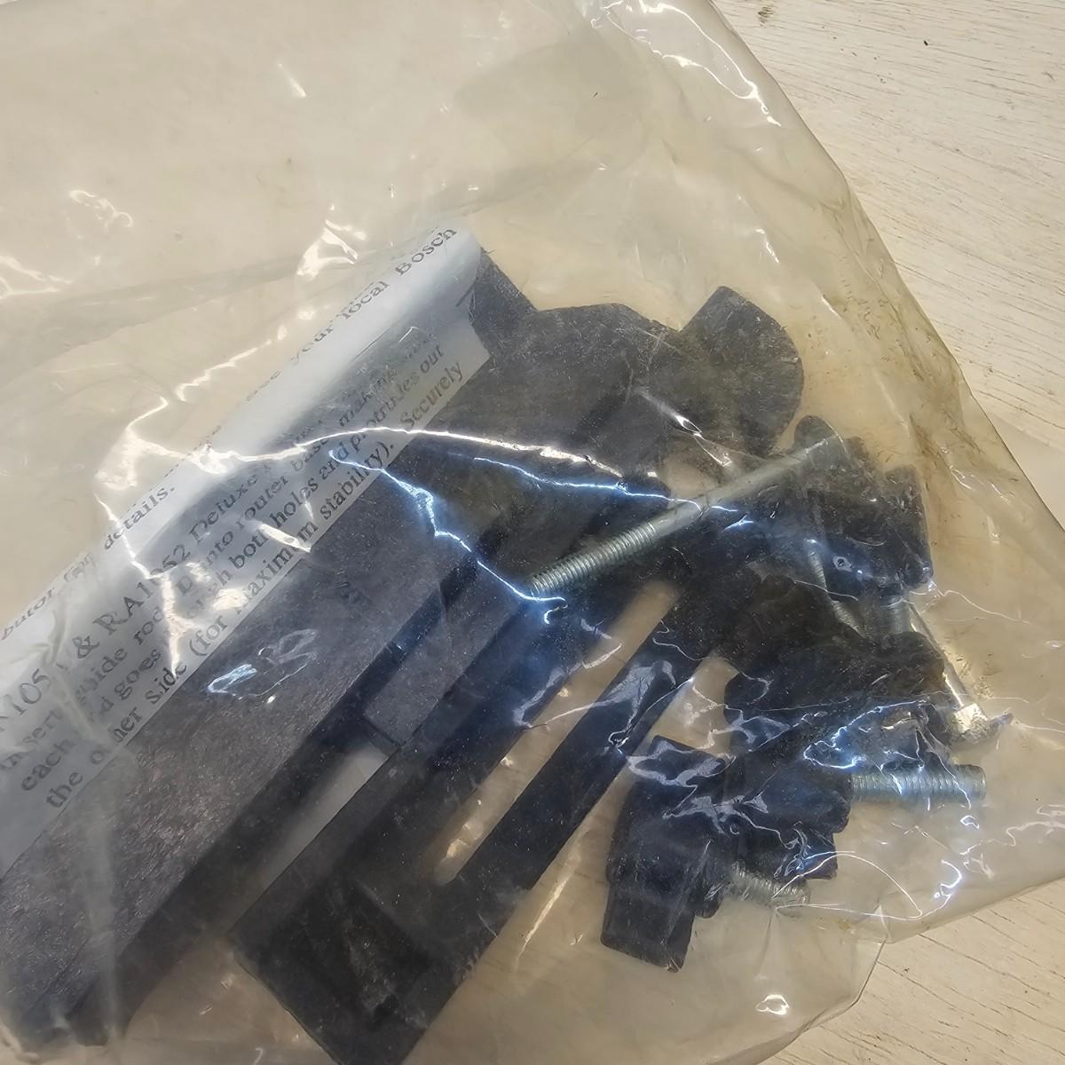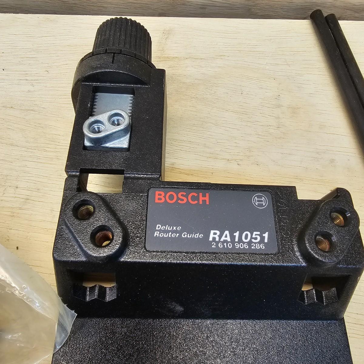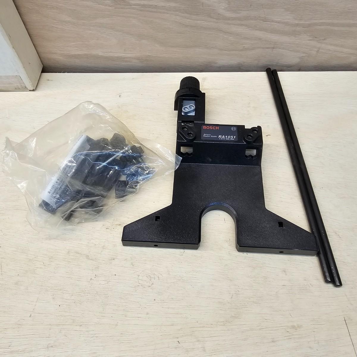 Two handled Bosch Router with three separate guide plates. Router has no case, measures 11.5" x 6" x 9"H, powered on when plugged in. Includes an Incra and a Woodpeckers guide which are mountable to the bottom of the tool. Both items are approximately 11.75" x 9.5". Also a Bosch deluxe router guide in box with instructions. Two tubes of Rockler brand bench cookies to raise and stabilize pieces for work or routing. See photos for details. Shipping available.