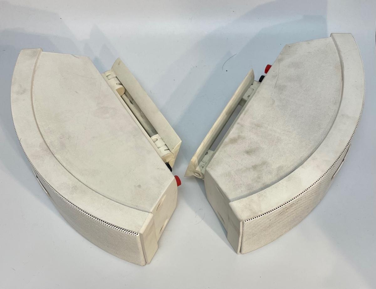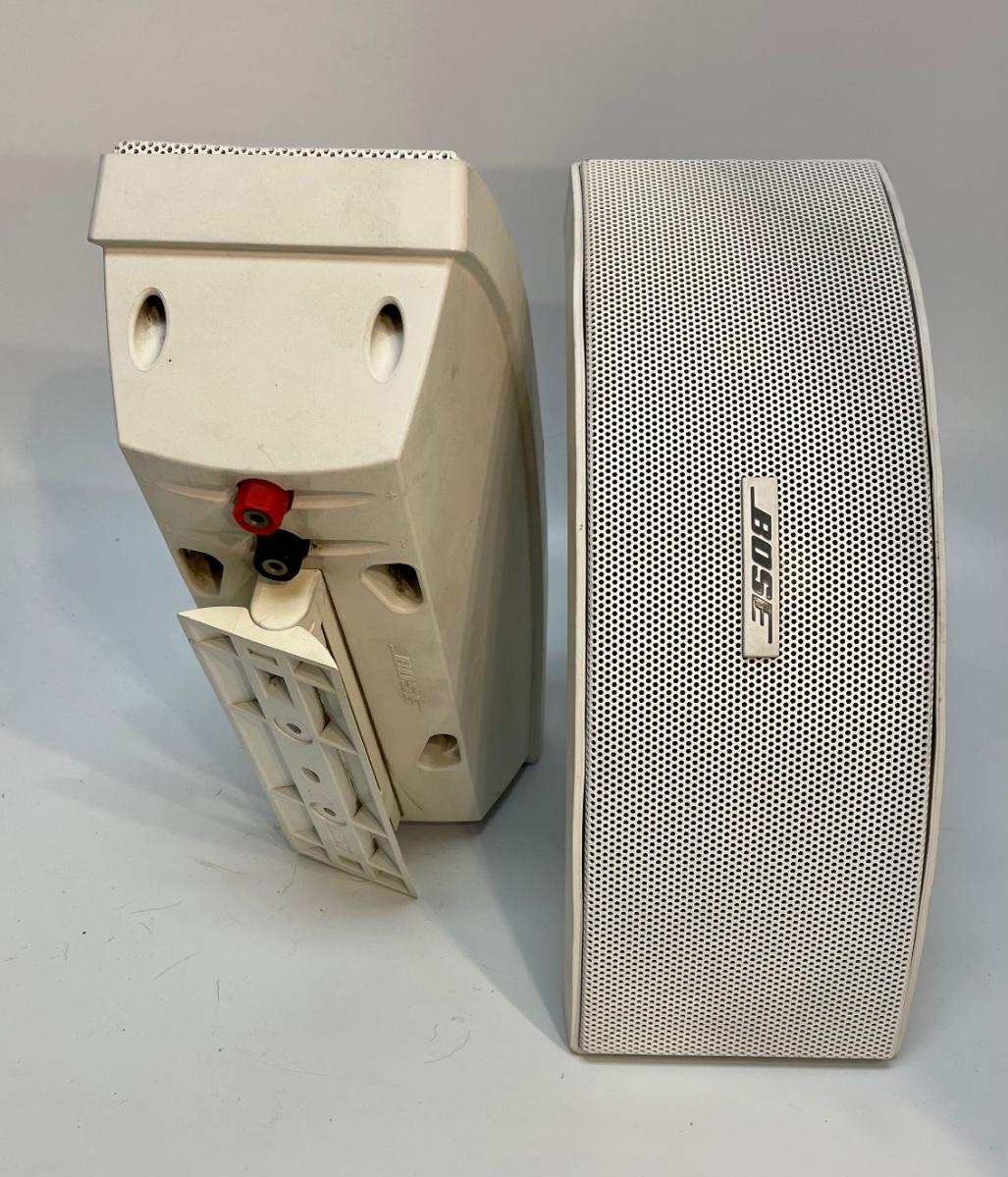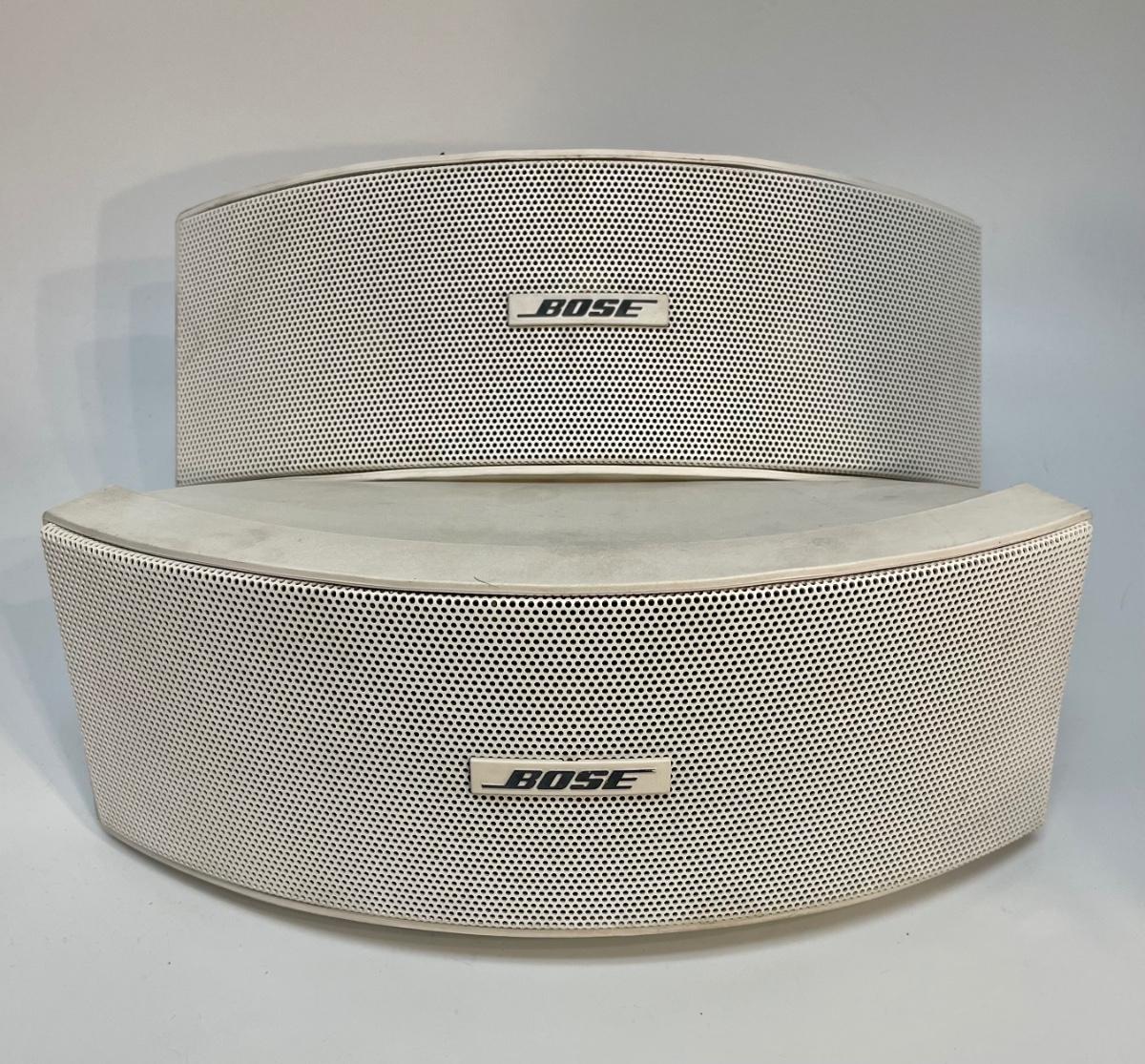 Pair of used Bose Indoor-outdoor speakers. Some dirt marks. Includes mounting brackets. Approx 12” wide, 5” tall and 7” deep.