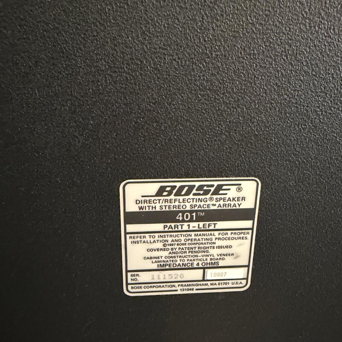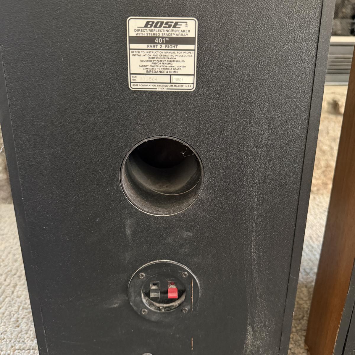 This pair of Bose 401 speakers includes one left and one right speaker. Speakers measure 11” x 11” x 30”H. Speakers were not tested.