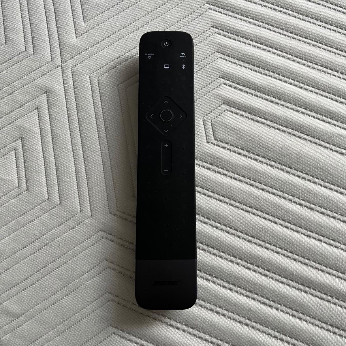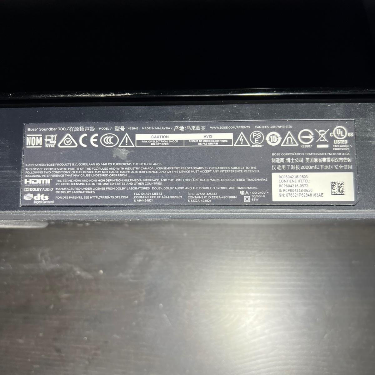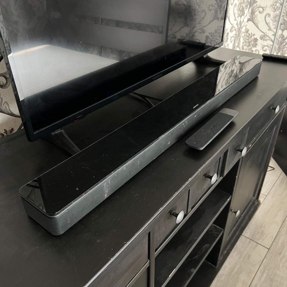 This Bose 700 soundbar measures 38” x 3” x 2”H. Soundbar powered on when plugged in. See image for model number. Also includes remote. TV in background is available in another lot in this sale.