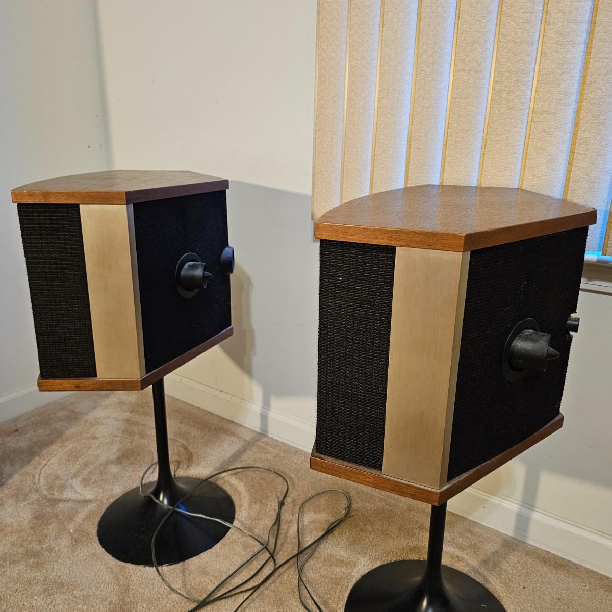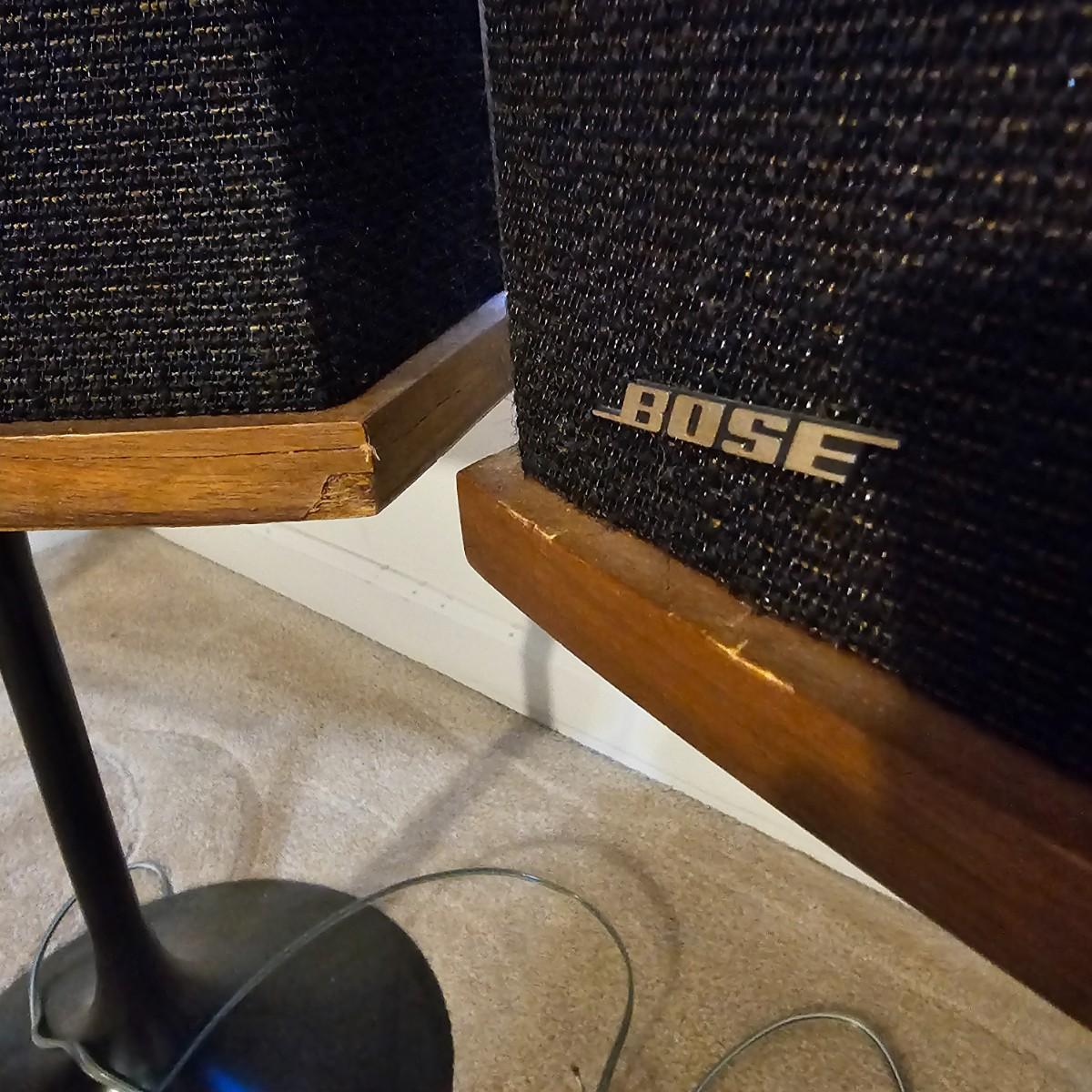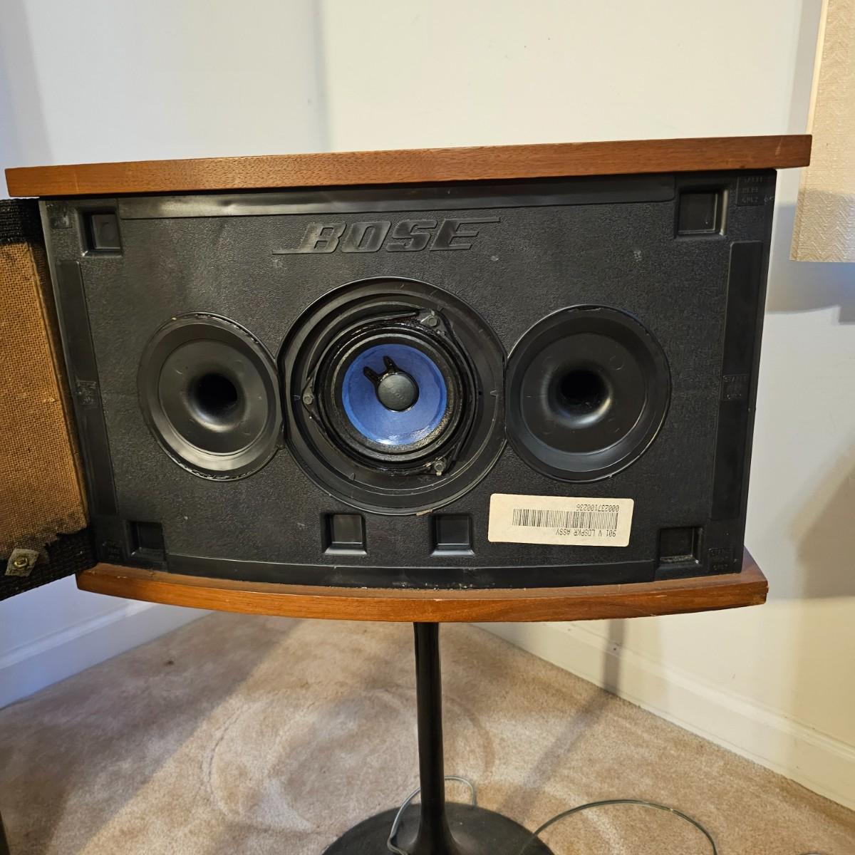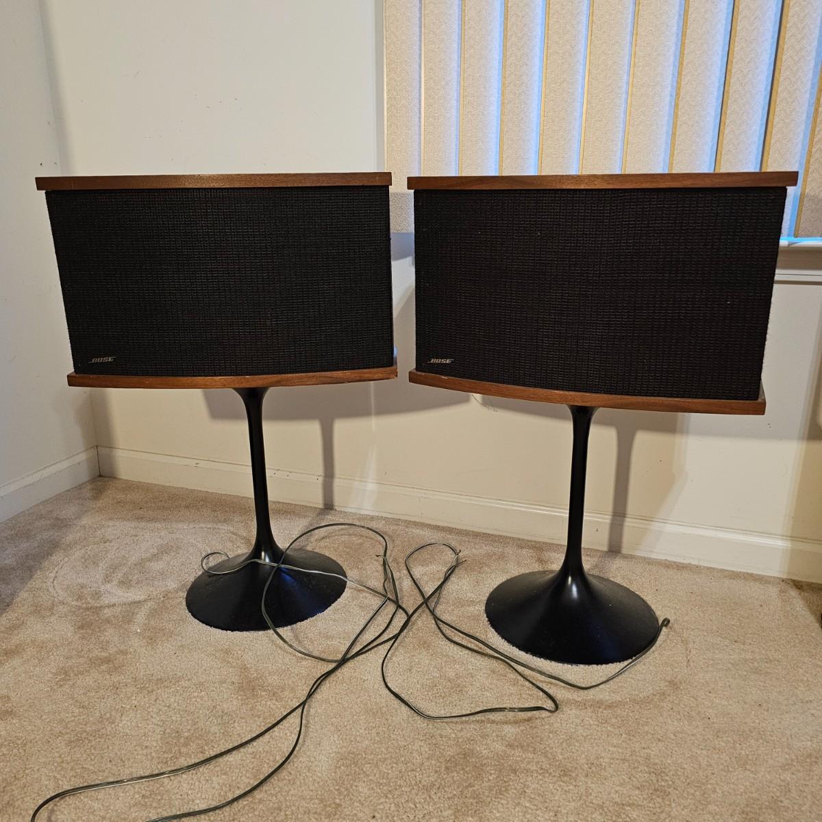 One pair woodtone Bose 901 speakers on pedestal stands. Series V direct reflecting technology. Each speaker measures 21" x 13" x 30"H, has attached wire for connection to equipment. Small nicks in back of one unit and along front of one. One speaker missing cone trim ring on middle back. Speakers are untested. See photos for details. Local pickup only.