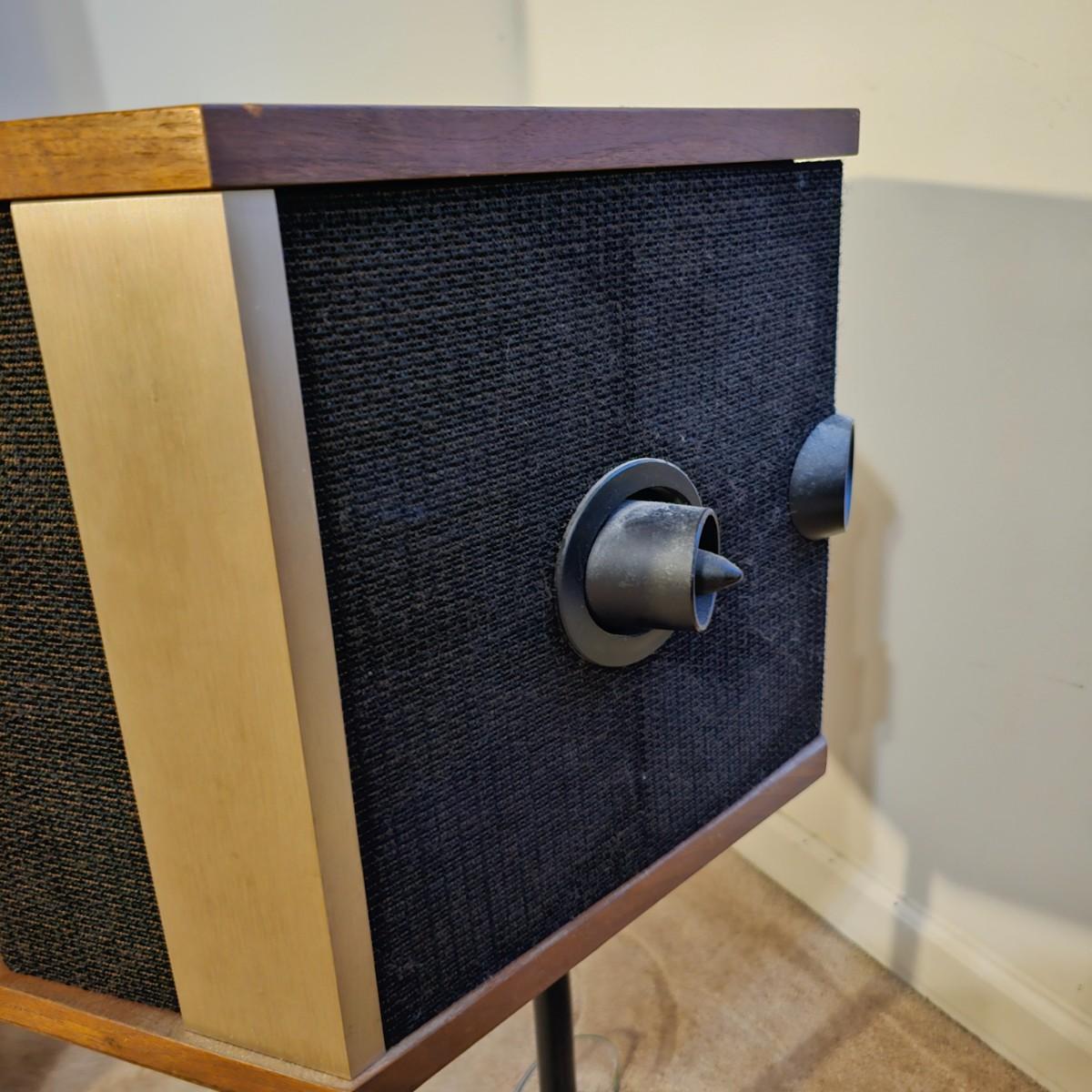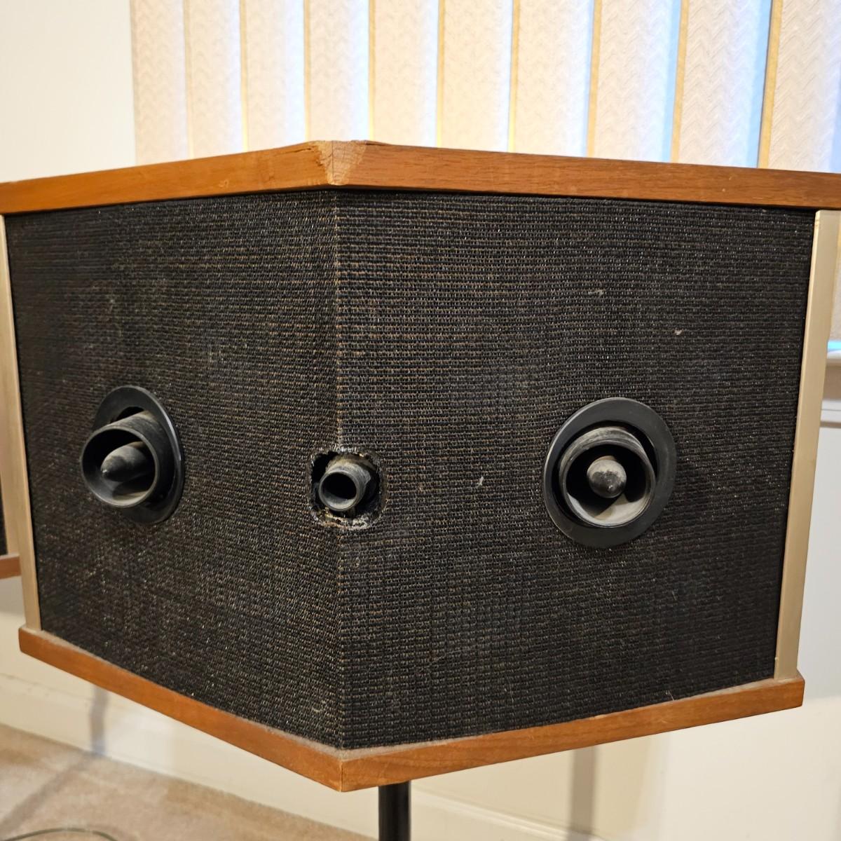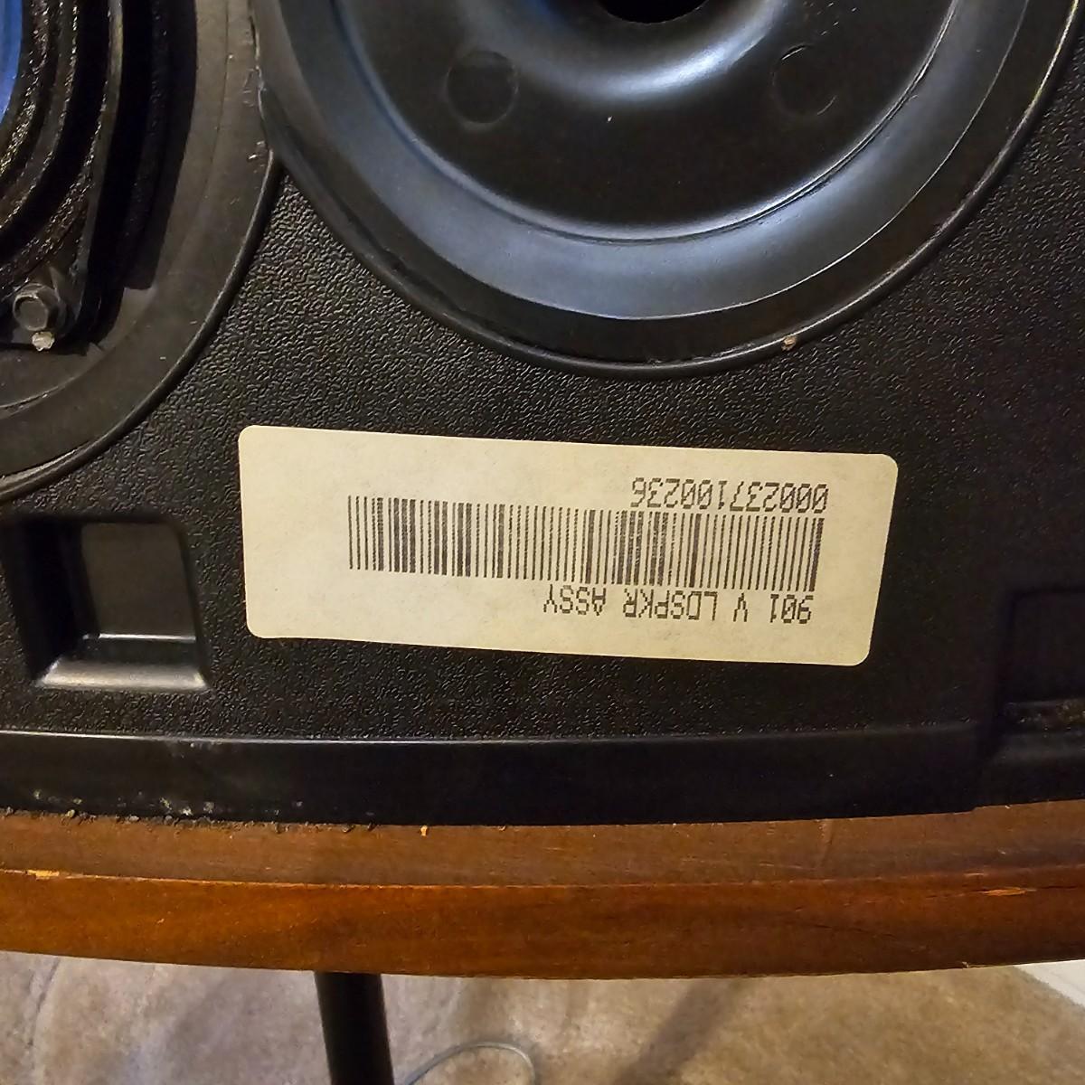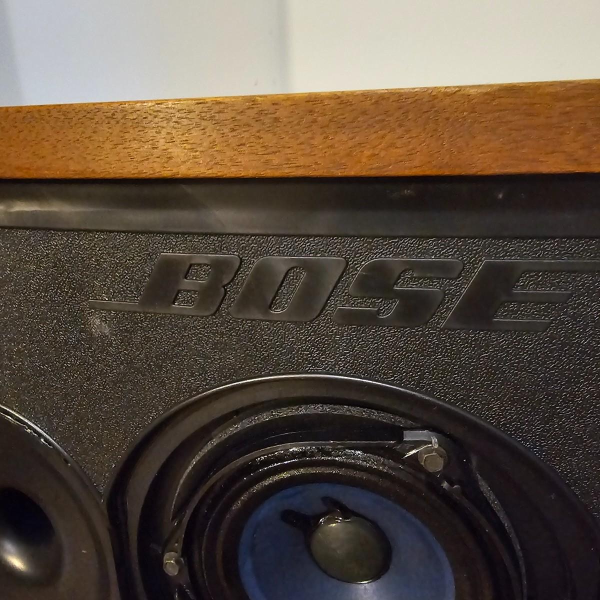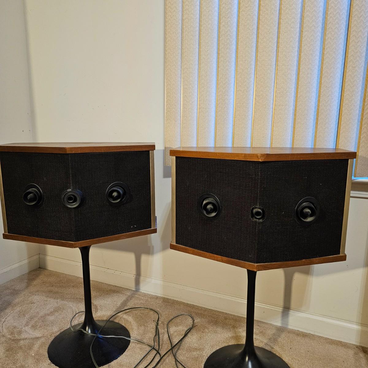 One pair woodtone Bose 901 speakers on pedestal stands. Series V direct reflecting technology. Each speaker measures 21" x 13" x 30"H, has attached wire for connection to equipment. Small nicks in back of one unit and along front of one. One speaker missing cone trim ring on middle back. Speakers are untested. See photos for details. Local pickup only.