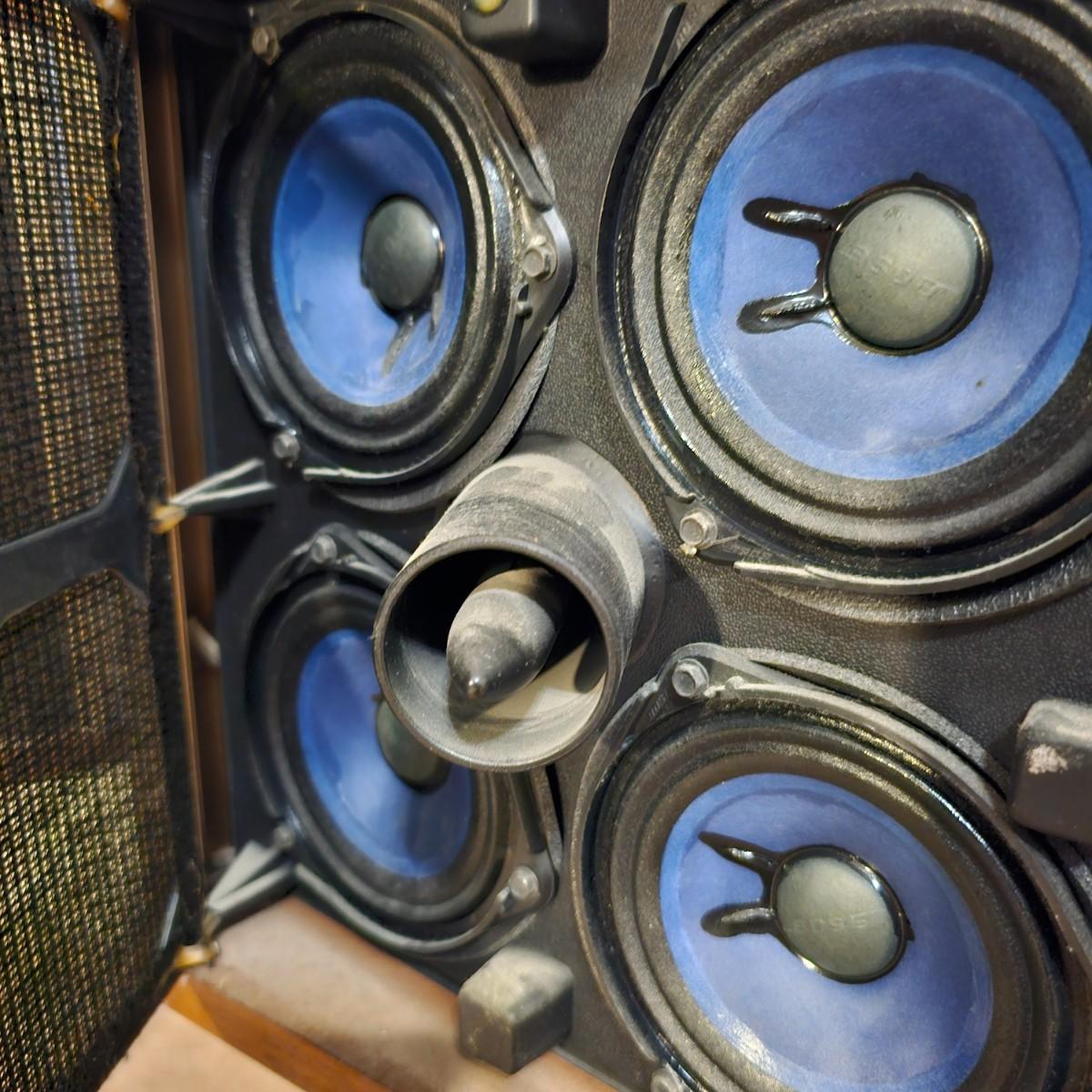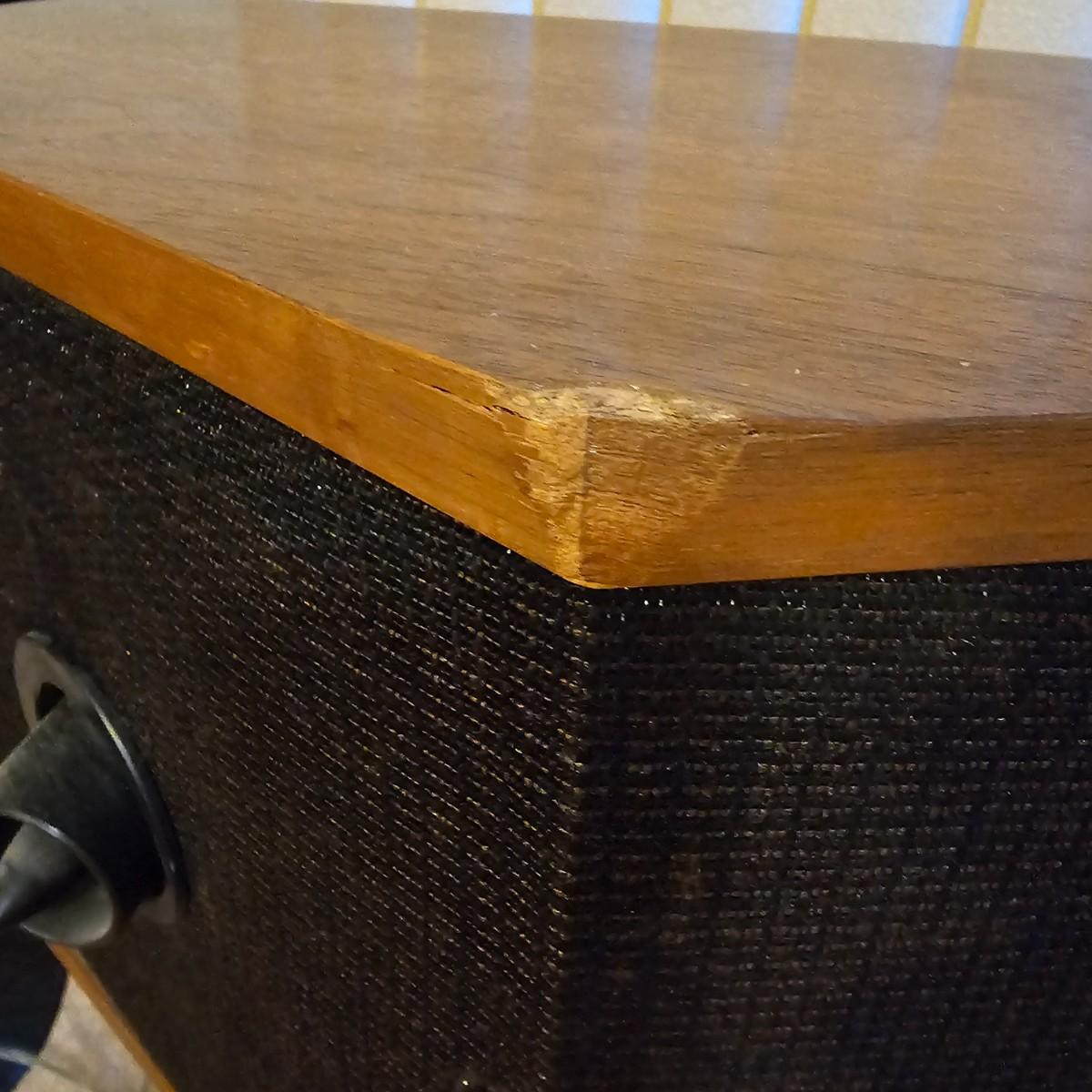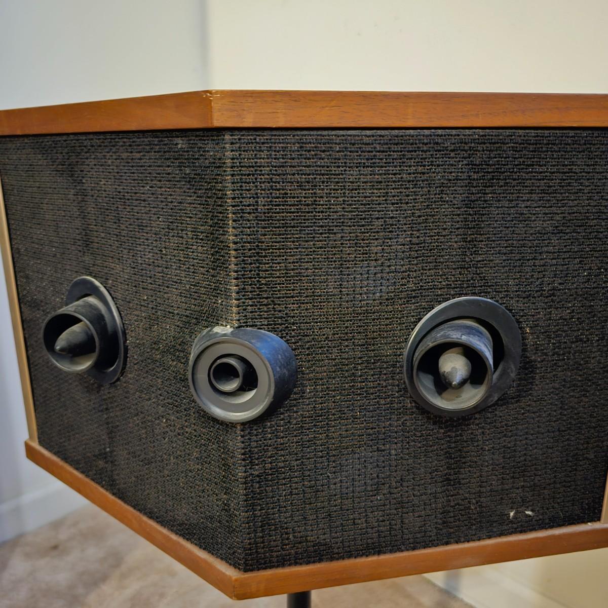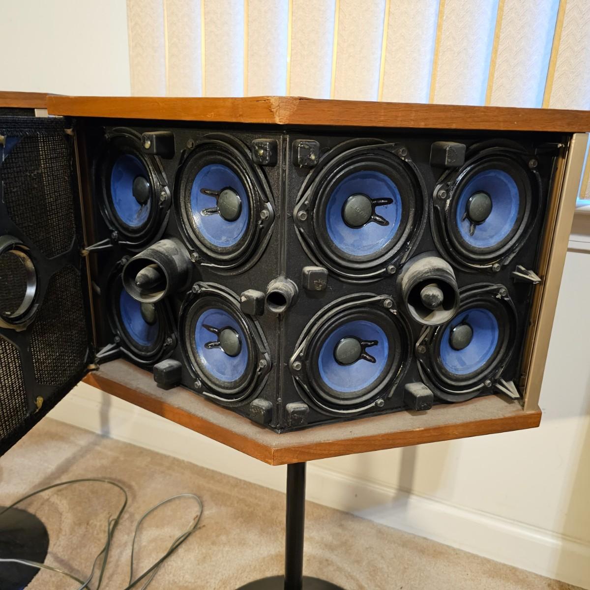 One pair woodtone Bose 901 speakers on pedestal stands. Series V direct reflecting technology. Each speaker measures 21" x 13" x 30"H, has attached wire for connection to equipment. Small nicks in back of one unit and along front of one. One speaker missing cone trim ring on middle back. Speakers are untested. See photos for details. Local pickup only.
