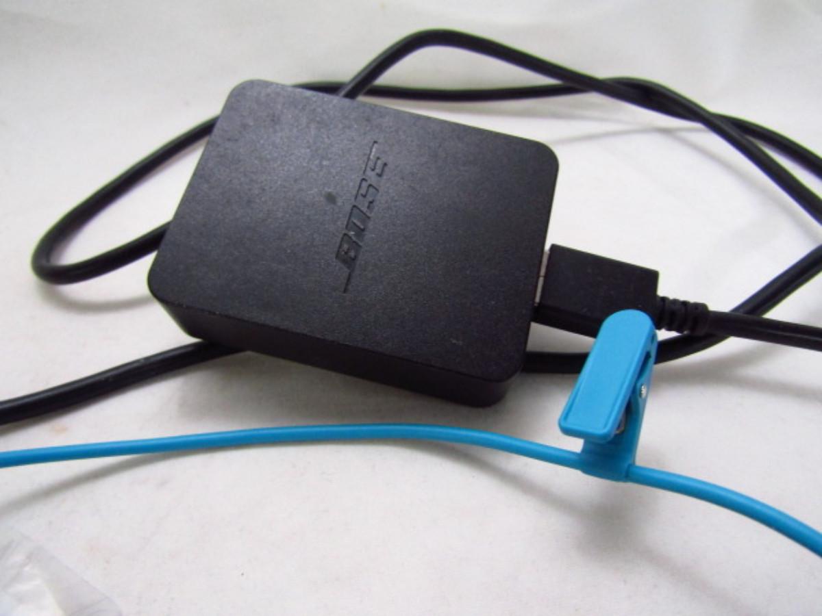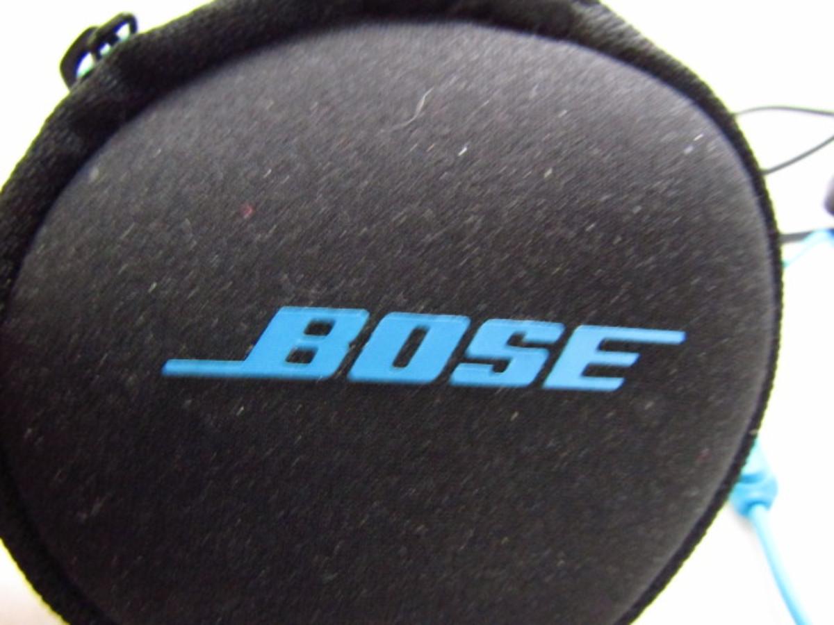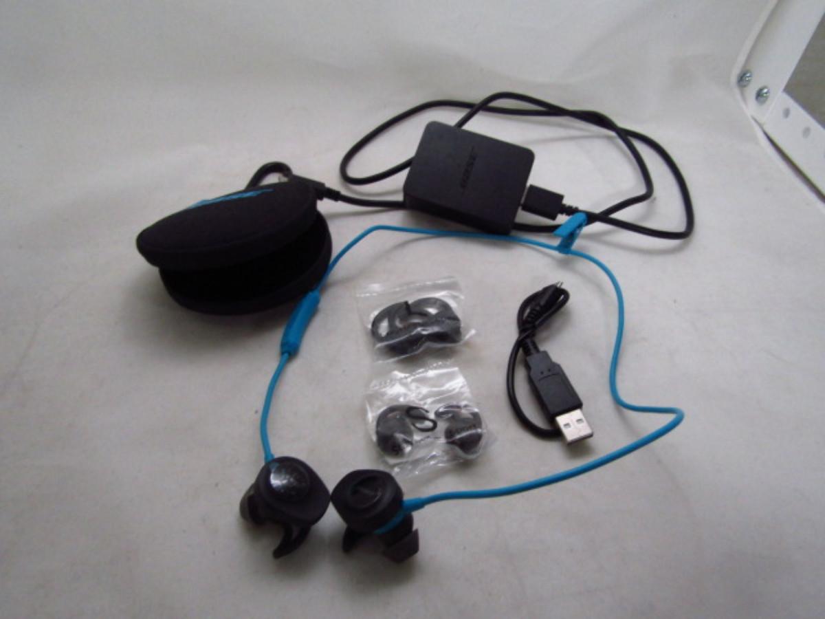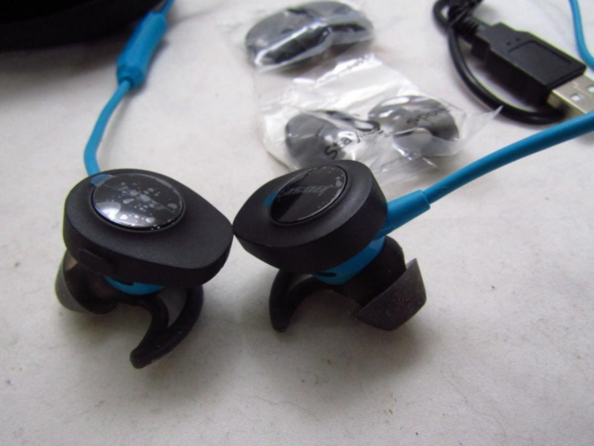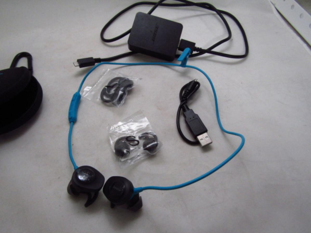 Bose SoundSport In-Ear Headphones. Have been charged and work well. Carrying case, additional ear tips, long and short charging cables are included.