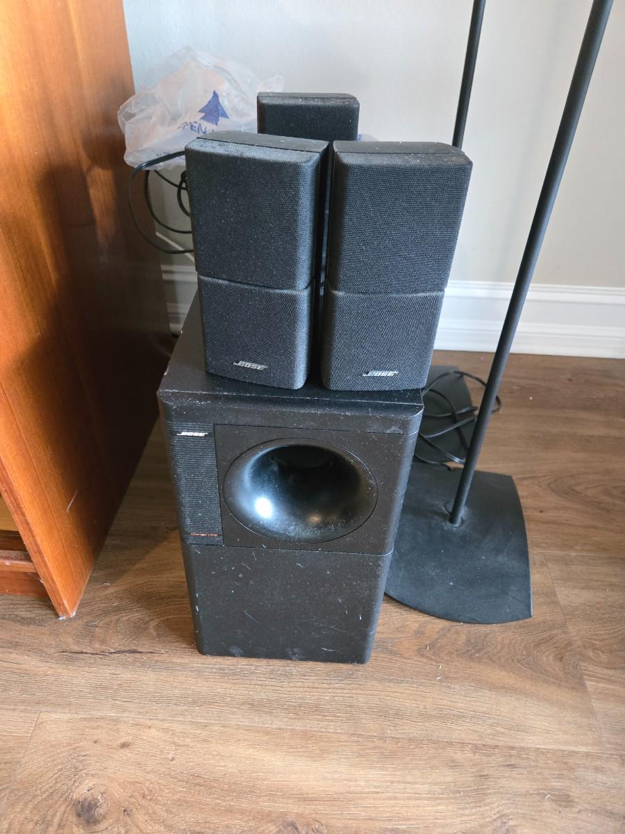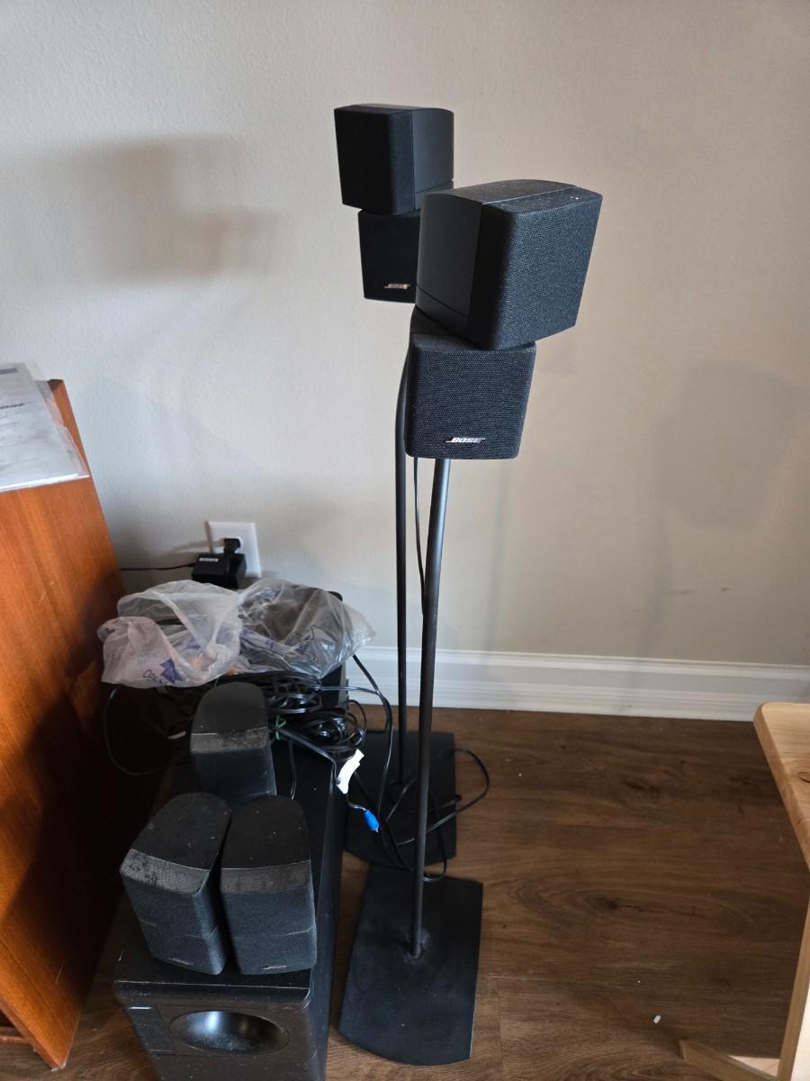 Speakers, Stands, superwoofer, cords, books and set up manuals