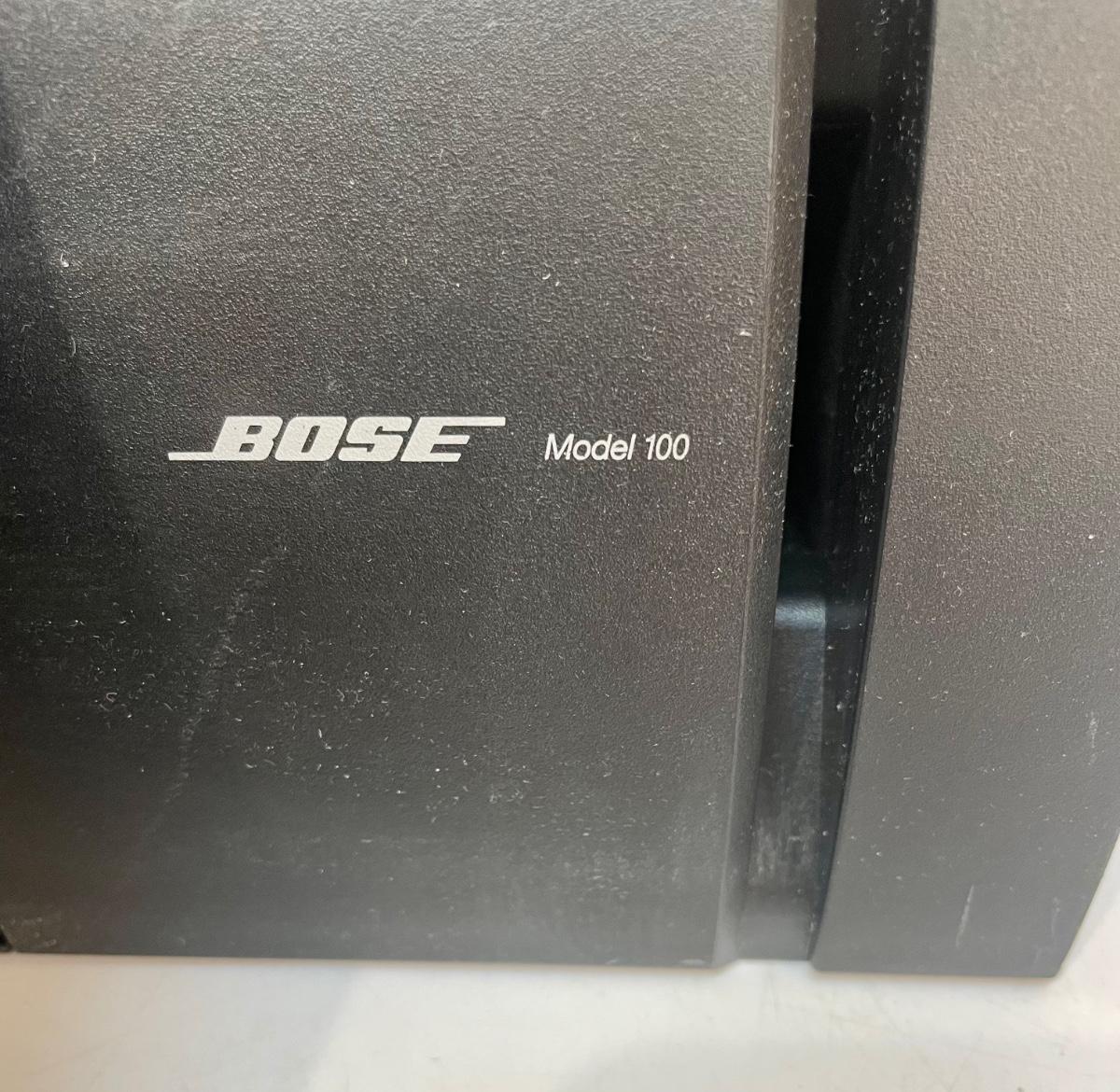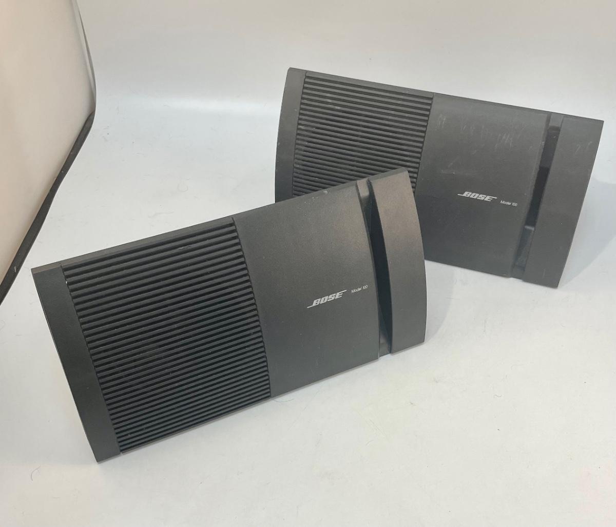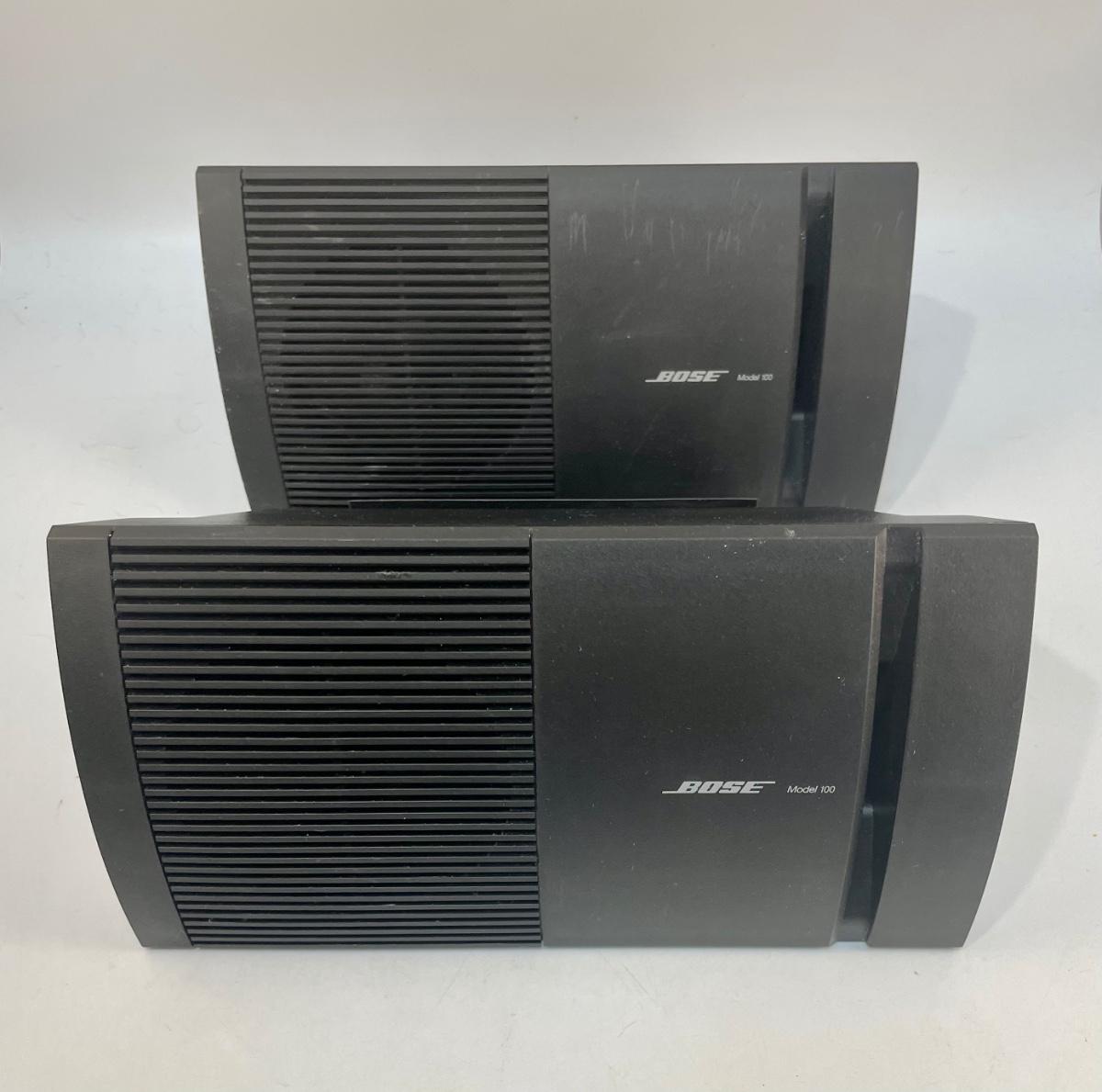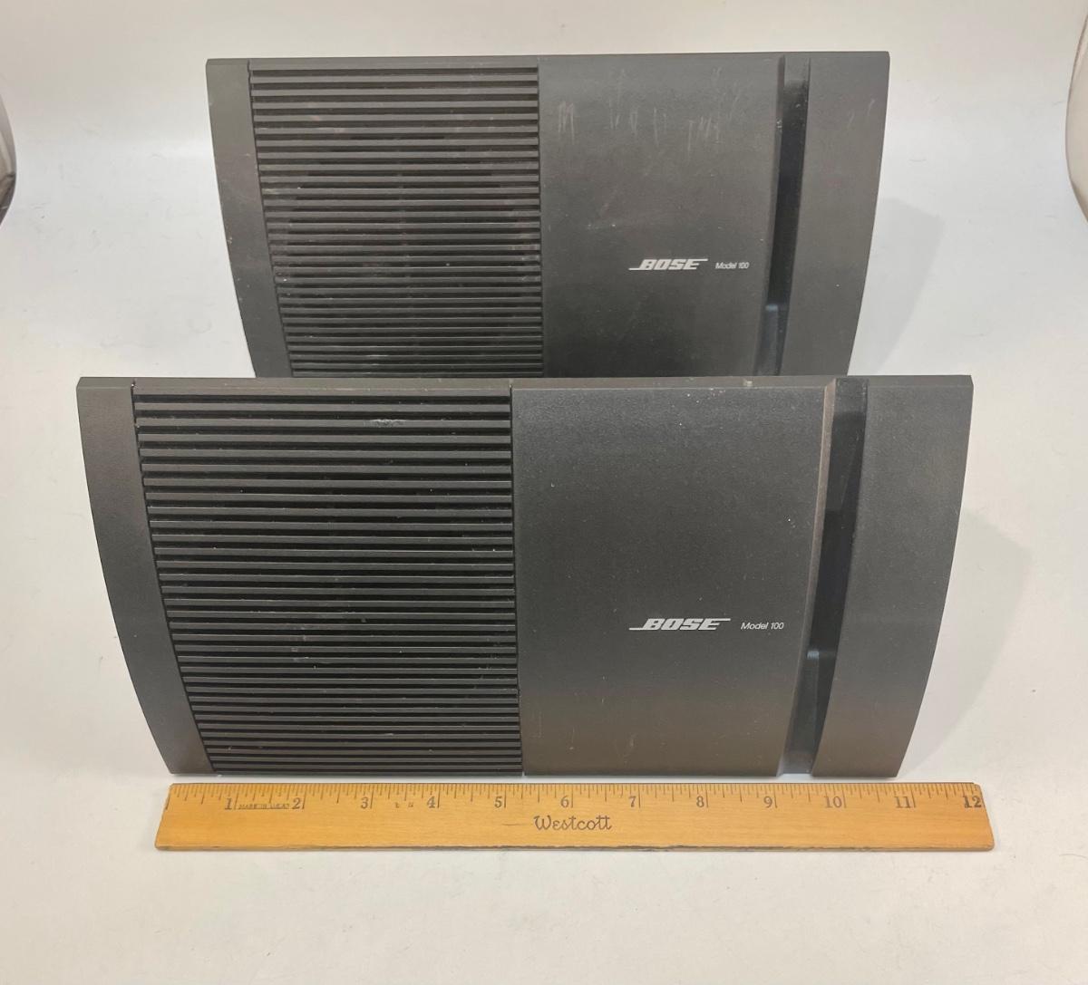 Pair of used Bose Model 100 Surround Speakers in Black. Some Wear and Tear, minor scratches and scuff marks. Includes mounting brackets.