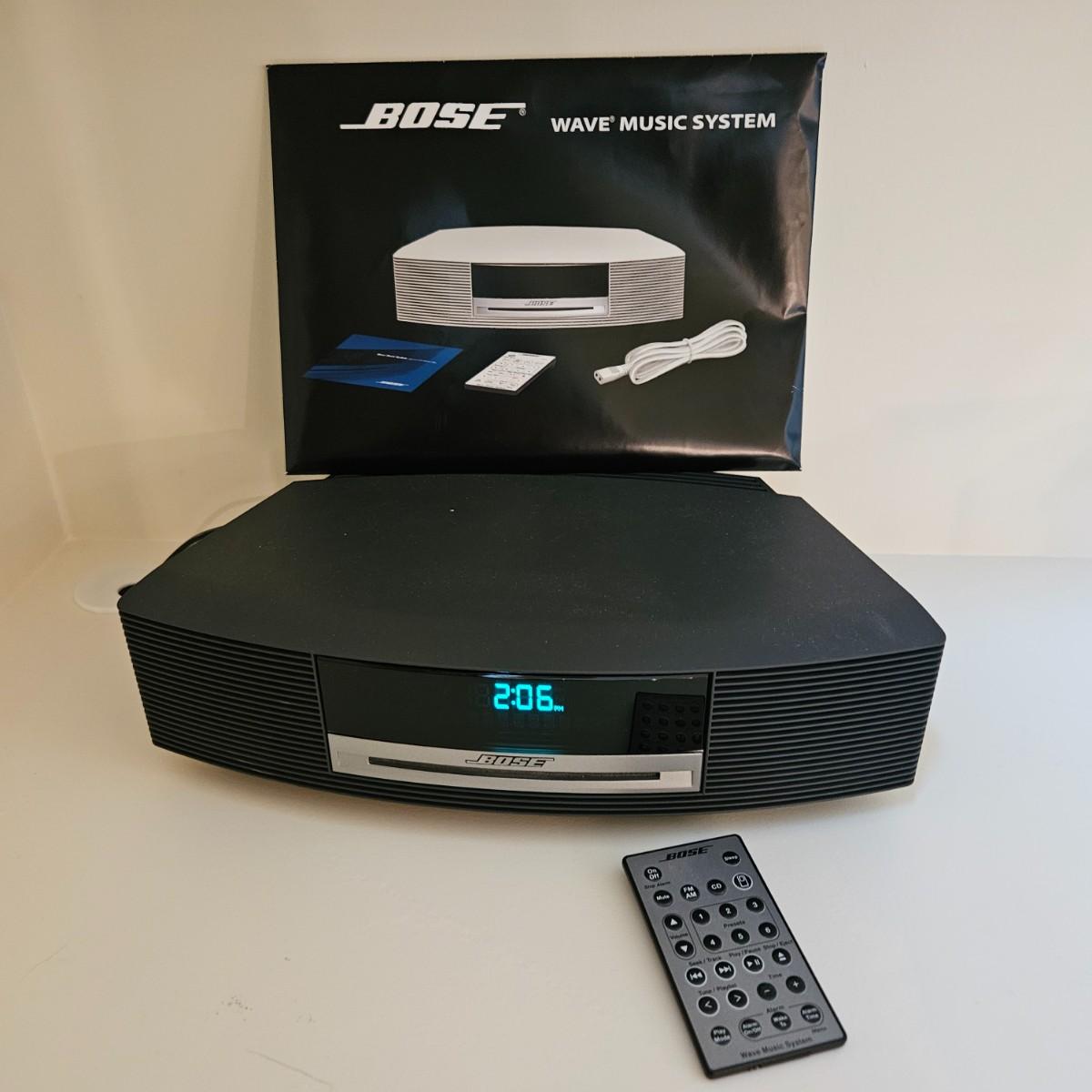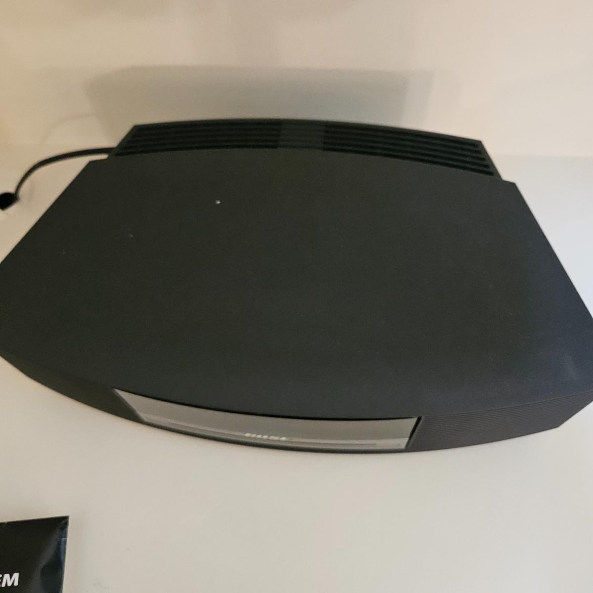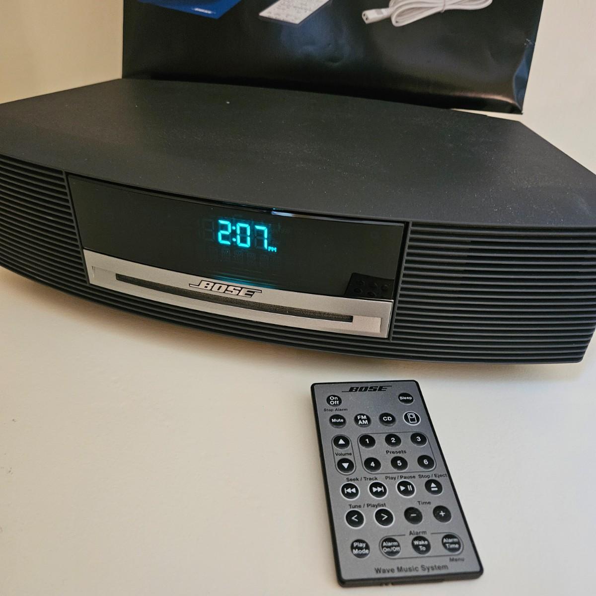 A Bose wave music system clock/radio/CD player that powered on when plugged in. It includes a remote and the original manual. It measures approximately 14.5" x 9" x 4"H. The CD player was not tested due to a lack of a convenient CD. Shipping available