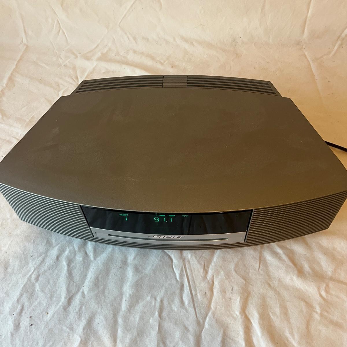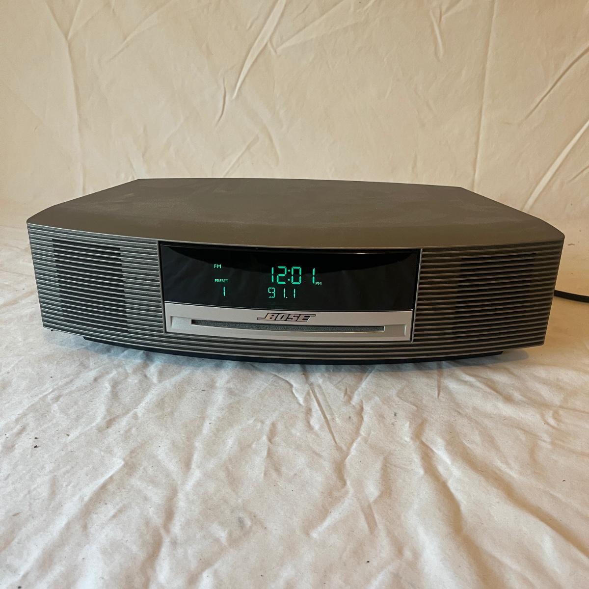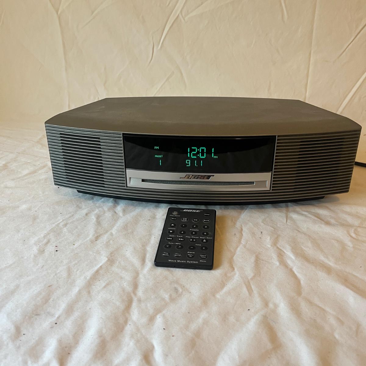 Lot includes a Bose Wave CD/Radio with remote that worked. Radio measures 14.5” x 9” x 4”H and powered on when plugged in.