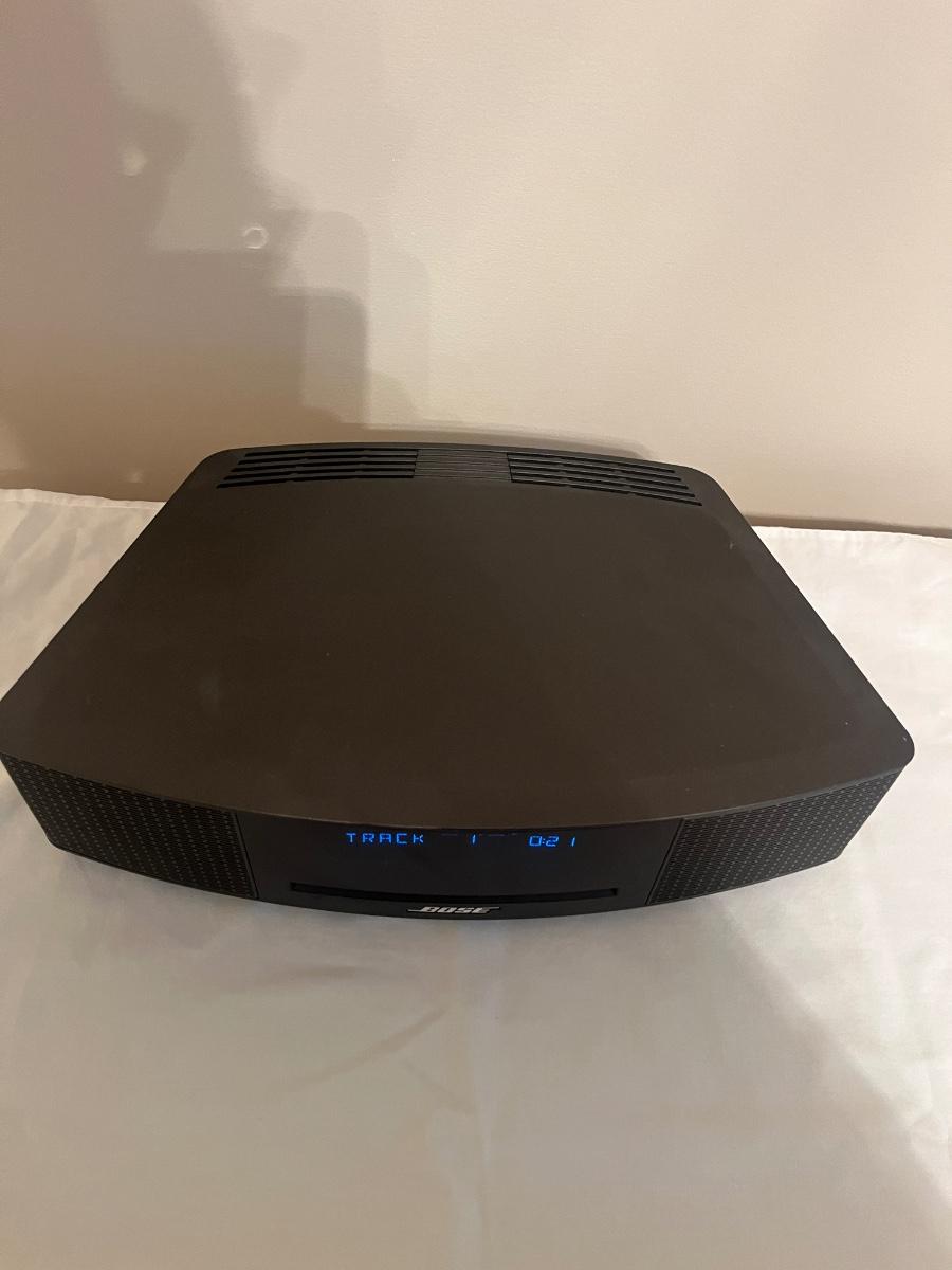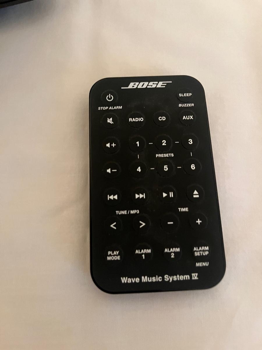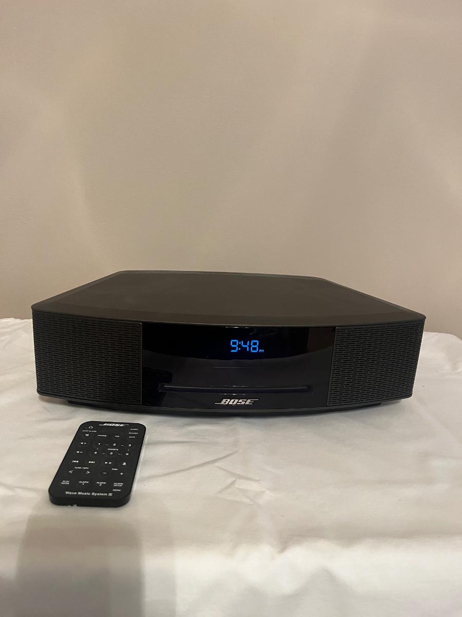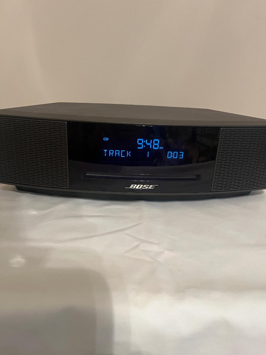 This Bose Wave radio and CD player powered on when plugged in and measures 14.5” x 9” x 4”H. Also includes remote that appears to need batteries.