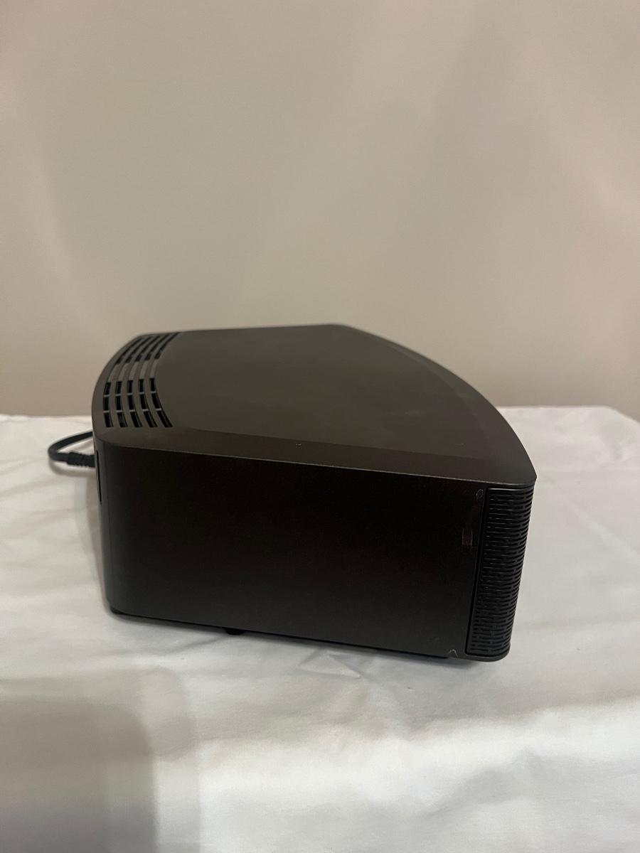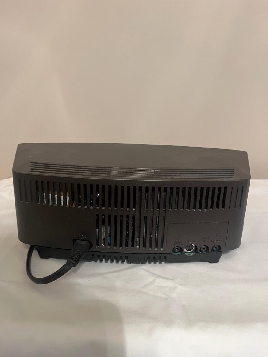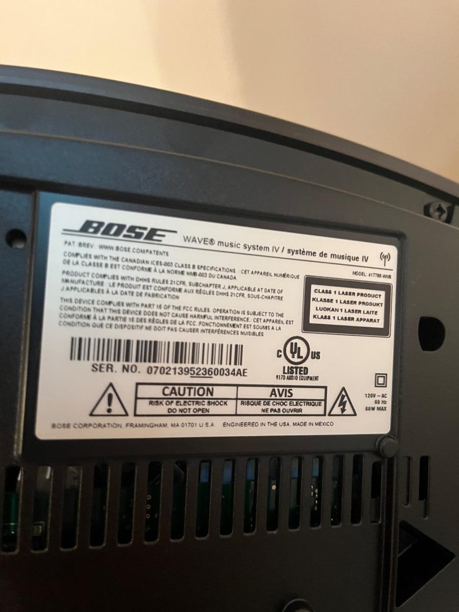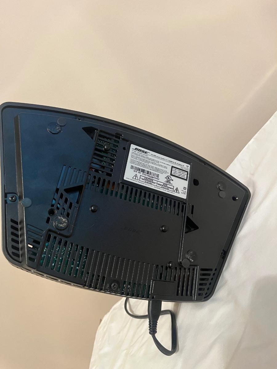 This Bose Wave radio and CD player powered on when plugged in and measures 14.5” x 9” x 4”H. Also includes remote that appears to need batteries.