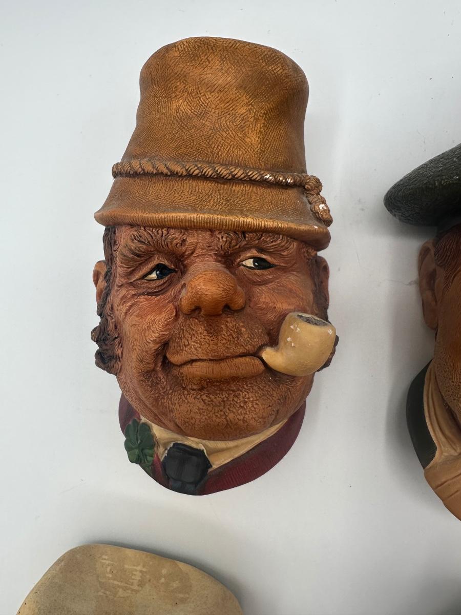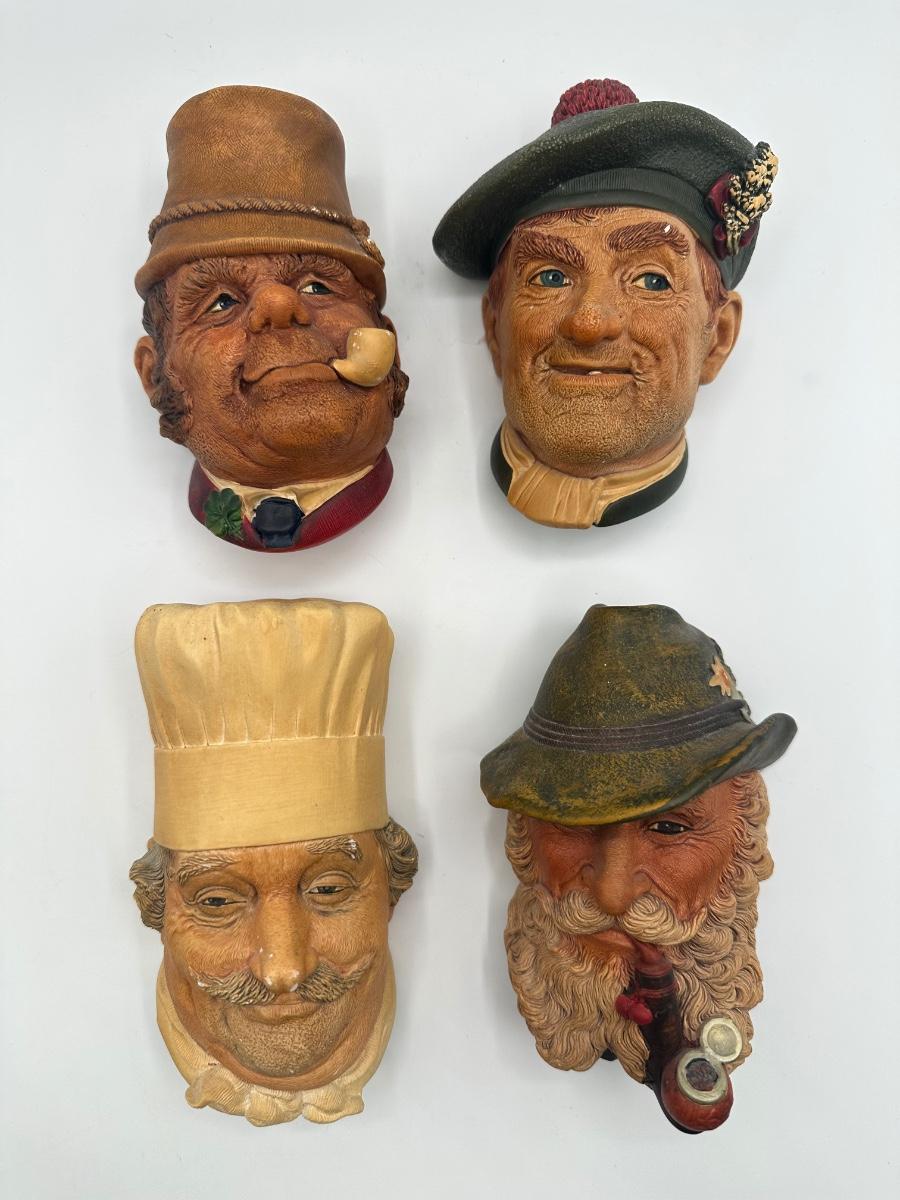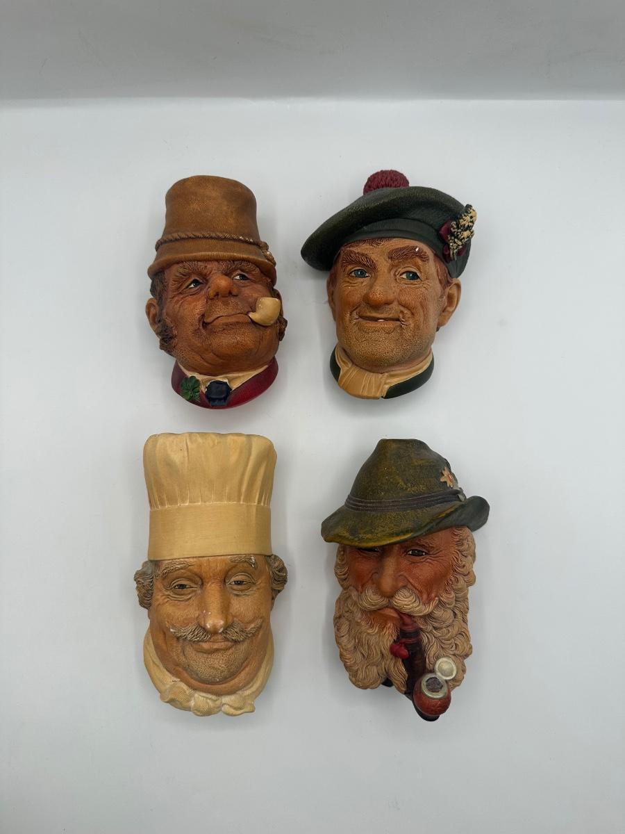 Group of four vintage Bossons character wall masks. Hand-painted chalkware figures produced by Bossons of Congleton, England. Each marked on reverse.