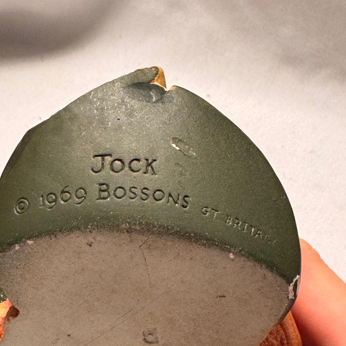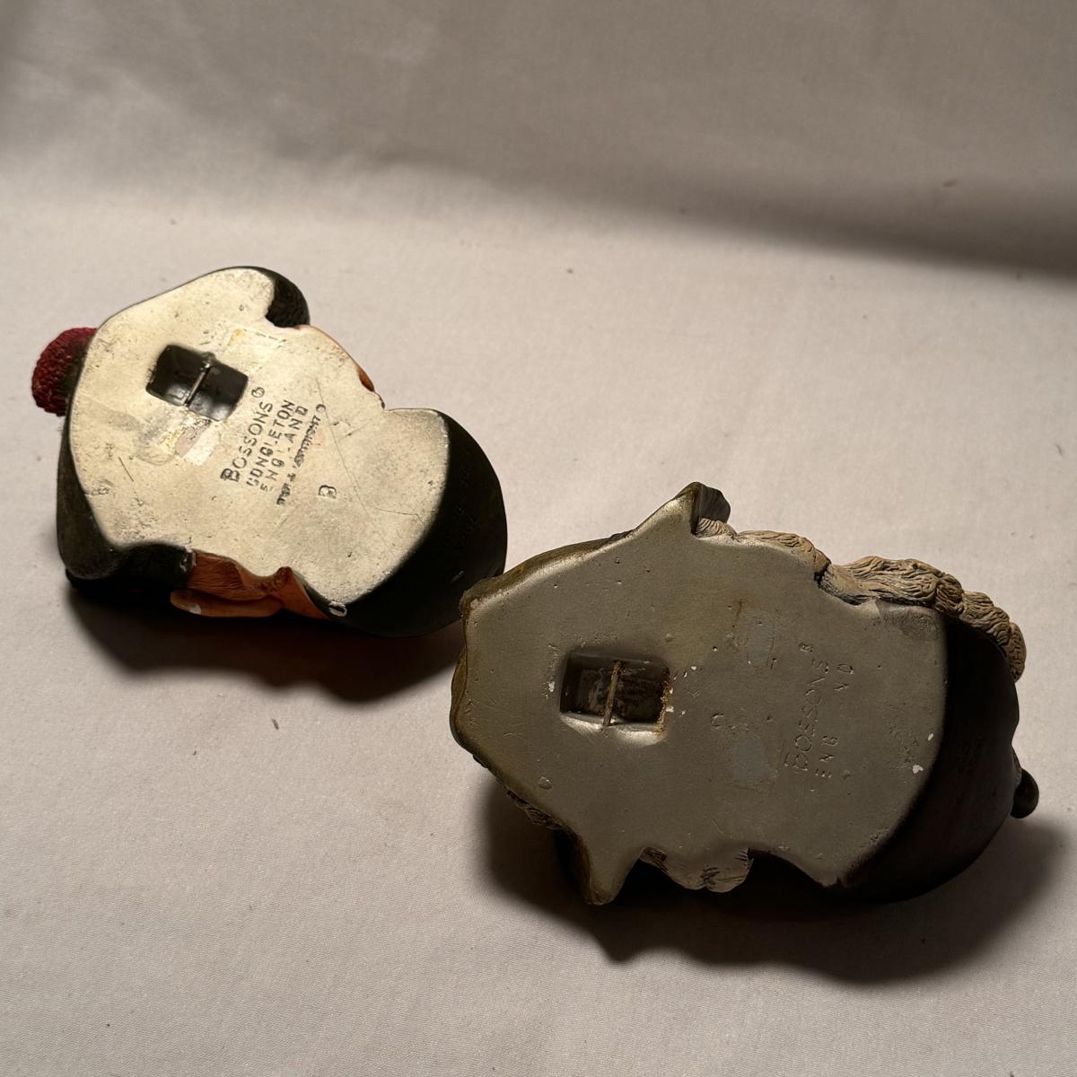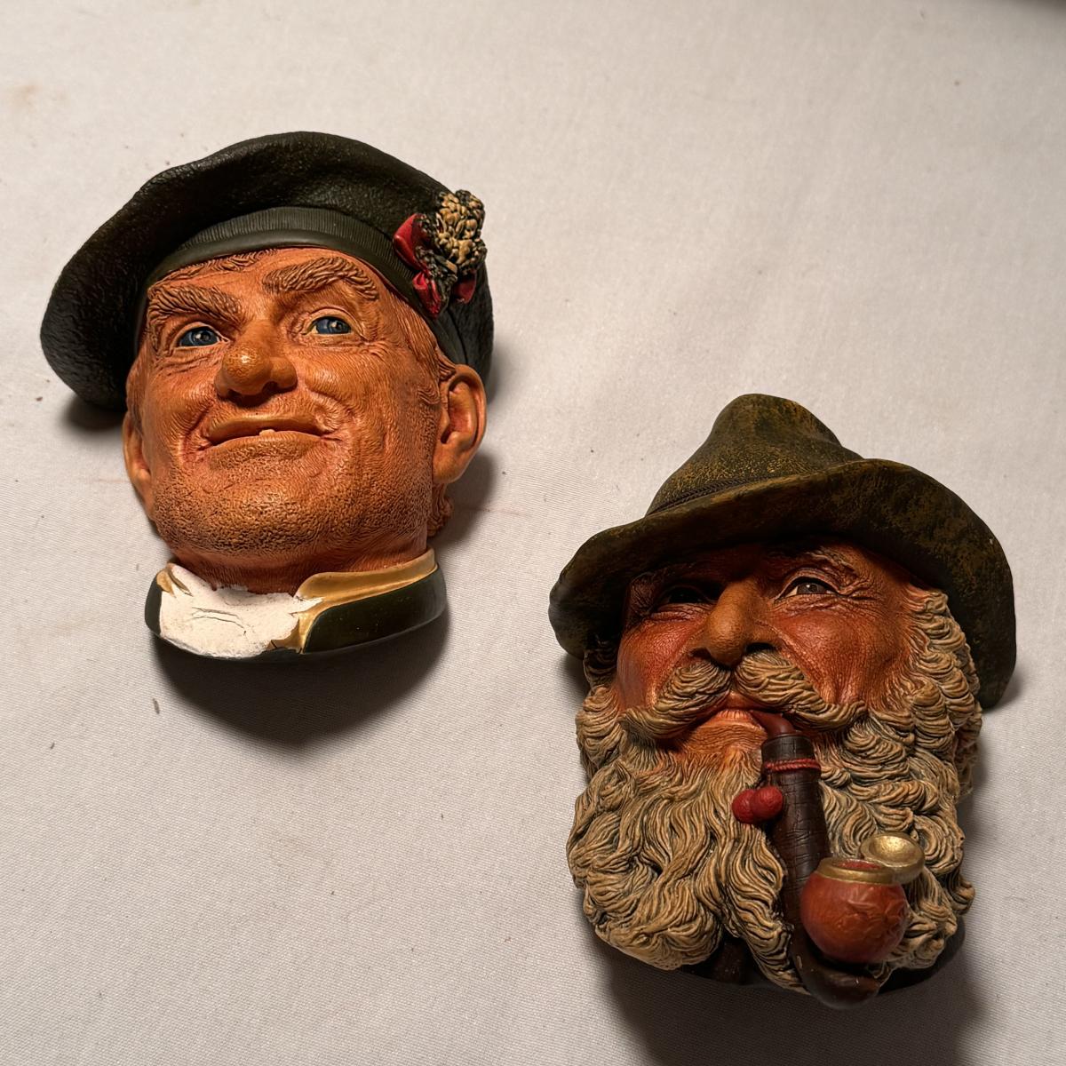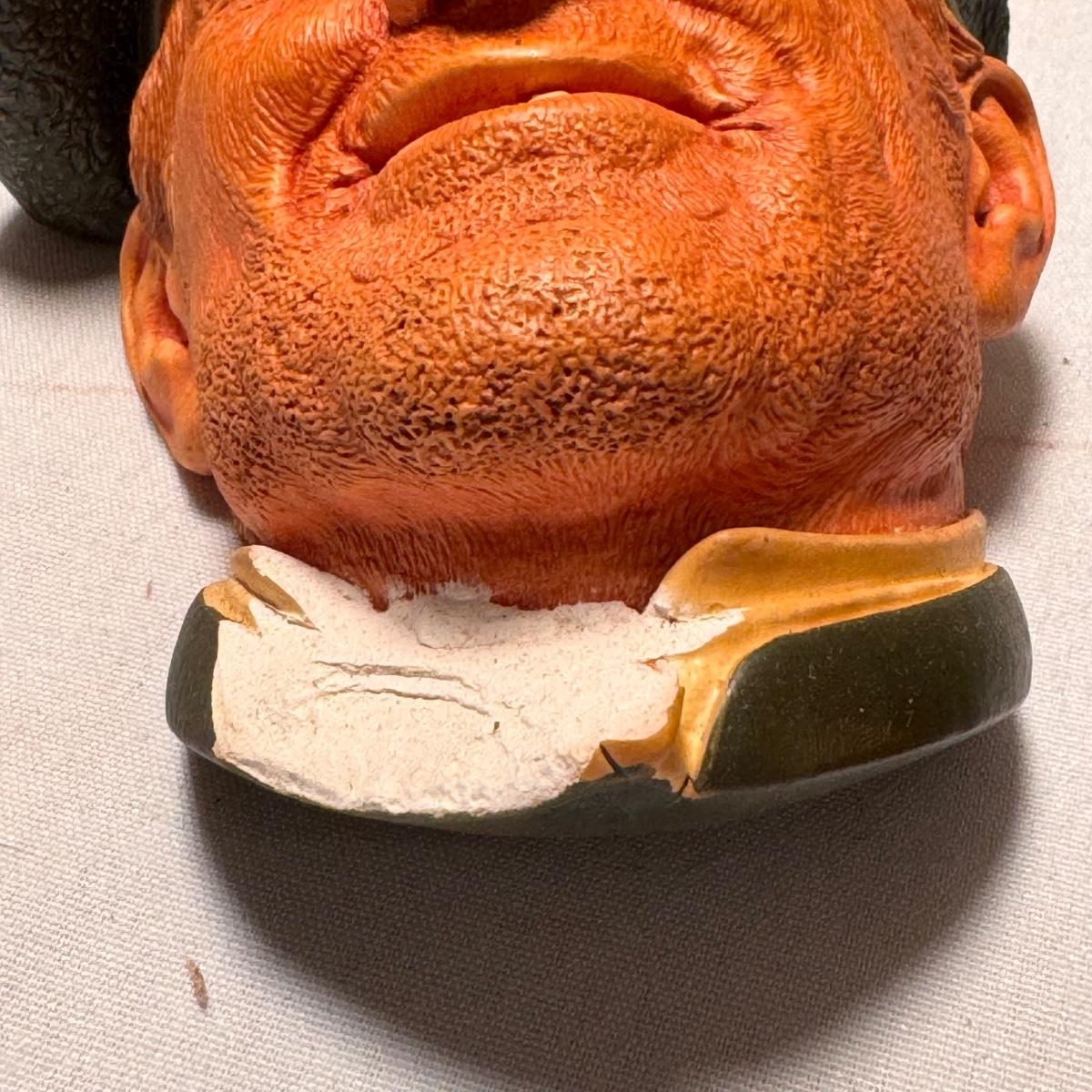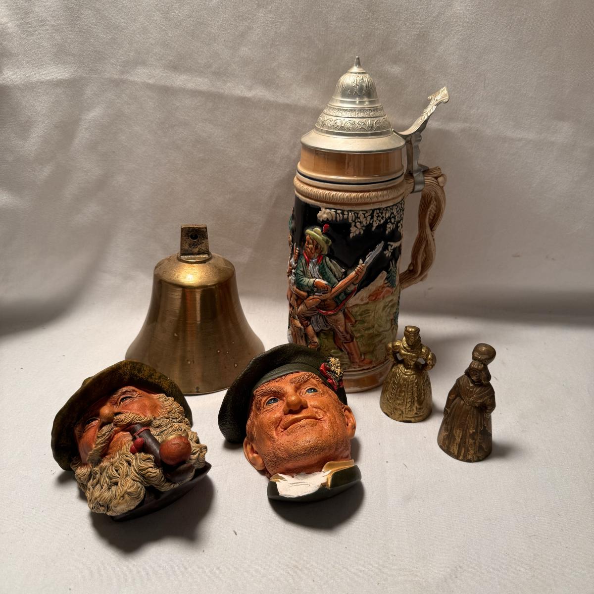 This lot includes two Bossons Chalkware heads, one ceramic stein stamped with Western Germany, two brass figurines (one has a bell), and one large brass bell. The Bossons Chalkware head pictured on the right is labeled Brock. The largest item is the stein which measures 6” x 4” x 11”H. Shipping available.