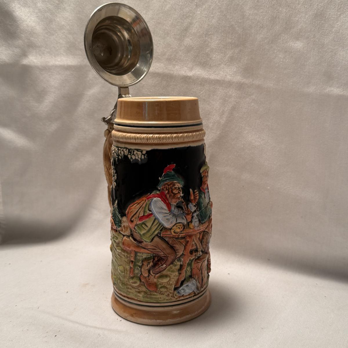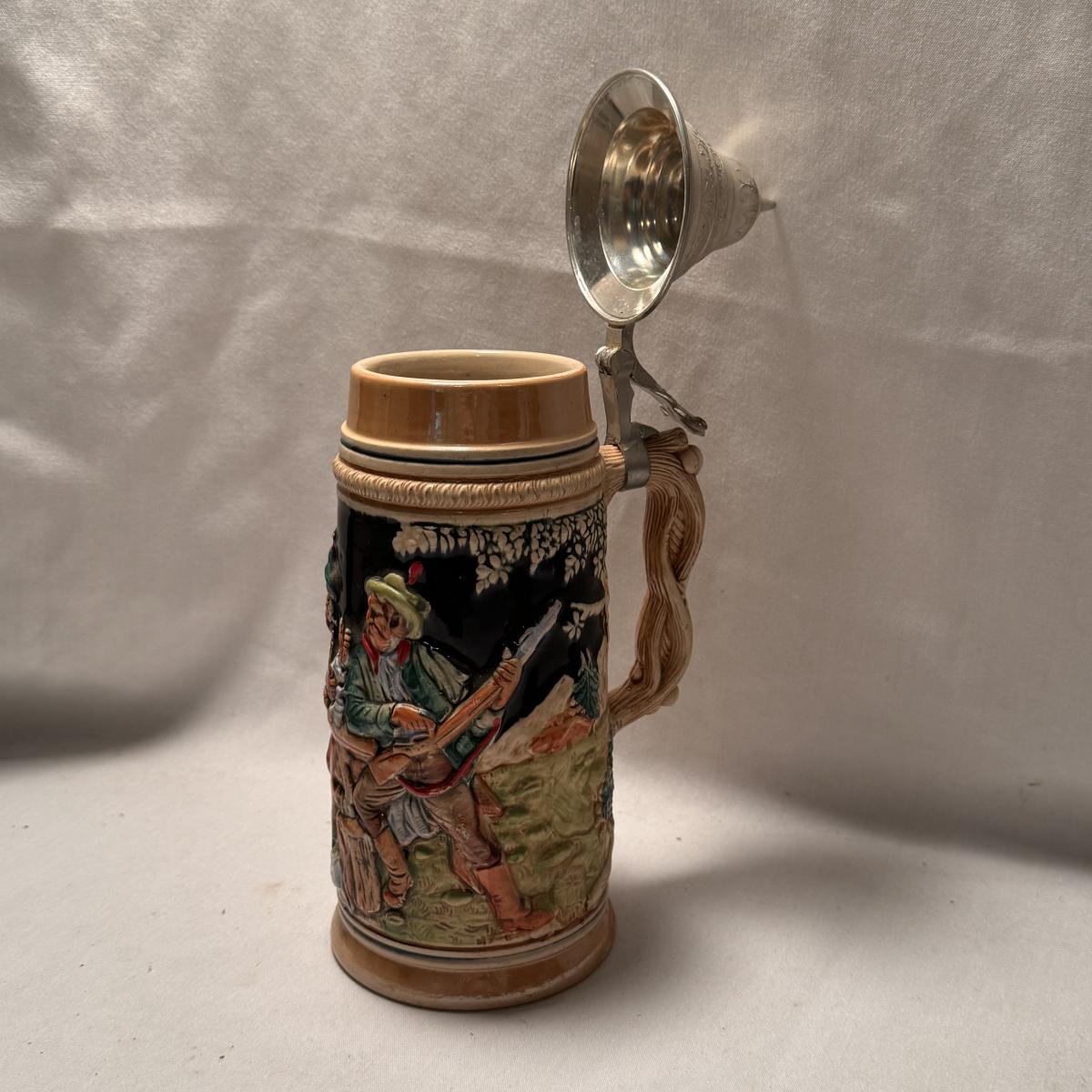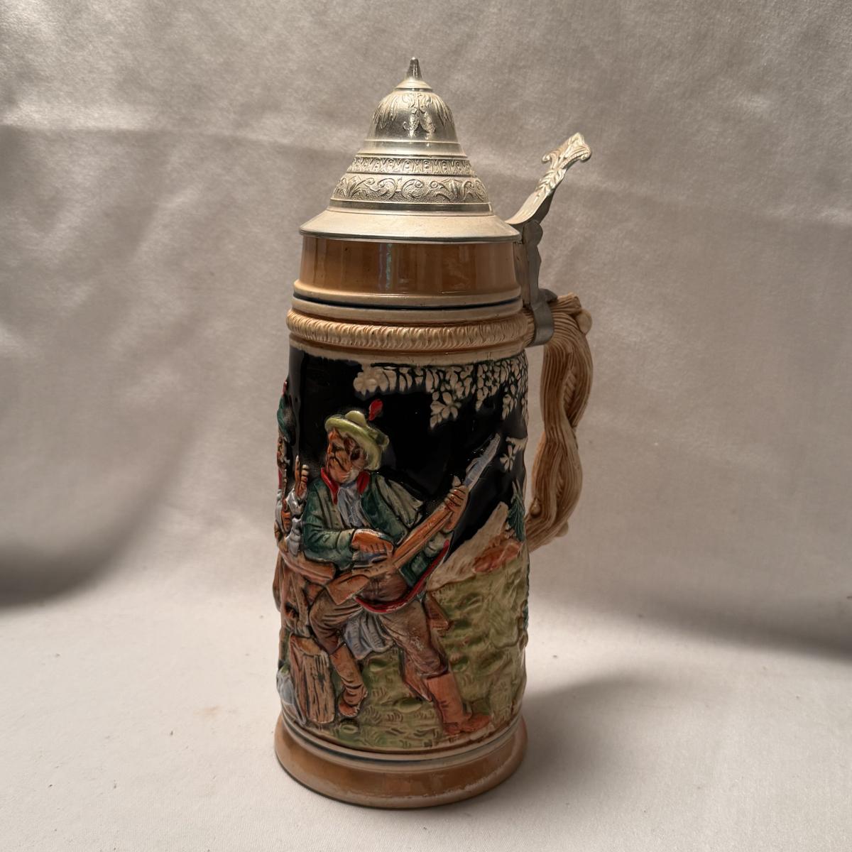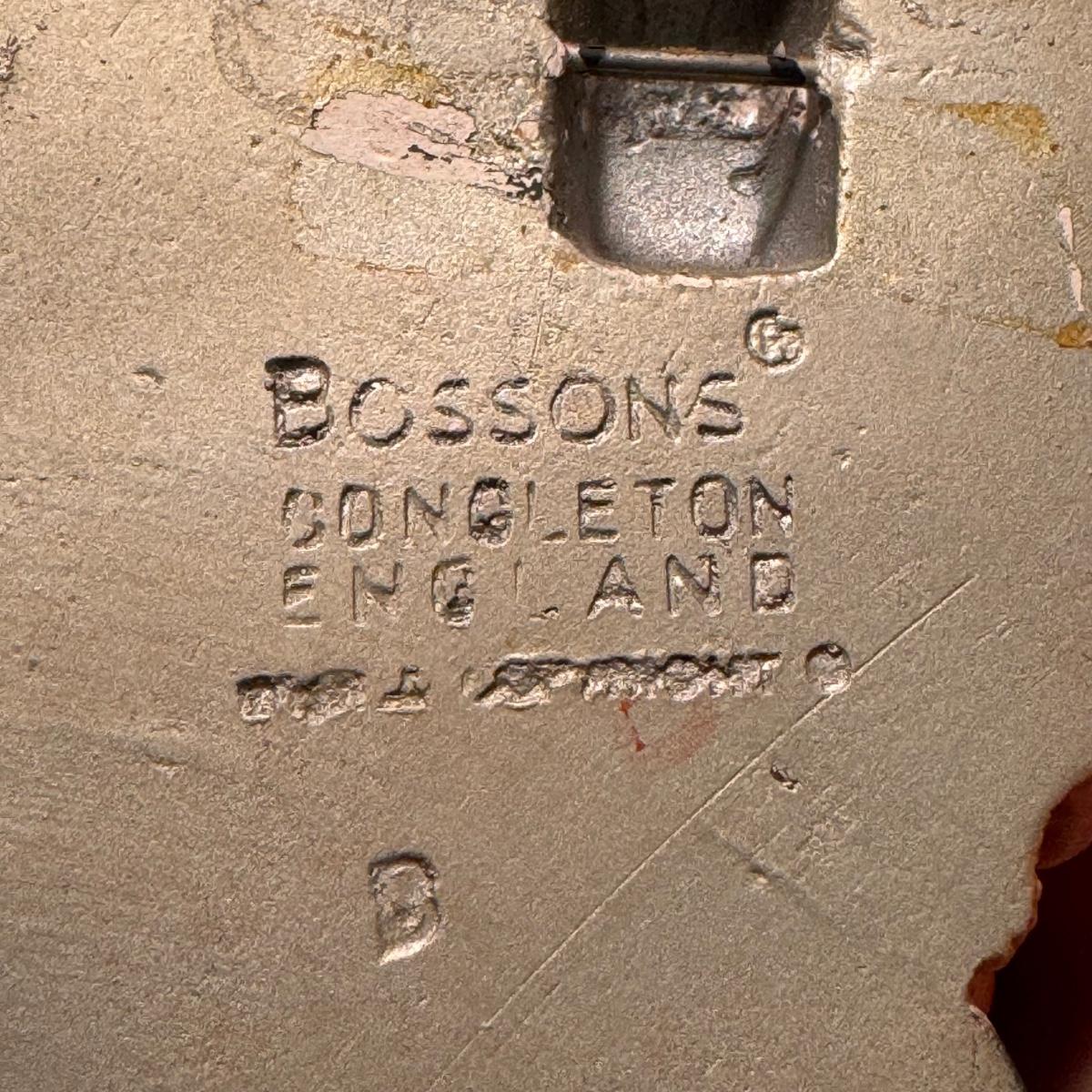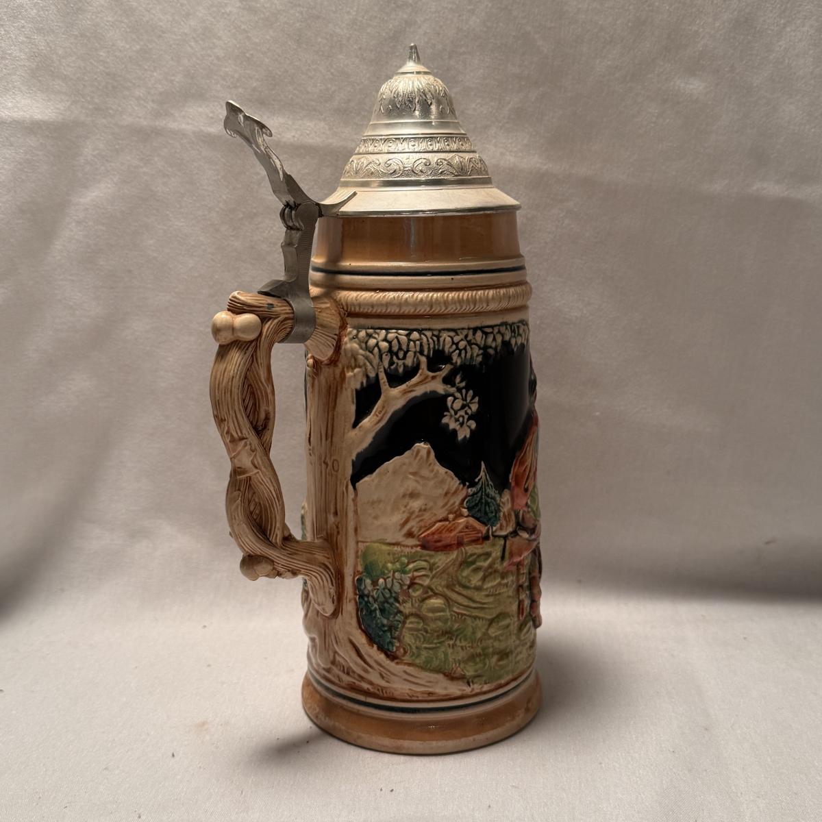 This lot includes two Bossons Chalkware heads, one ceramic stein stamped with Western Germany, two brass figurines (one has a bell), and one large brass bell. The Bossons Chalkware head pictured on the right is labeled Brock. The largest item is the stein which measures 6” x 4” x 11”H. Shipping available.