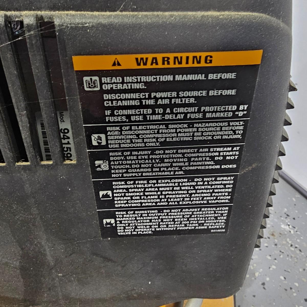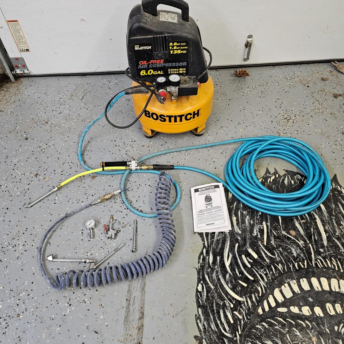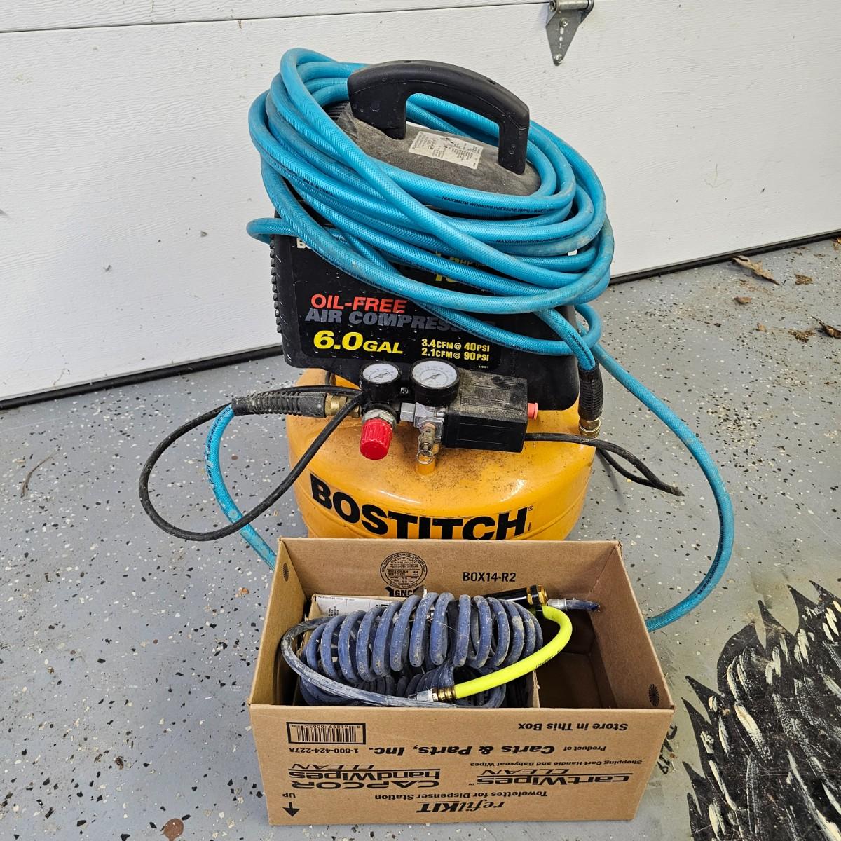 Oil free Bostitch pancake compressor, air hose and attachments. Dual gauges and quick couple ends on hose. Extra tire gauges and air nozzles. Short blue coiled hose needs repair. Compressor measures 17"D x 23"H, and powered on when plugged in. All items used. See photos for details. Local pickup only.