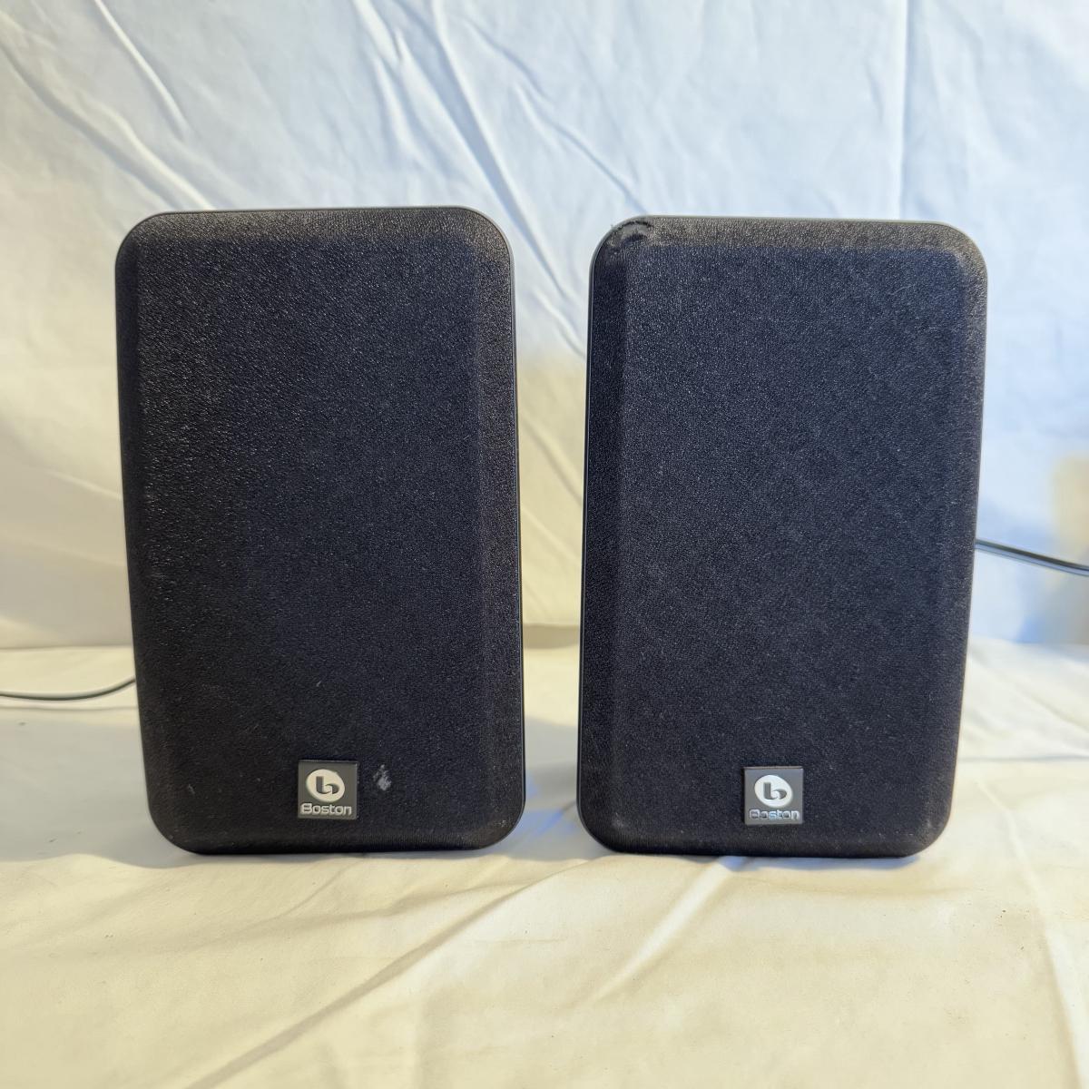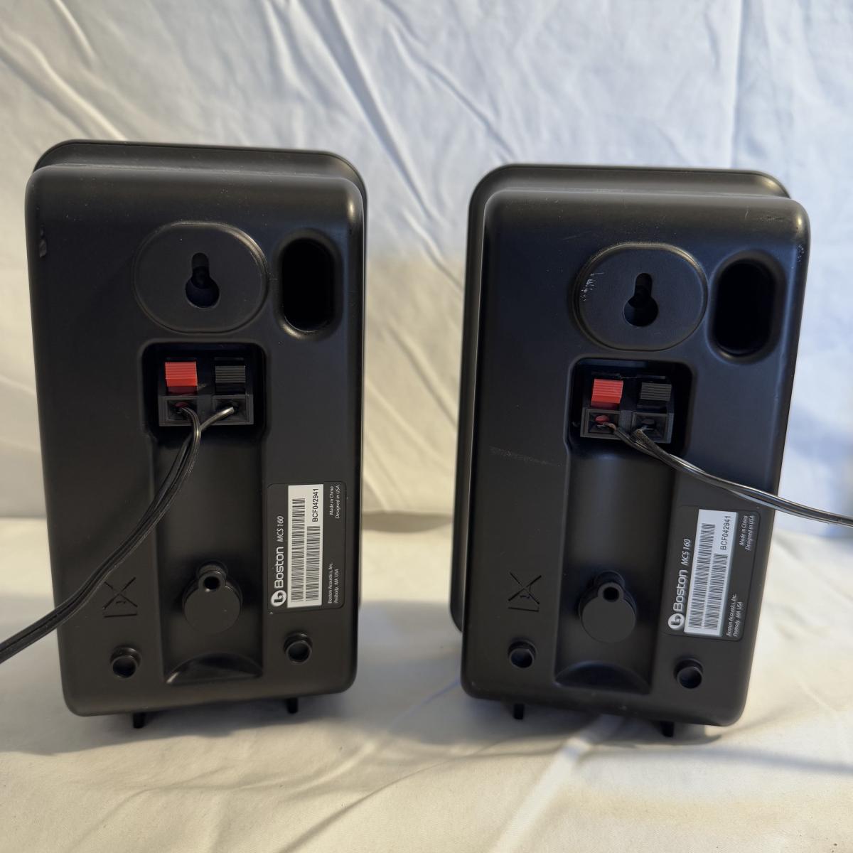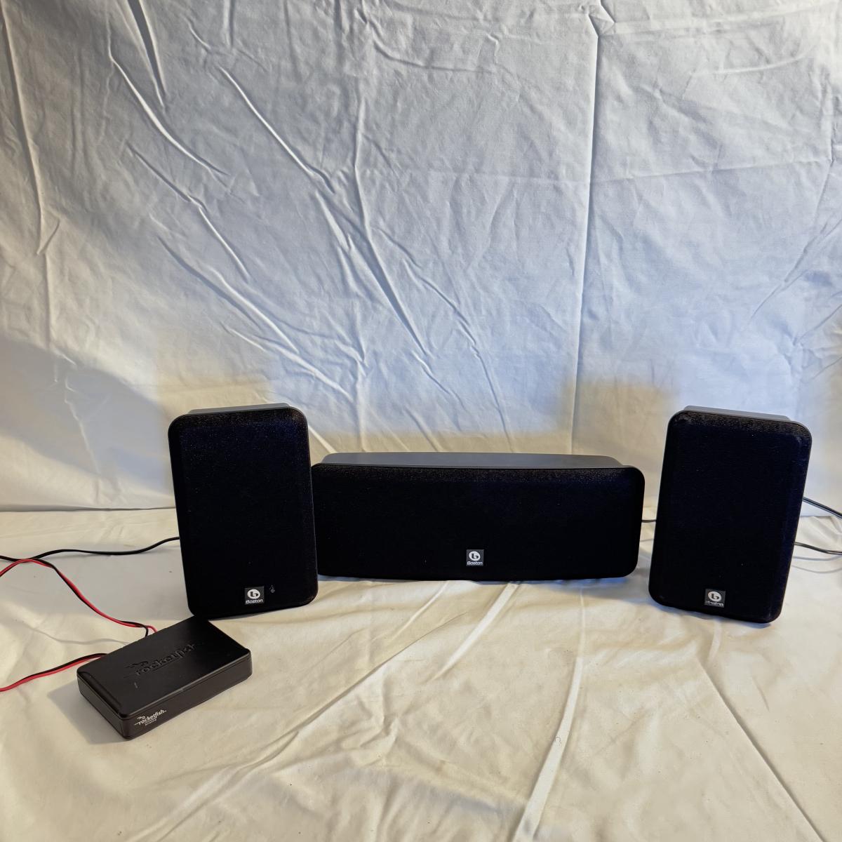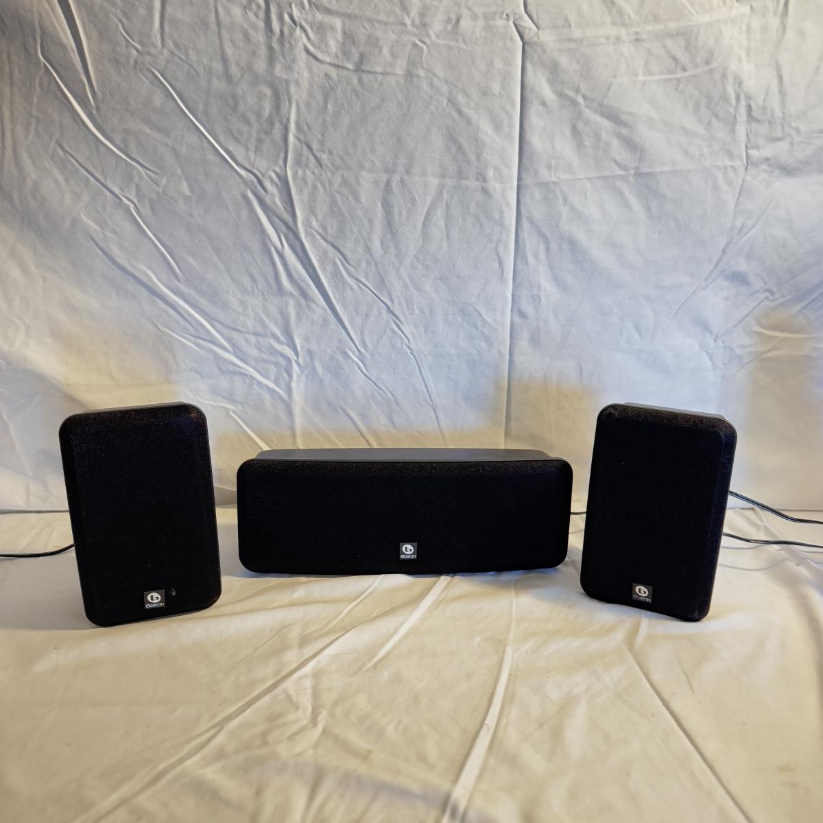 Lot includes three Boston MCS 160 surround sound speakers and one Rocketfish universal wireless rear speaker kit. The speakers have not been tested, but they appear to be in excellent shape. The largest speaker measures 12.5” x 3.5” x 4.5”H. Shipping available.