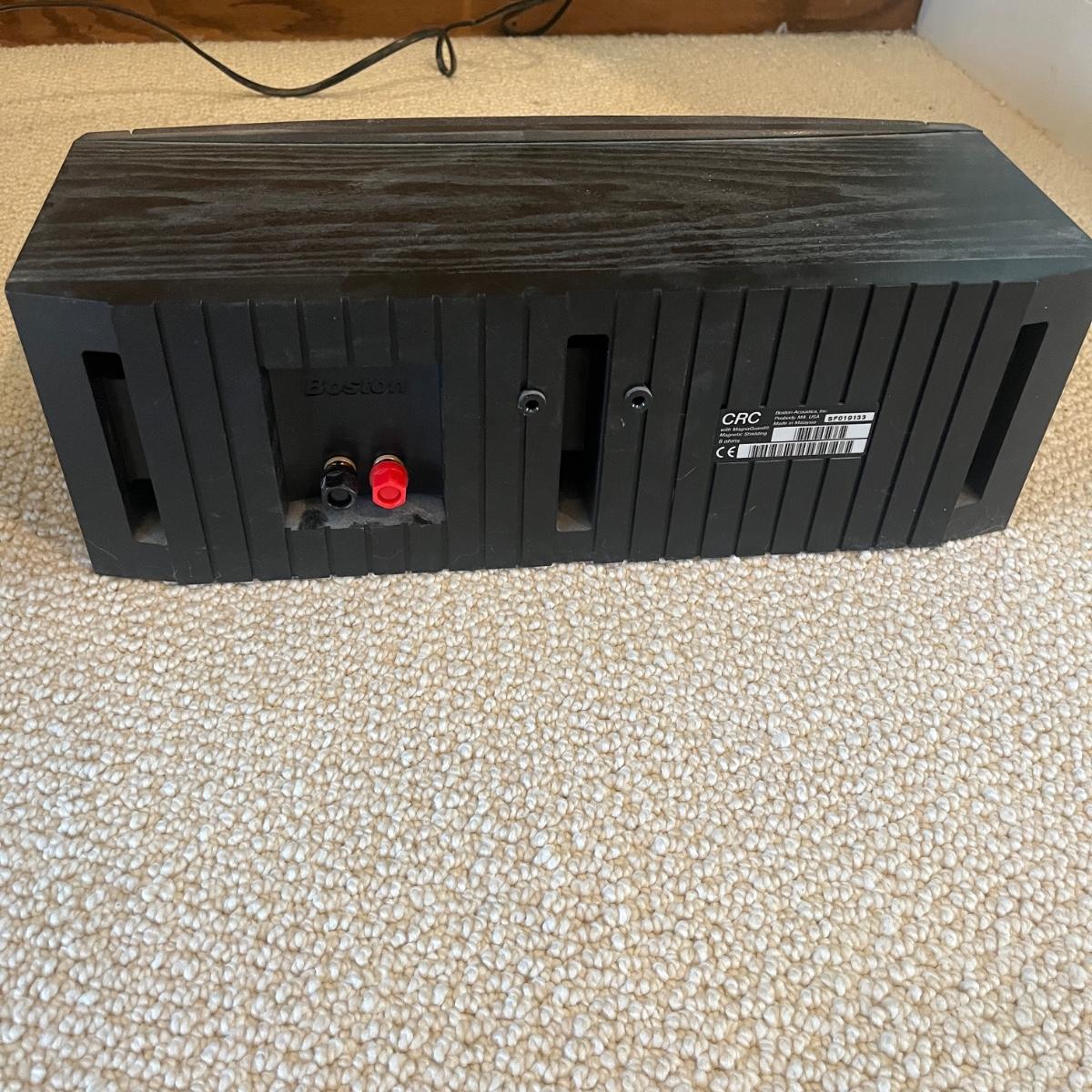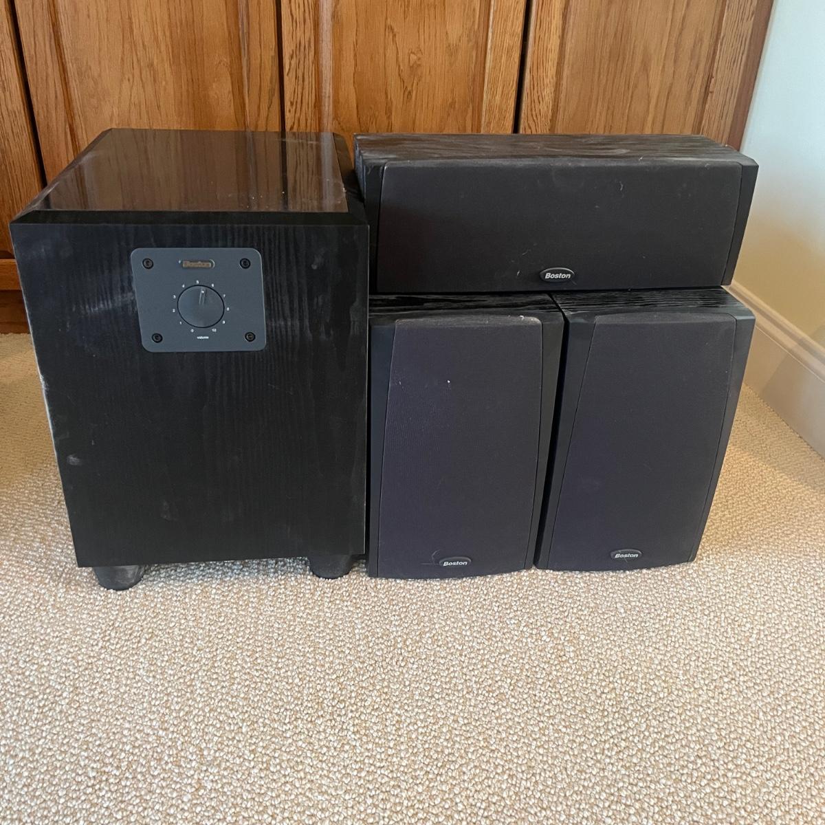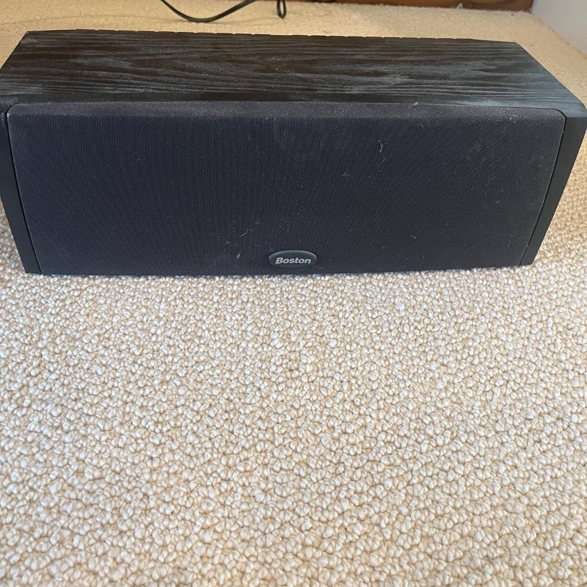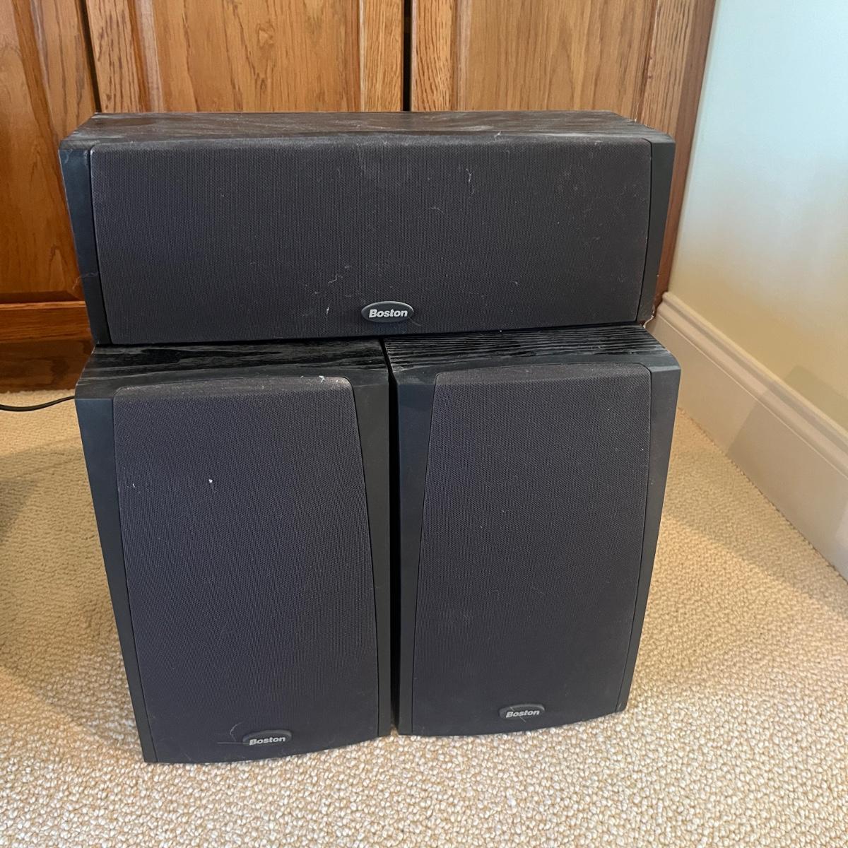 Lot includes a Boston powered sub woofer, two Boston bookshelf speakers and a Boston center speaker. Sub woofer measures 12” x 16” x 16”H and powered on when plugged in. Sub woofer has broken speaker, see pictures.