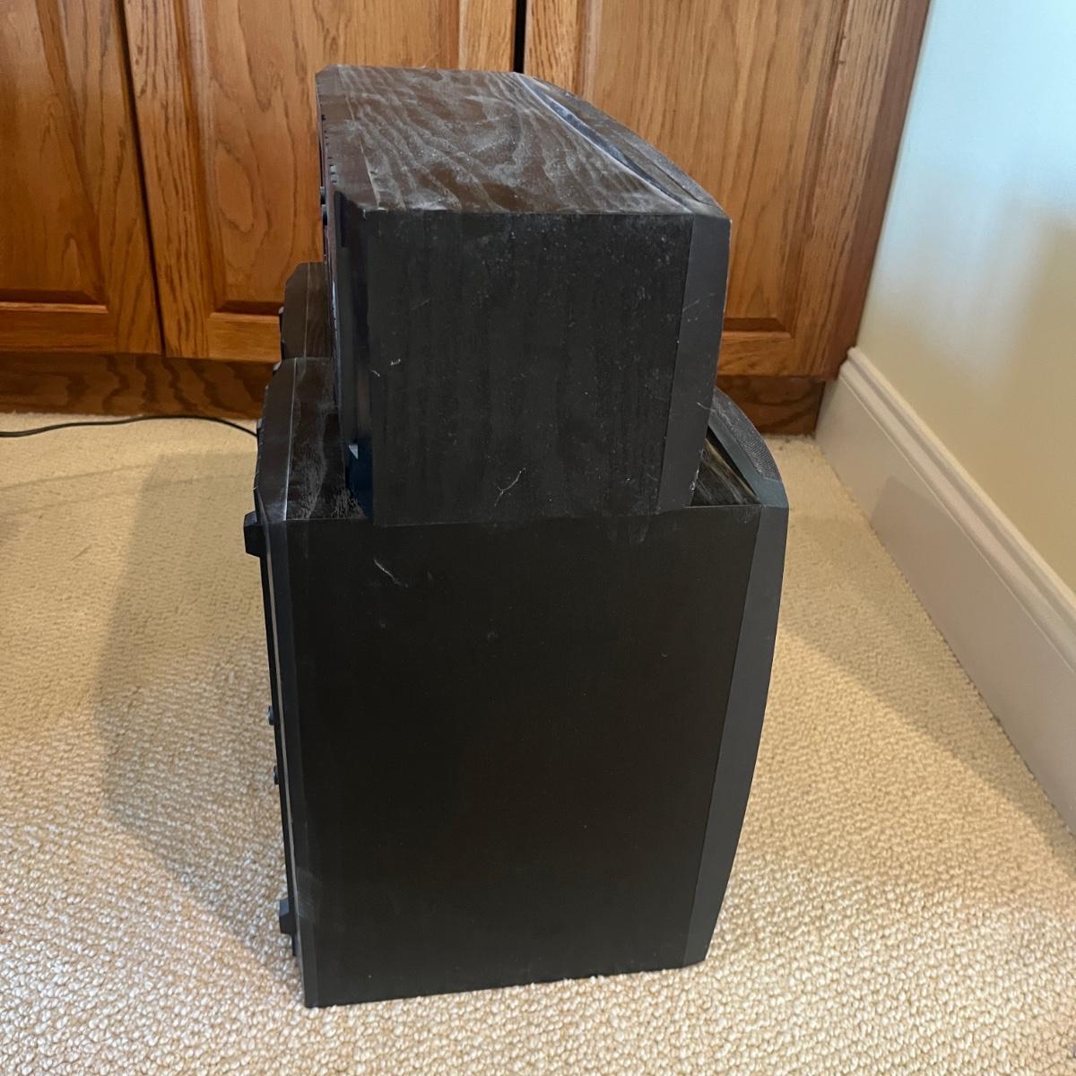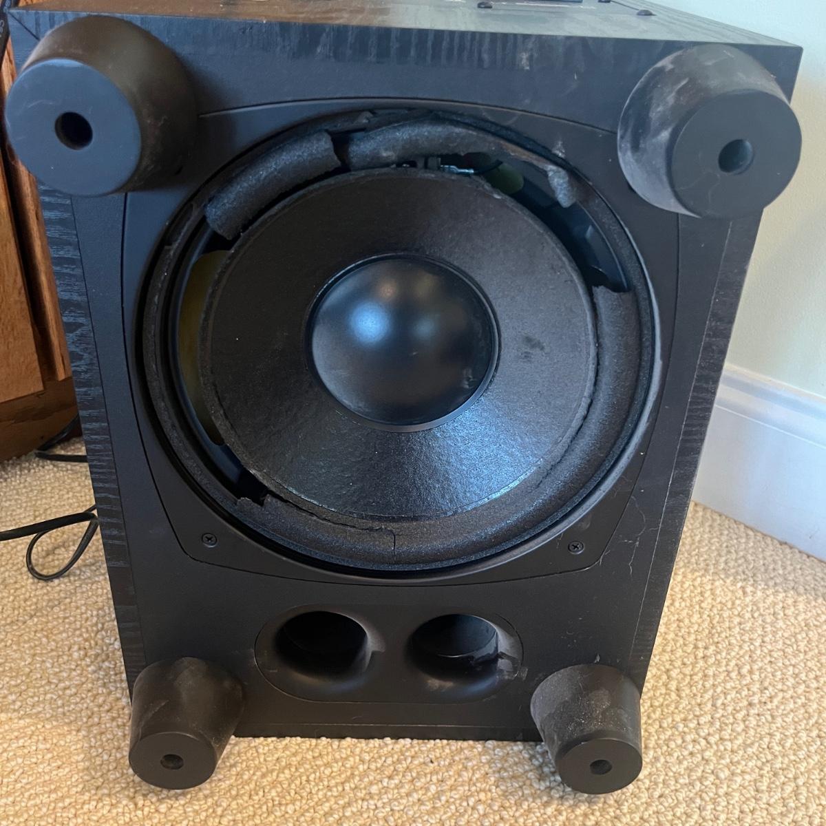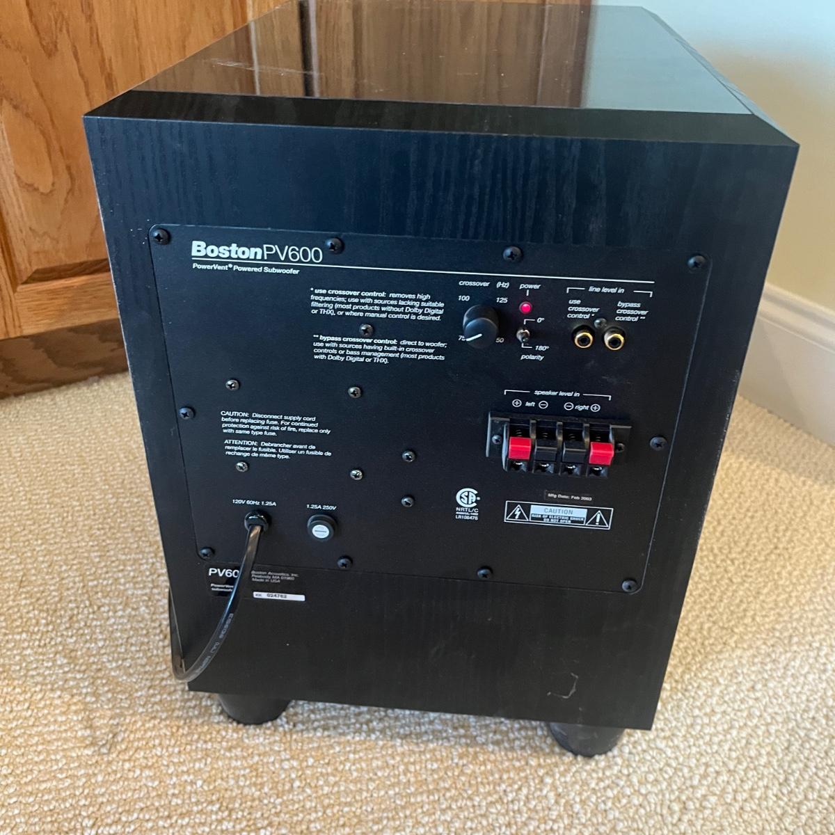 Lot includes a Boston powered sub woofer, two Boston bookshelf speakers and a Boston center speaker. Sub woofer measures 12” x 16” x 16”H and powered on when plugged in. Sub woofer has broken speaker, see pictures.