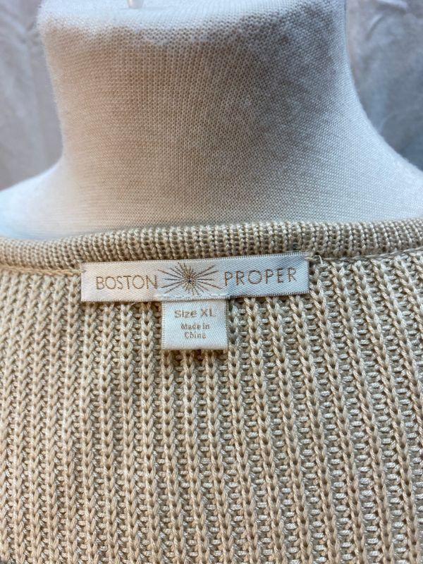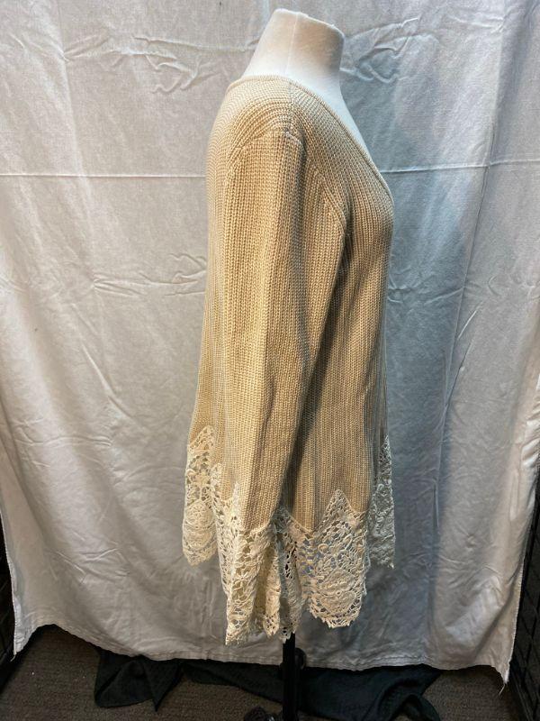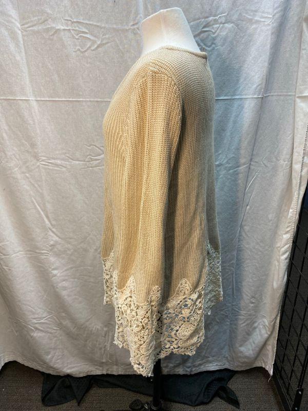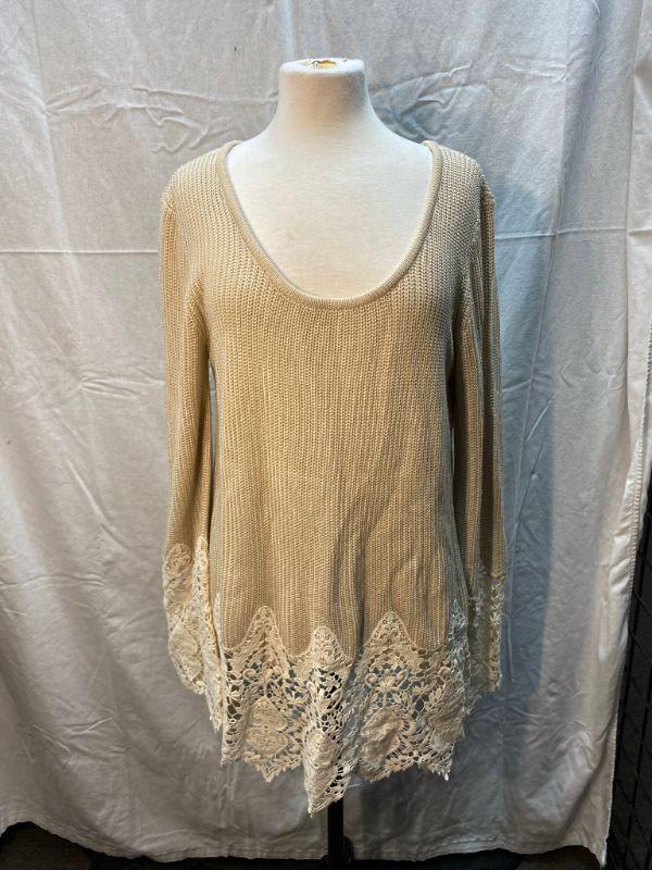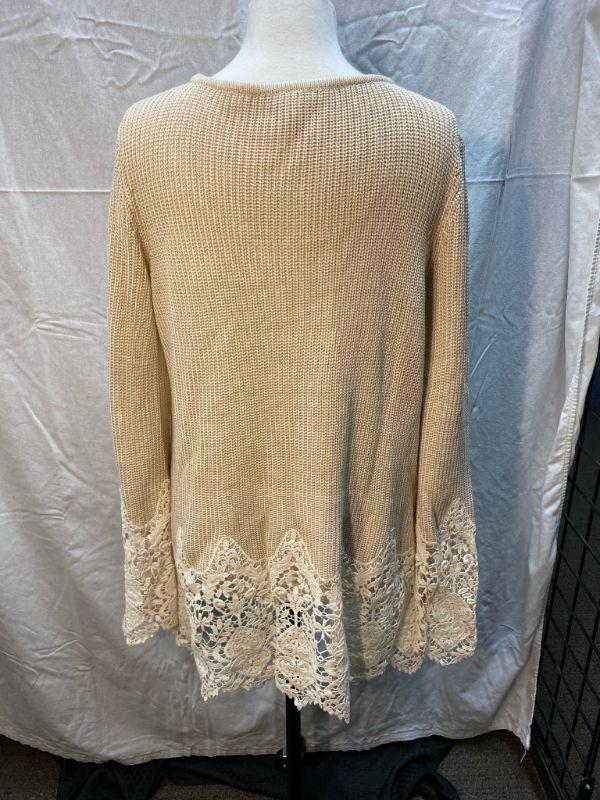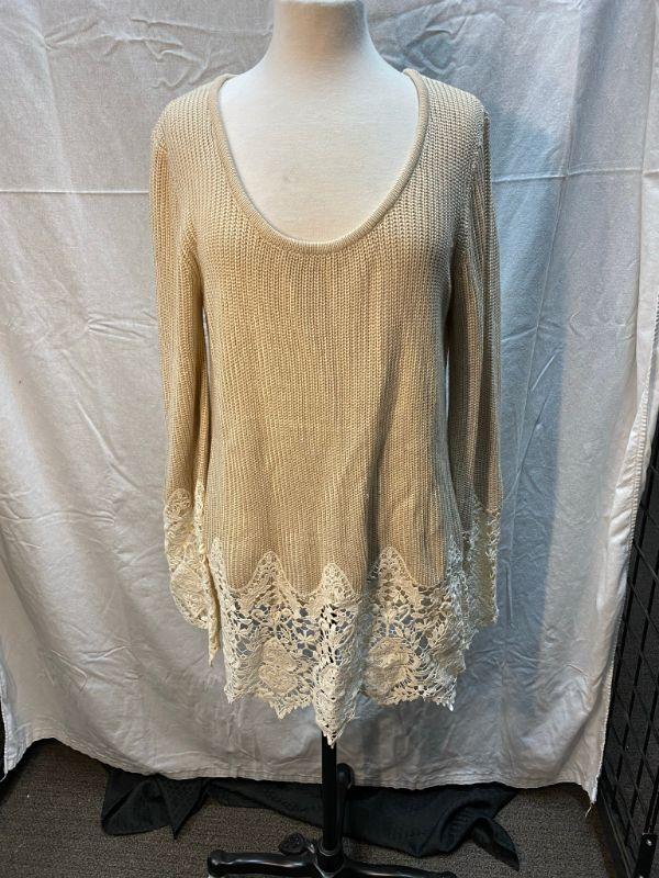 Boston Proper cream colored sweater. Tunic style sweater with wide lace edge along hem and cuff. Size XL. Good Condition.