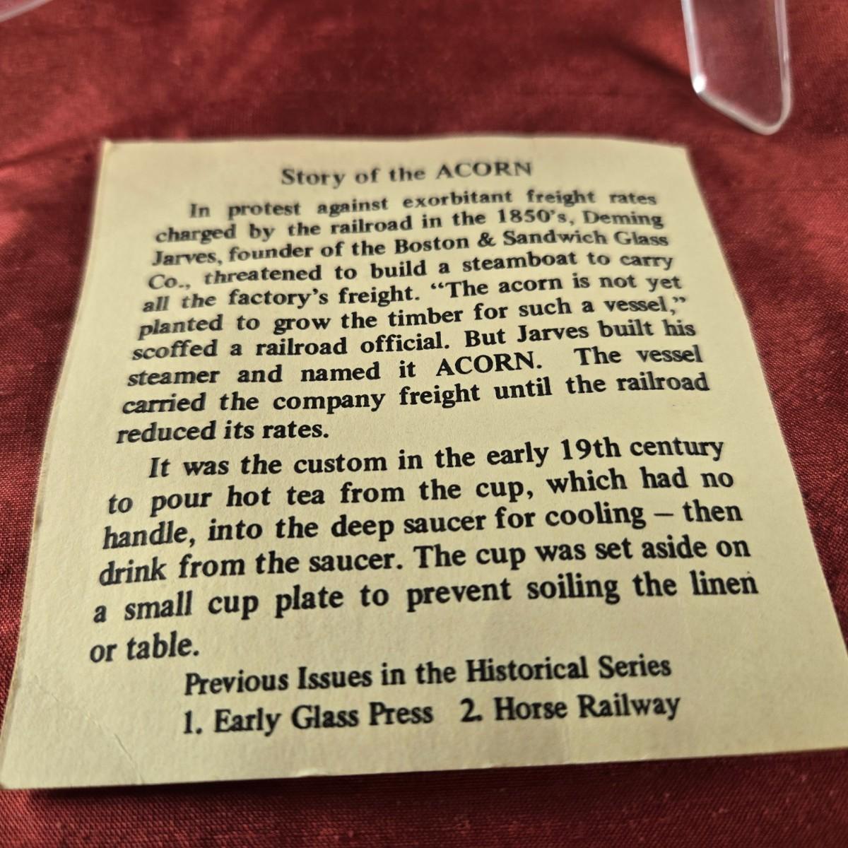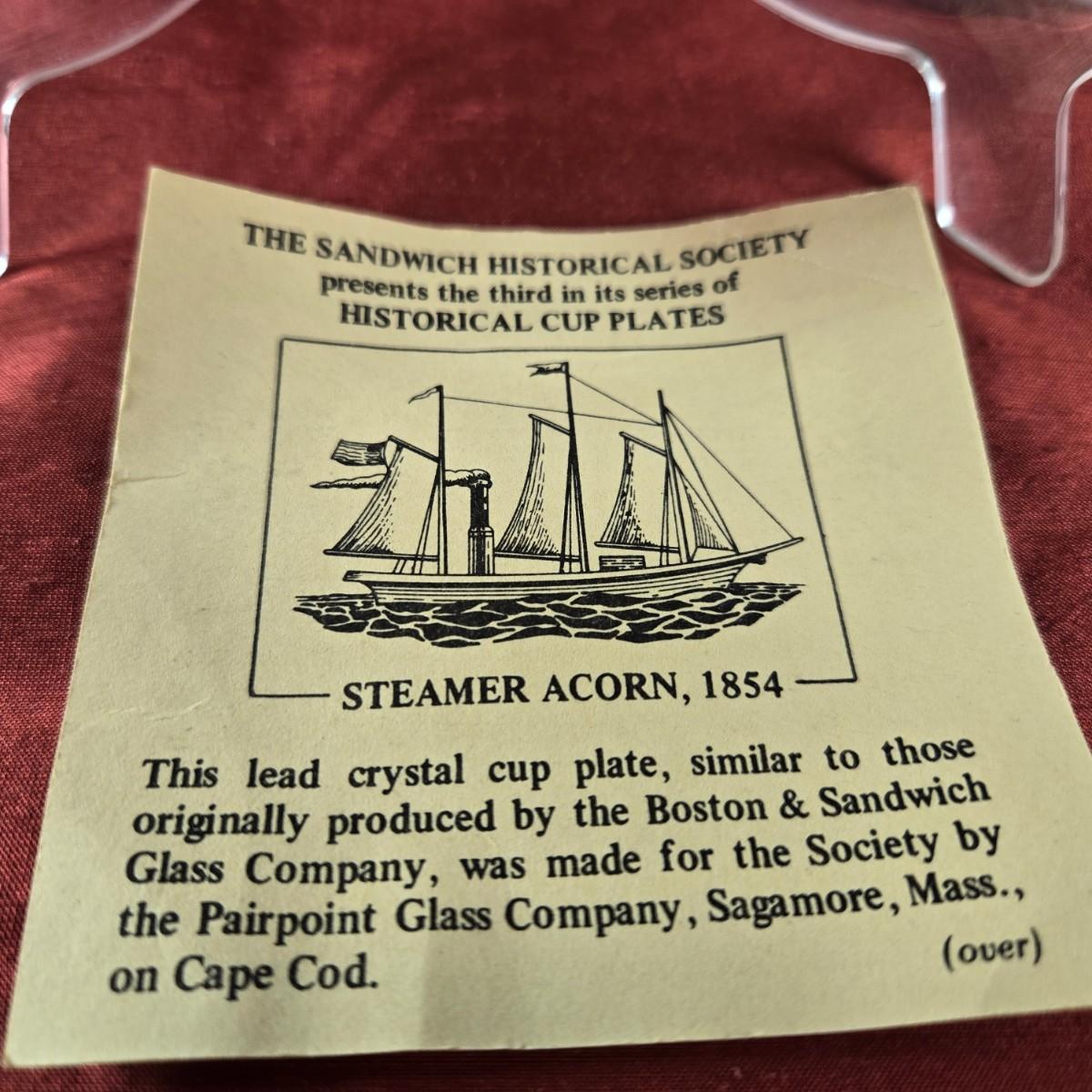 This auction lot is for a Boston & Sandwich Glass Company Collector Plate. This little collector plate is in it's original box with it's paperwork. It measures about 3-3/4-inches in diameter. It is a soft blue color, depicting the boat - "Steamer Acorn, 1854. It is the 3rd in the series.