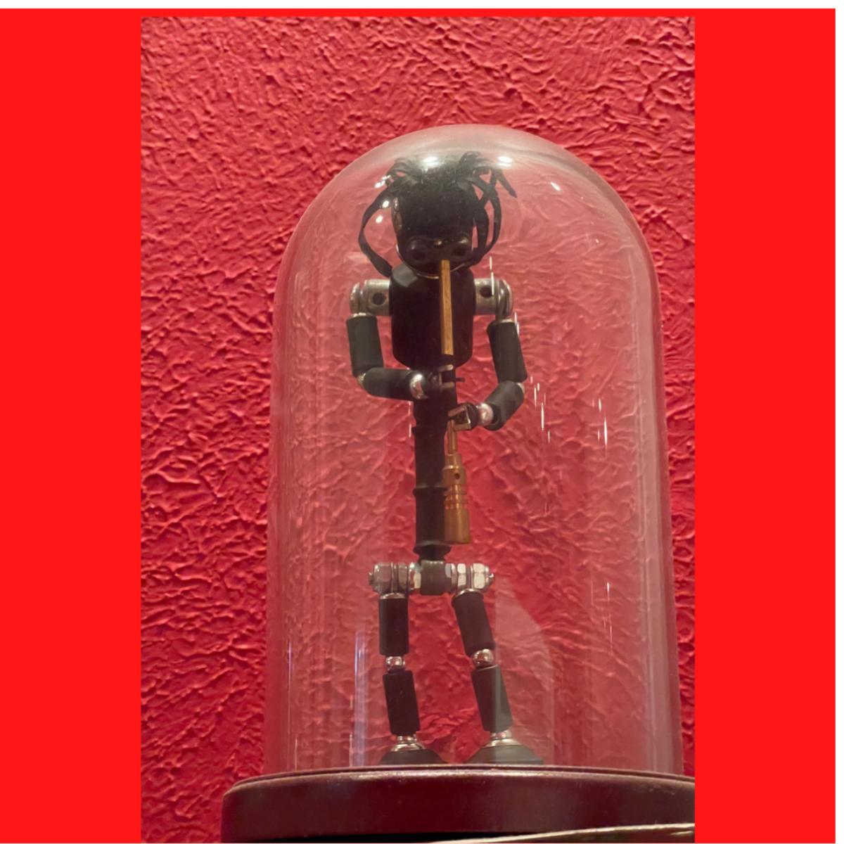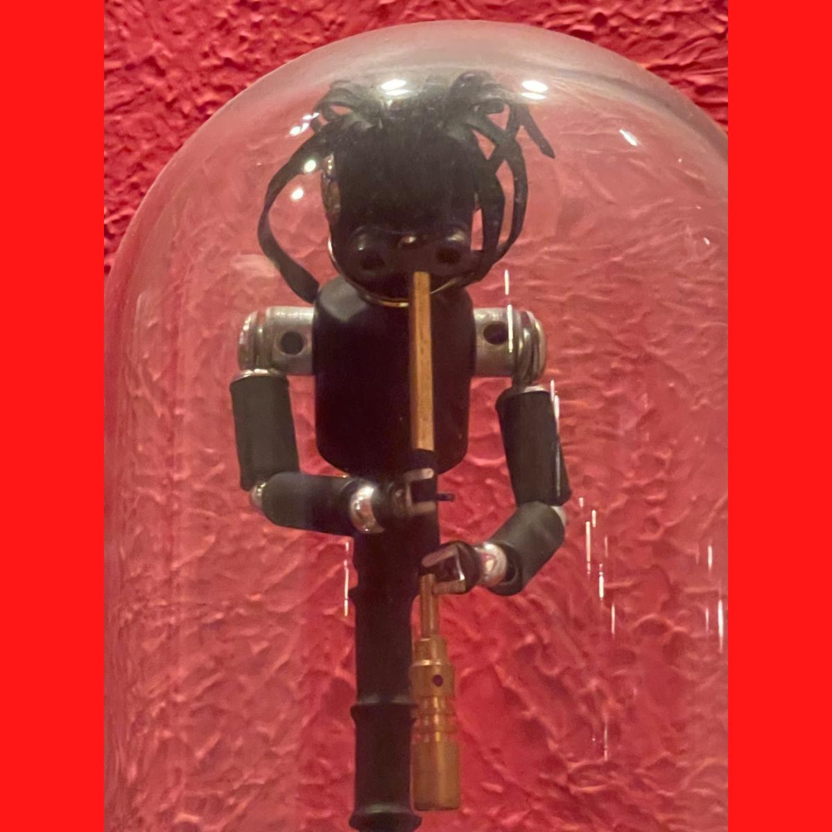 This is Sean Dixon’s portrayal of the Hopi Indian Fertility god Kokopeli. This is a phenomenal recycled art piece and comes in its own dome case.
