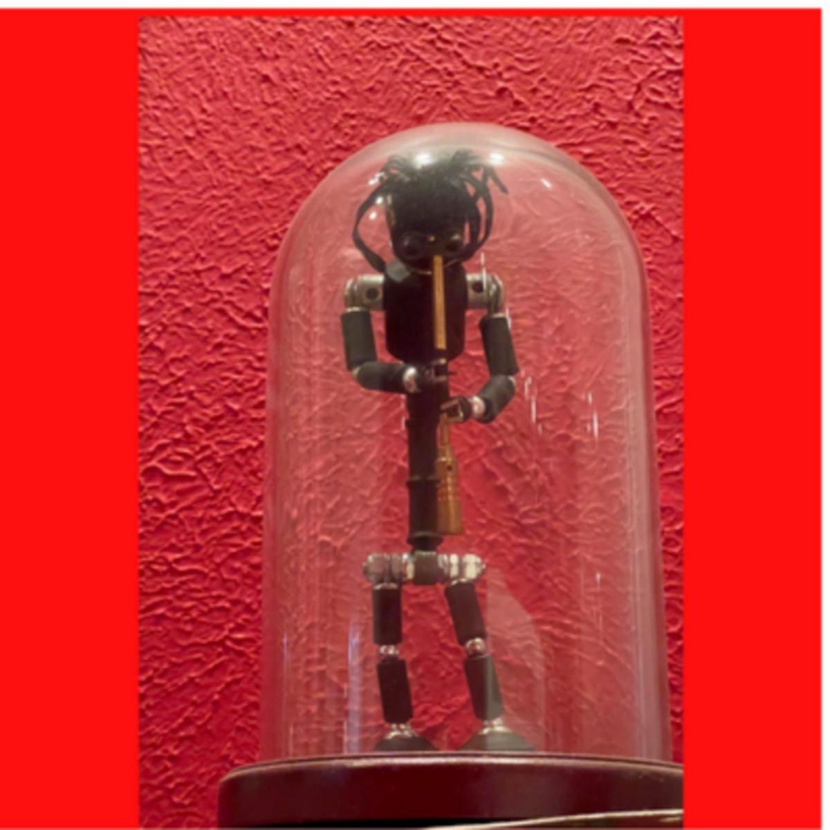 This is Sean Dixon’s portrayal of the Hopi Indian Fertility god Kokopeli. This is a phenomenal recycled art piece and comes in its own dome case.