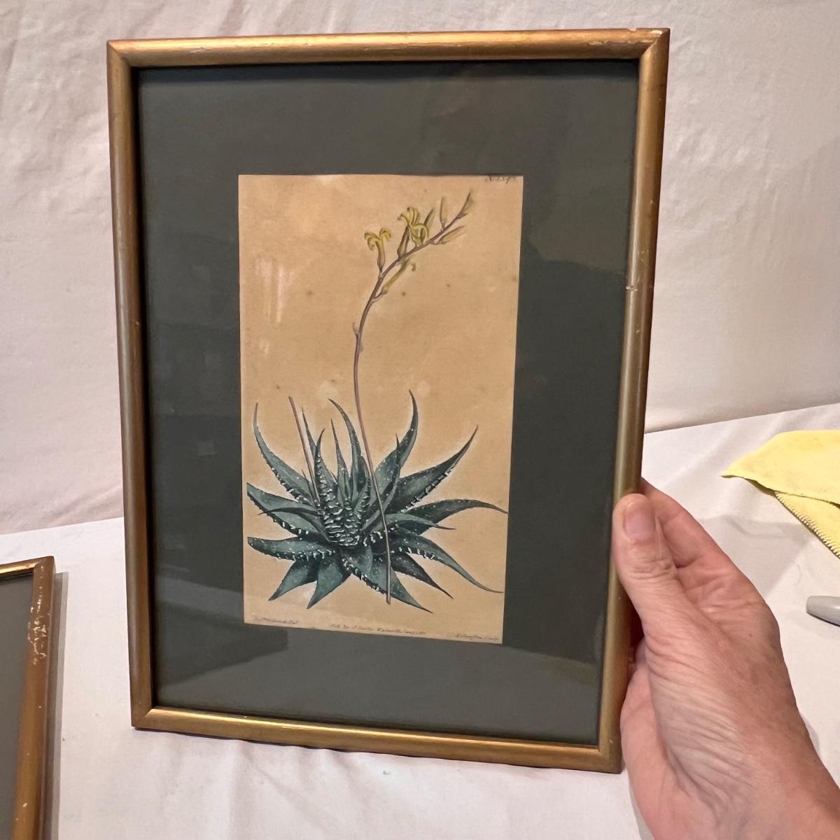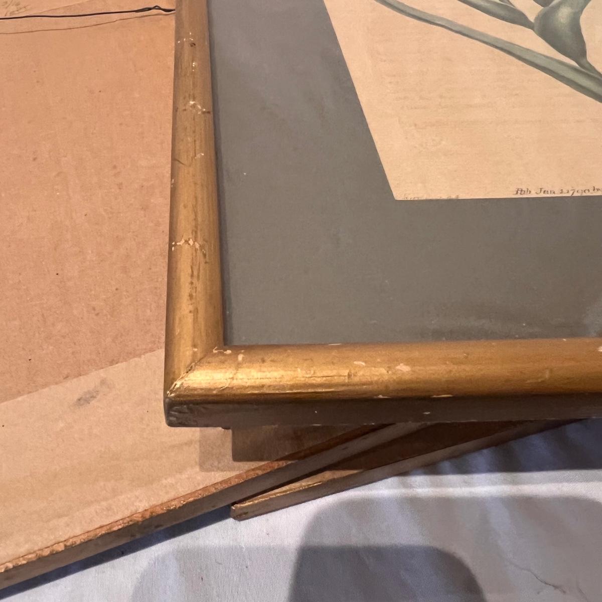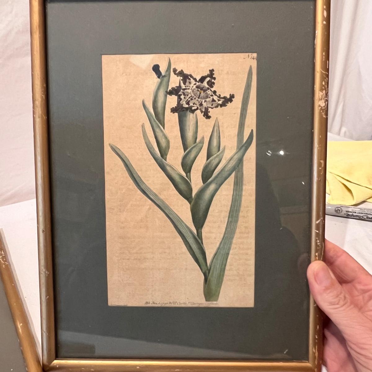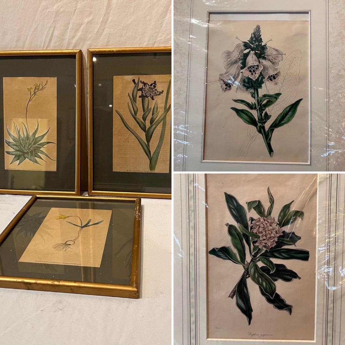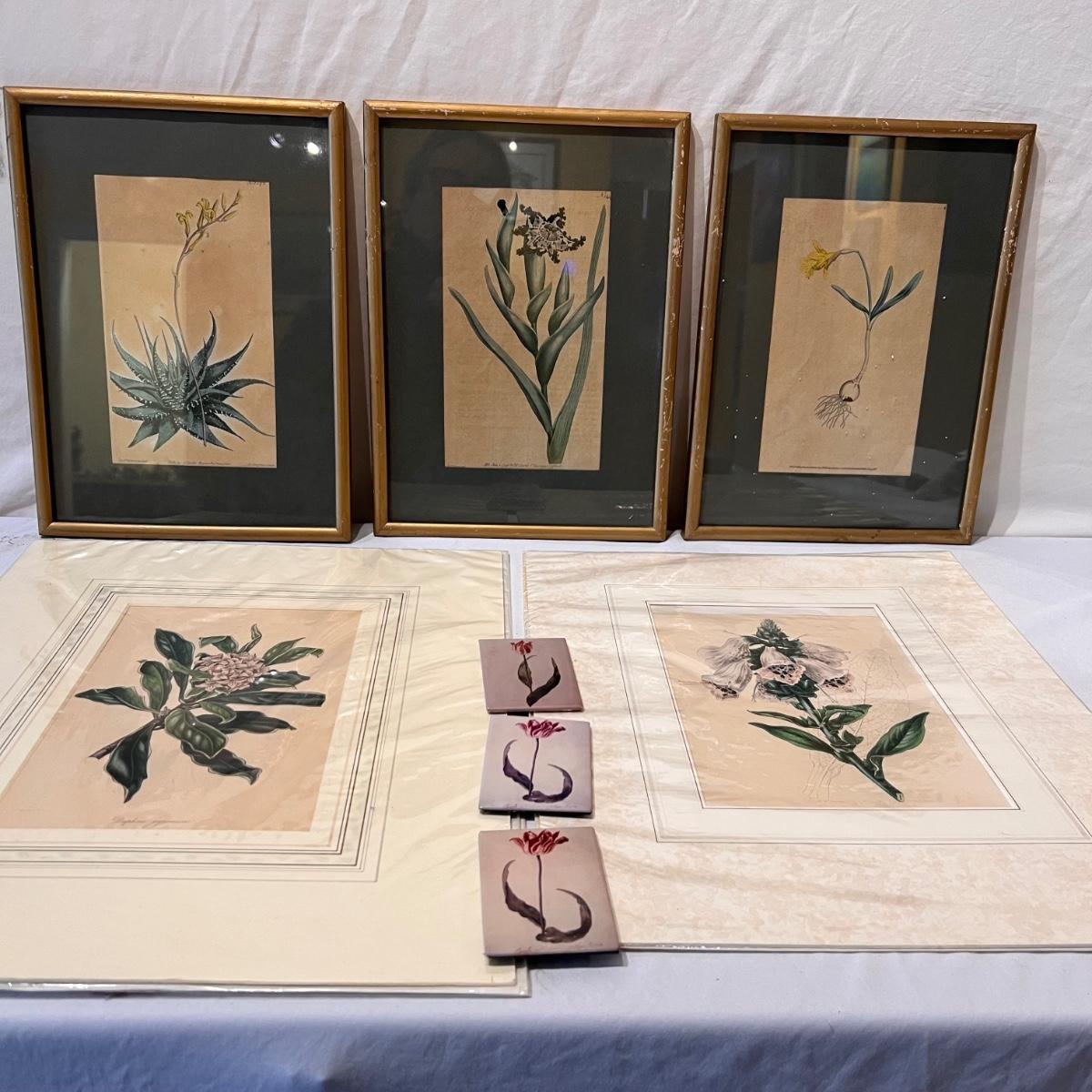 Three framed and two unframed pieces of botanical art plus three fridge magnets. The framed art are under glass, matted and mounted in matching gold wood frames; note that there are paint splatters on the glass of one which do come off. The two larger pieces are botanical illustrations that are unframed and in protective sleeves, see images for all information found.