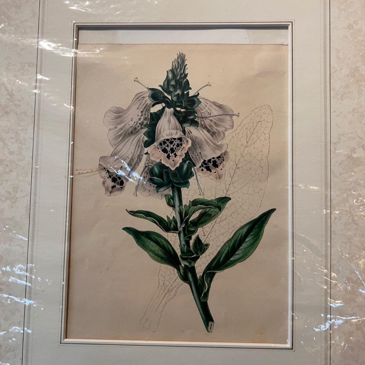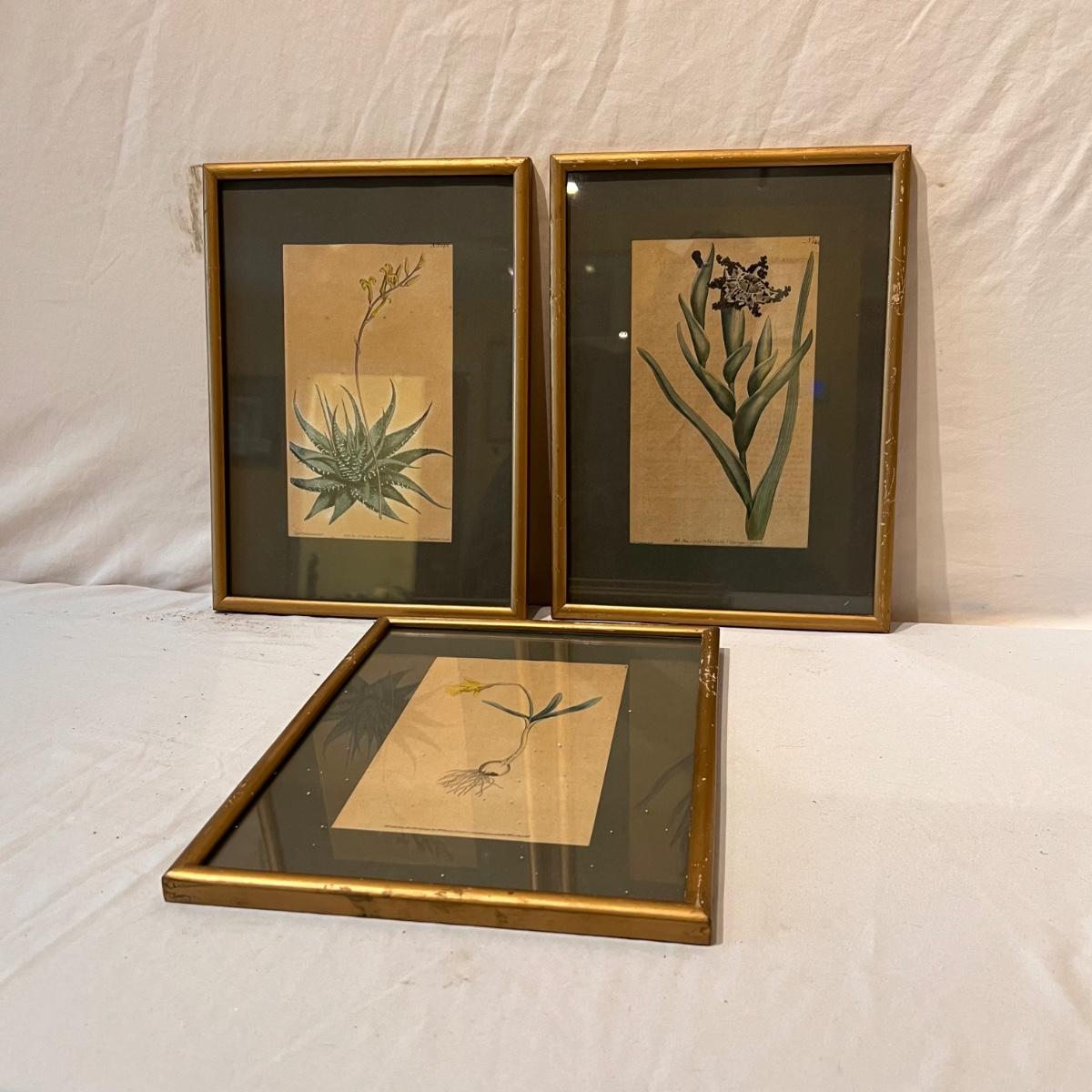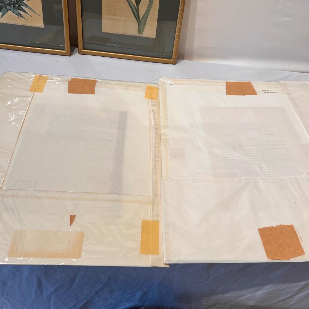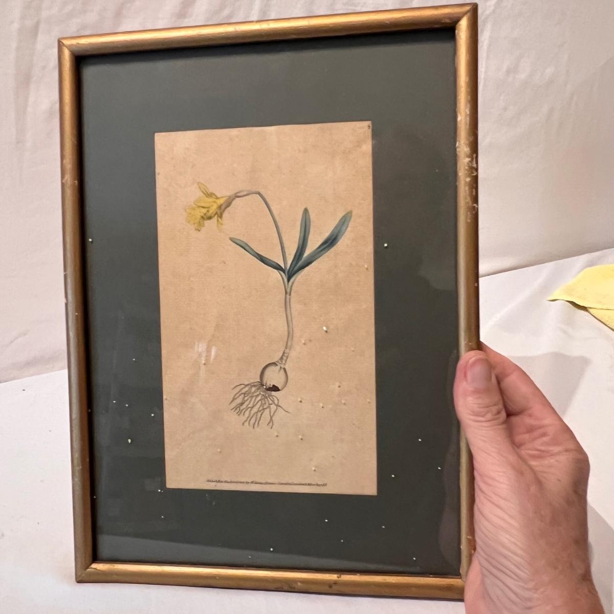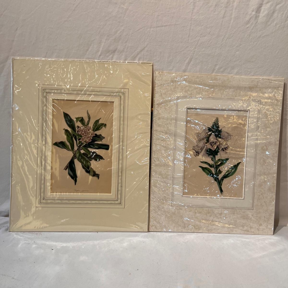 Three framed and two unframed pieces of botanical art plus three fridge magnets. The framed art are under glass, matted and mounted in matching gold wood frames; note that there are paint splatters on the glass of one which do come off. The two larger pieces are botanical illustrations that are unframed and in protective sleeves, see images for all information found.