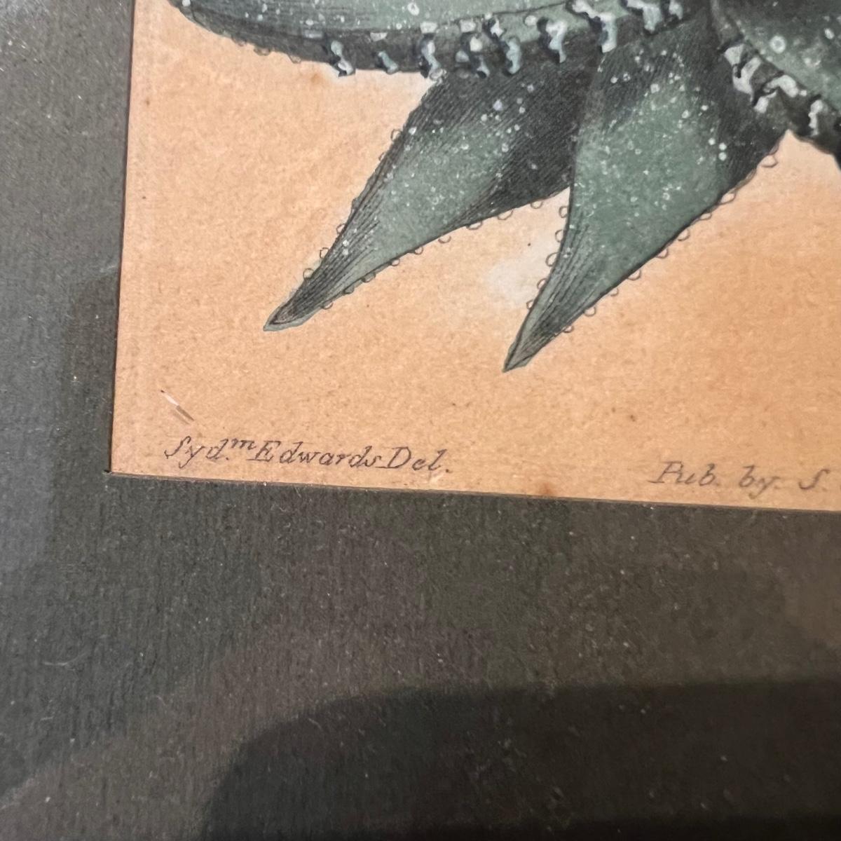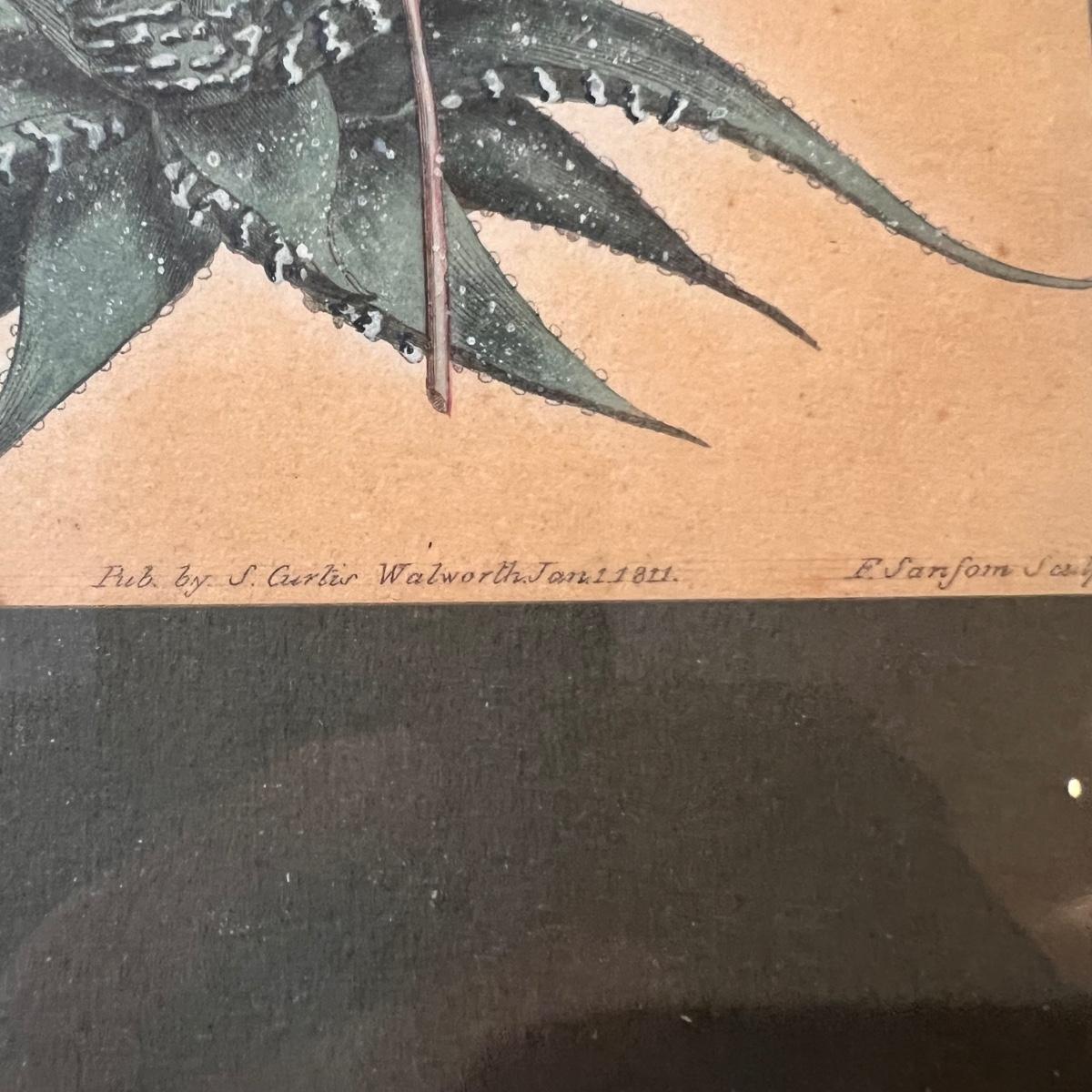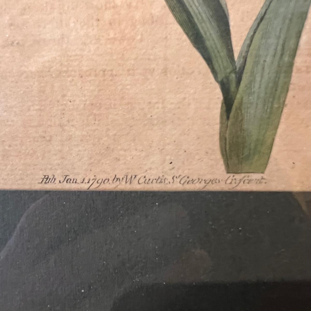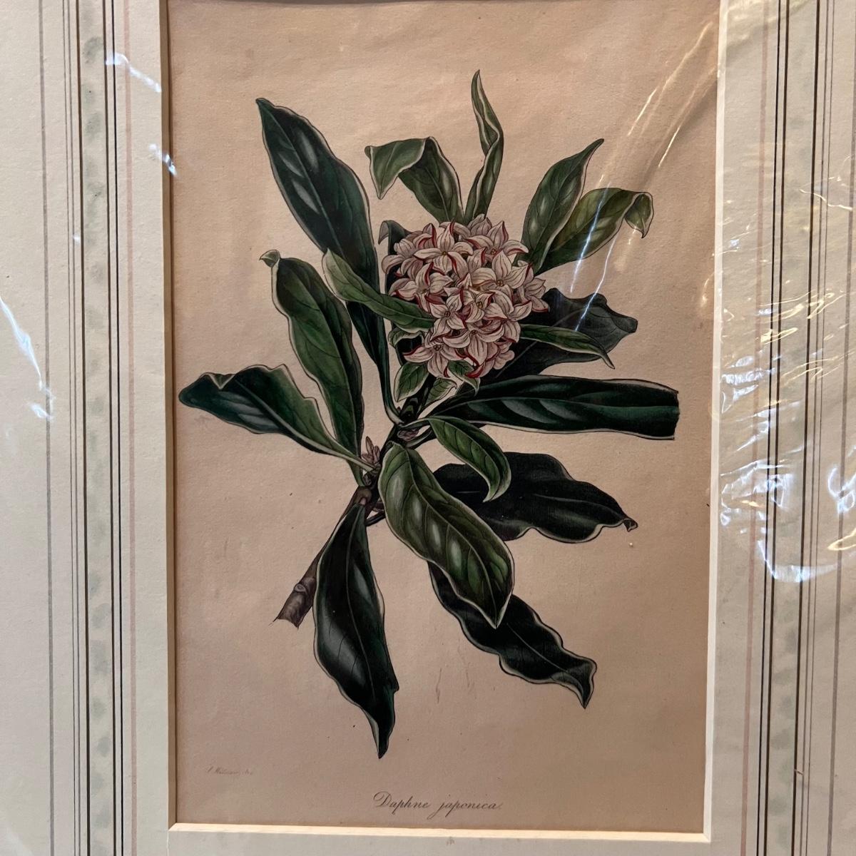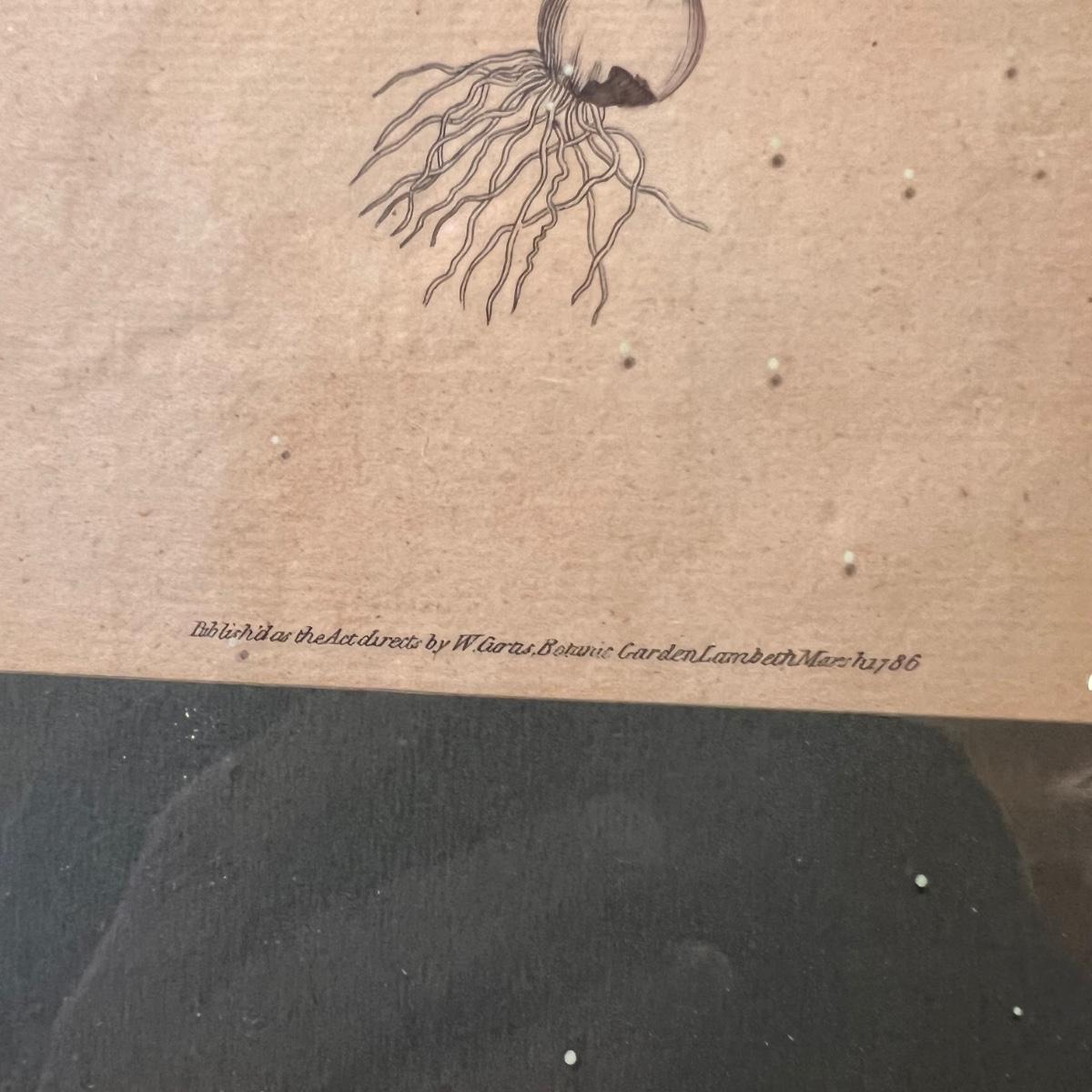 Three framed and two unframed pieces of botanical art plus three fridge magnets. The framed art are under glass, matted and mounted in matching gold wood frames; note that there are paint splatters on the glass of one which do come off. The two larger pieces are botanical illustrations that are unframed and in protective sleeves, see images for all information found.