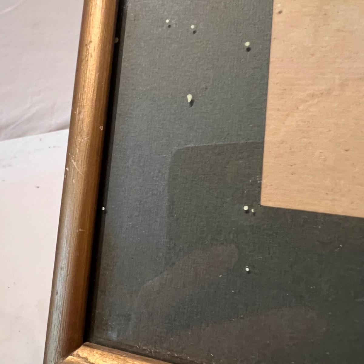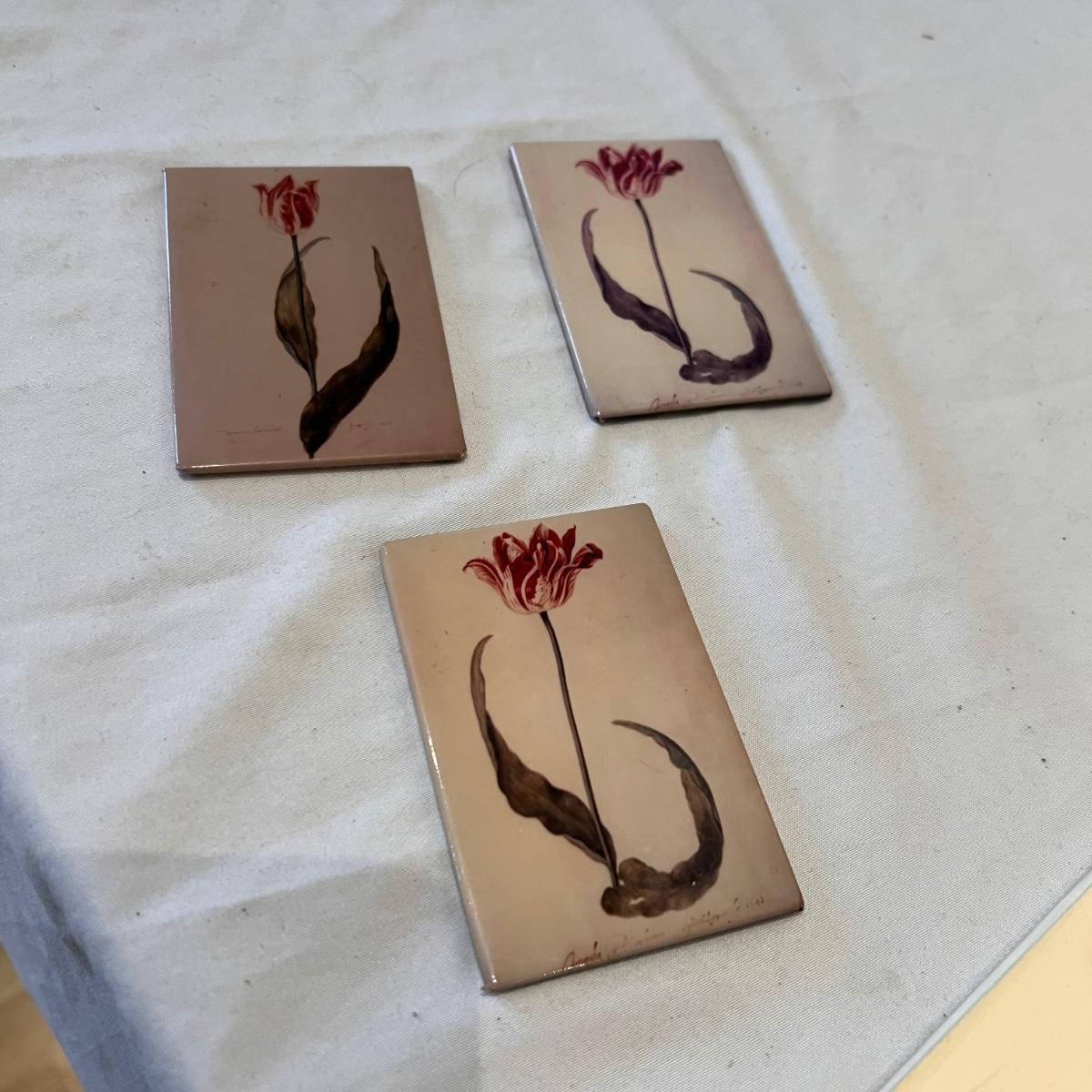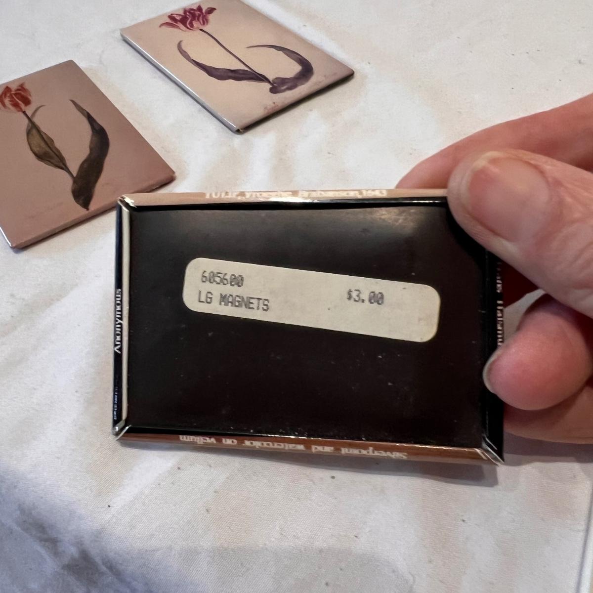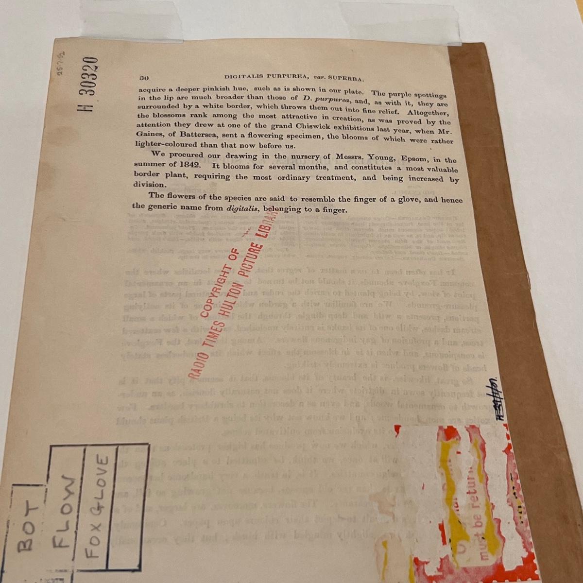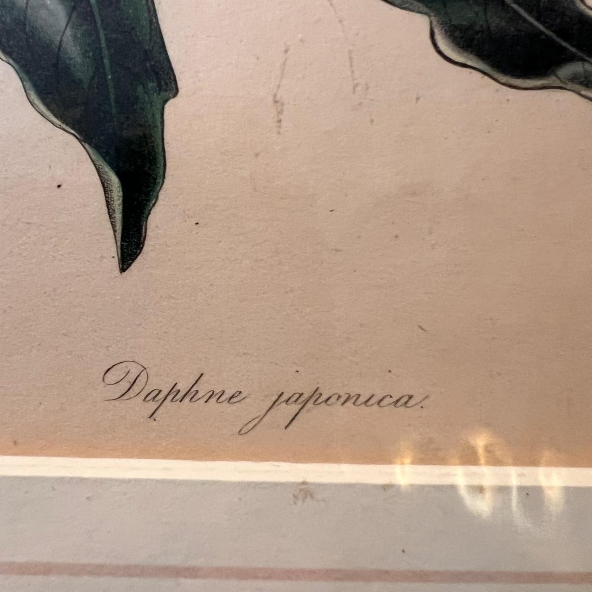 Three framed and two unframed pieces of botanical art plus three fridge magnets. The framed art are under glass, matted and mounted in matching gold wood frames; note that there are paint splatters on the glass of one which do come off. The two larger pieces are botanical illustrations that are unframed and in protective sleeves, see images for all information found.