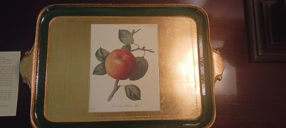 11 3/4 " wide, 17 1/2" lgth. Tray is gold in color with a forest green border