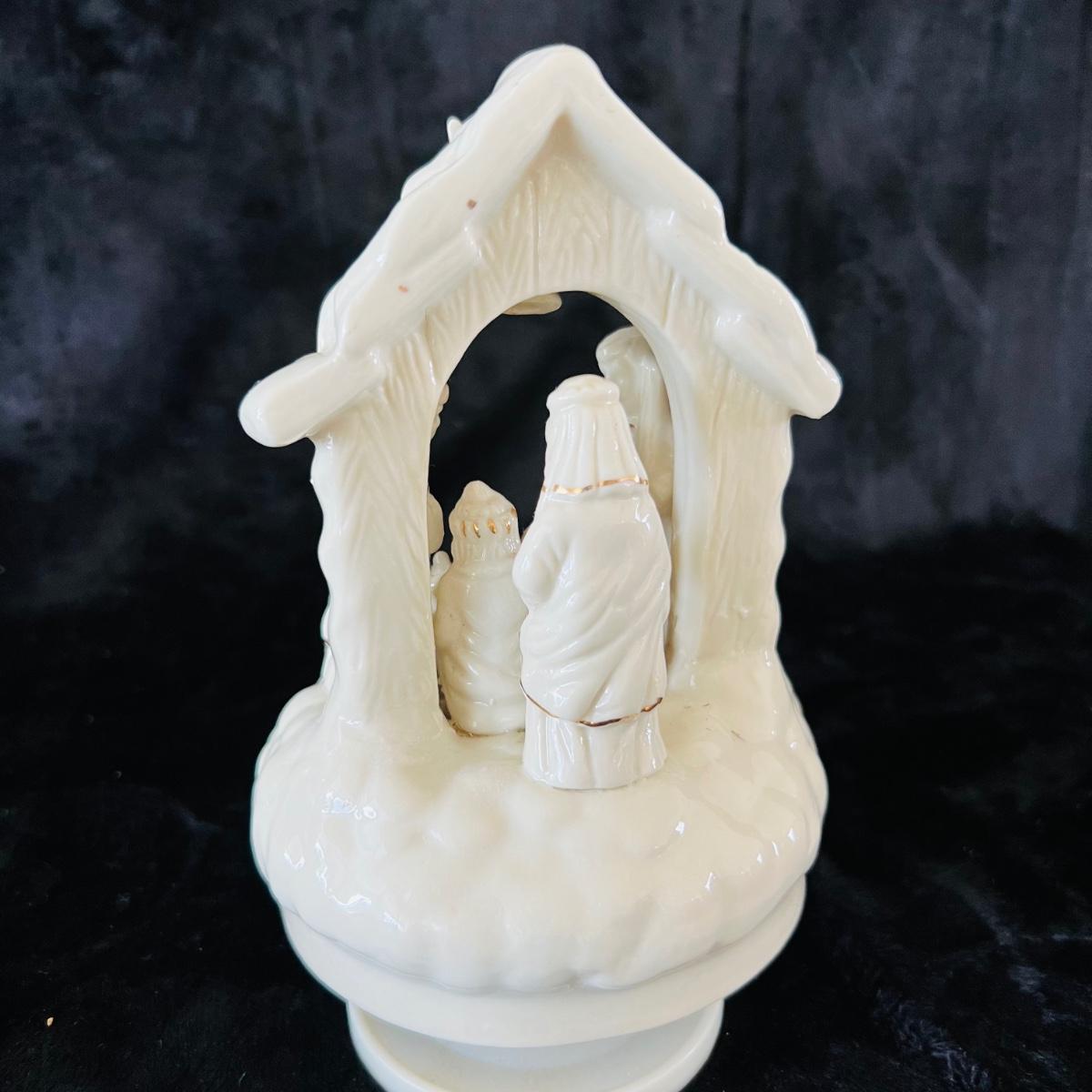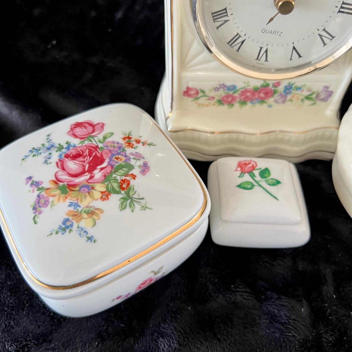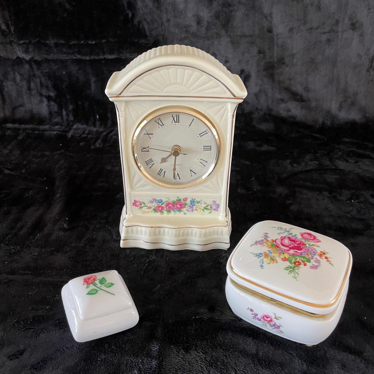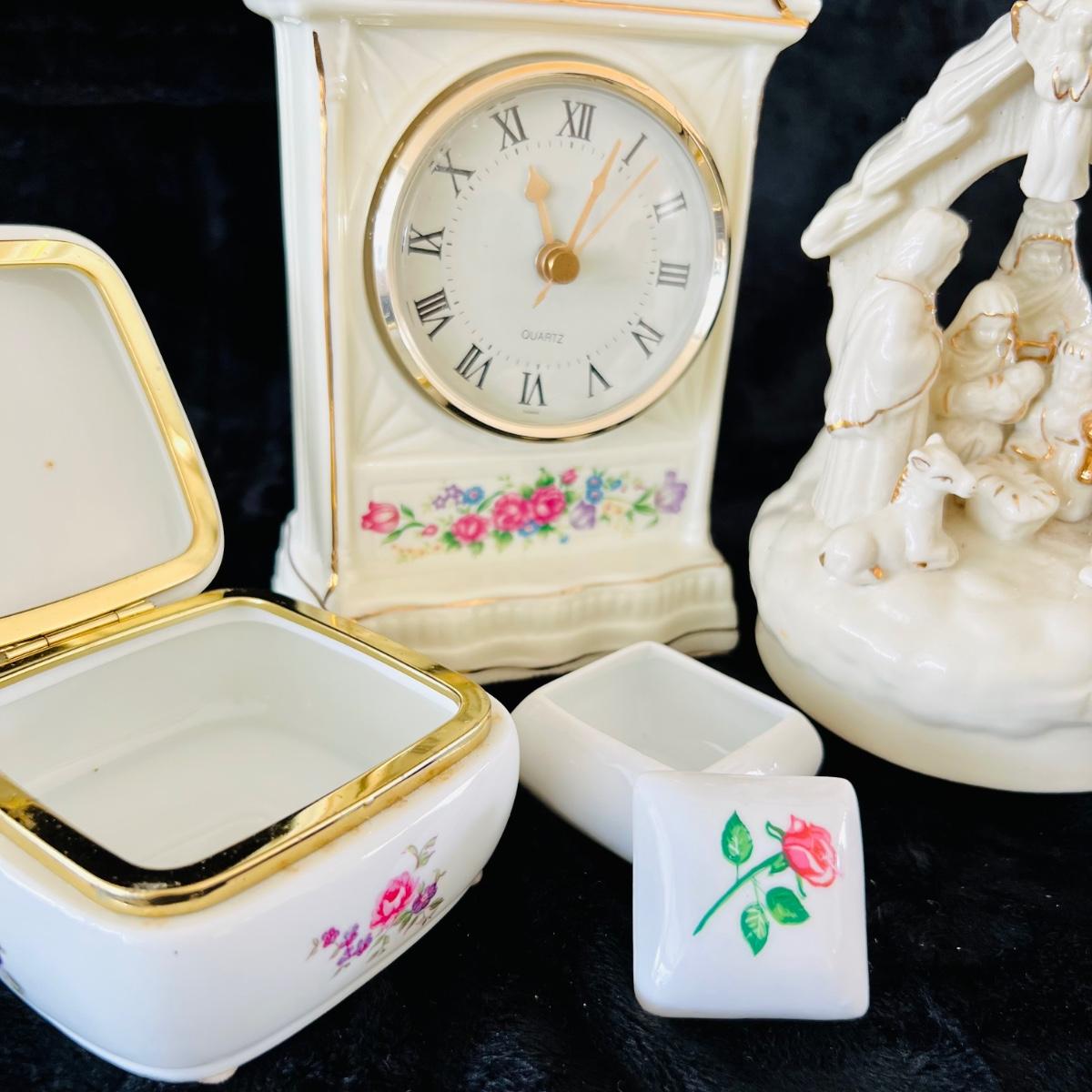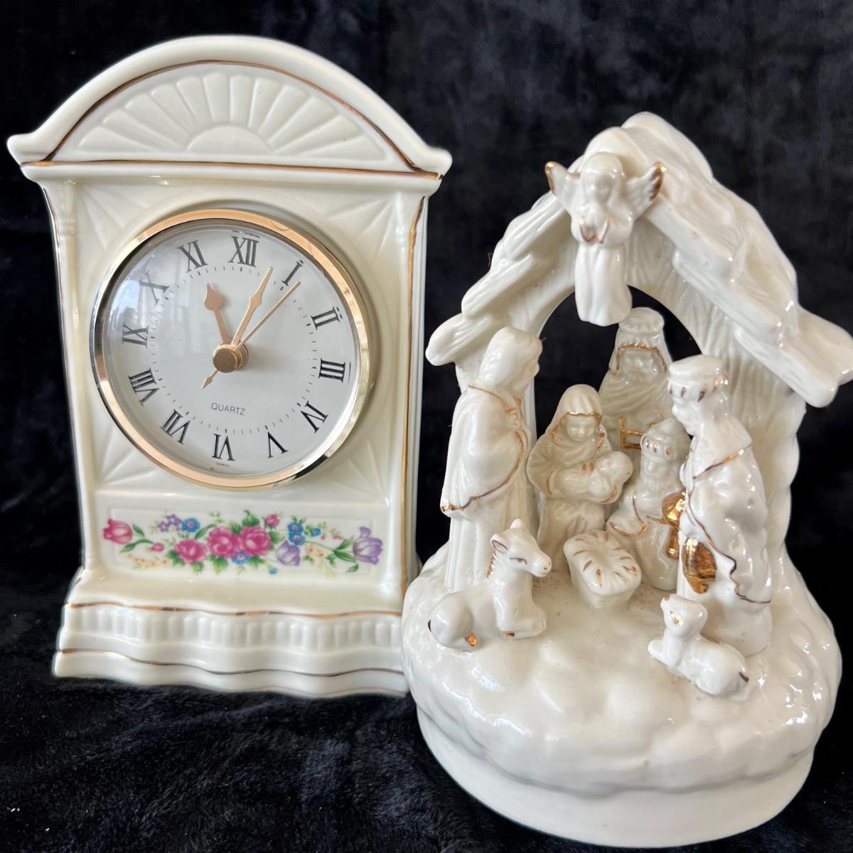 Nativity Scene plays “ “ Porcelain quartz clock with gold trim & floral motif meas.5”w x 7.5”h. Larger trinket box meas. 3.5”x3.5”x2”h. No chipping. (D-JM)