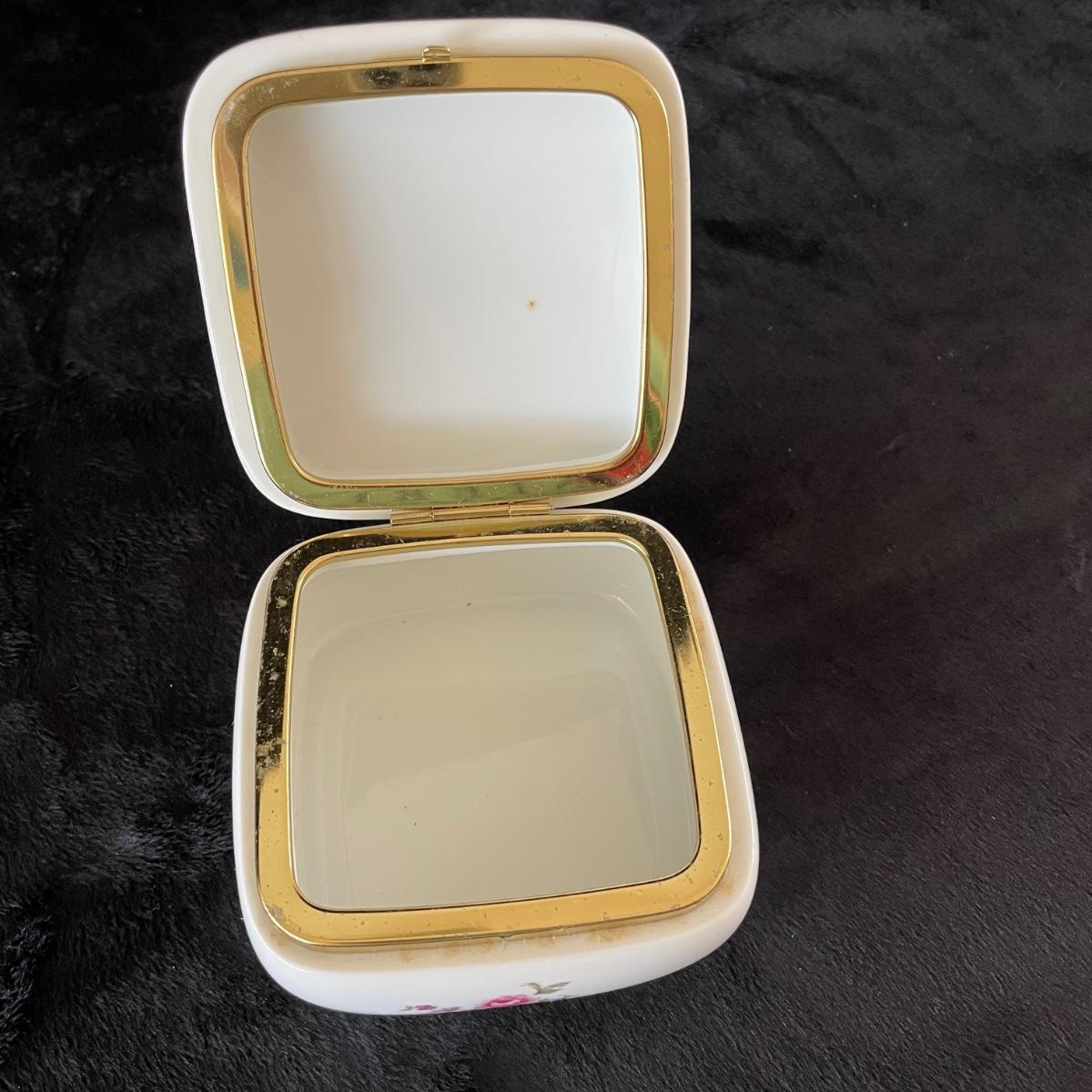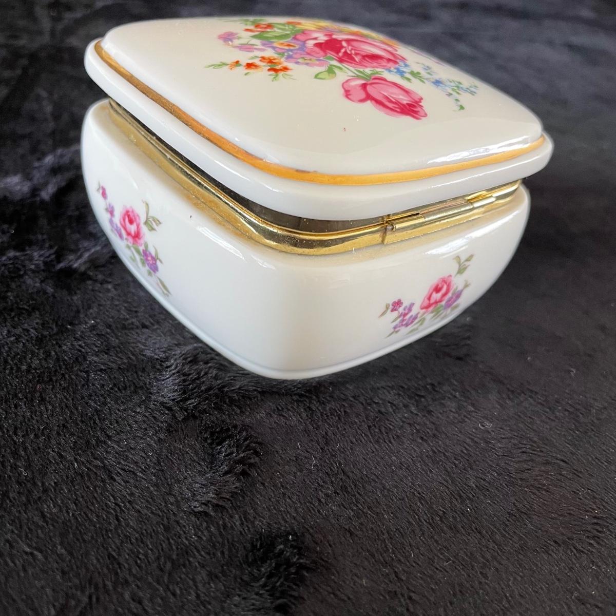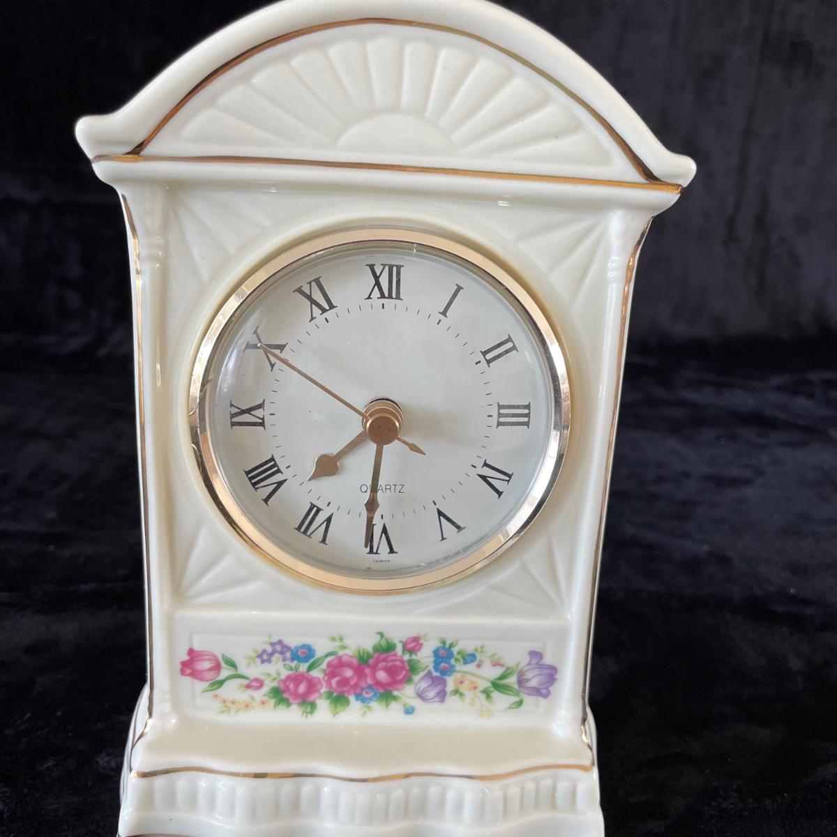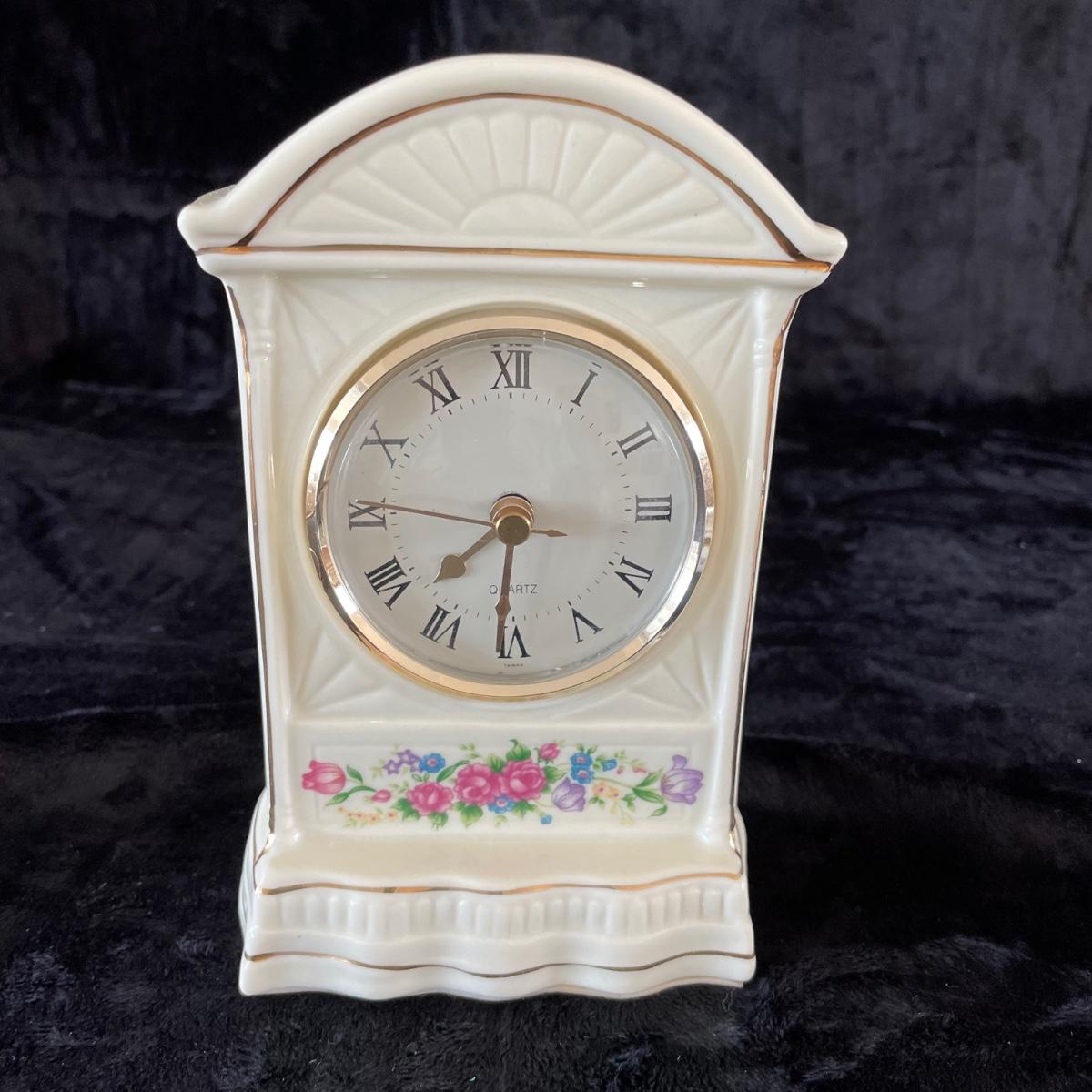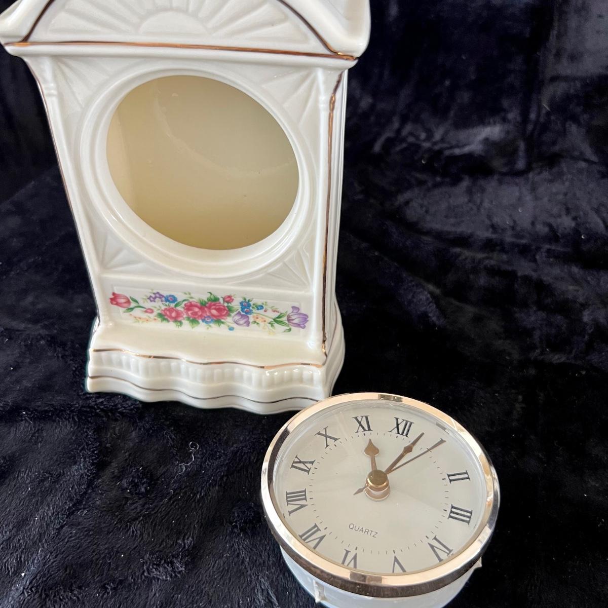 Nativity Scene plays “ “ Porcelain quartz clock with gold trim & floral motif meas.5”w x 7.5”h. Larger trinket box meas. 3.5”x3.5”x2”h. No chipping. (D-JM)