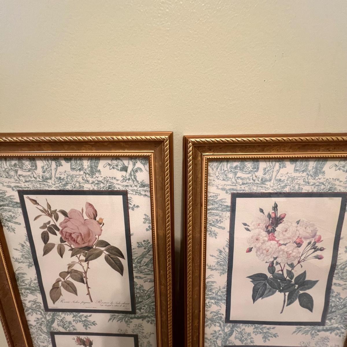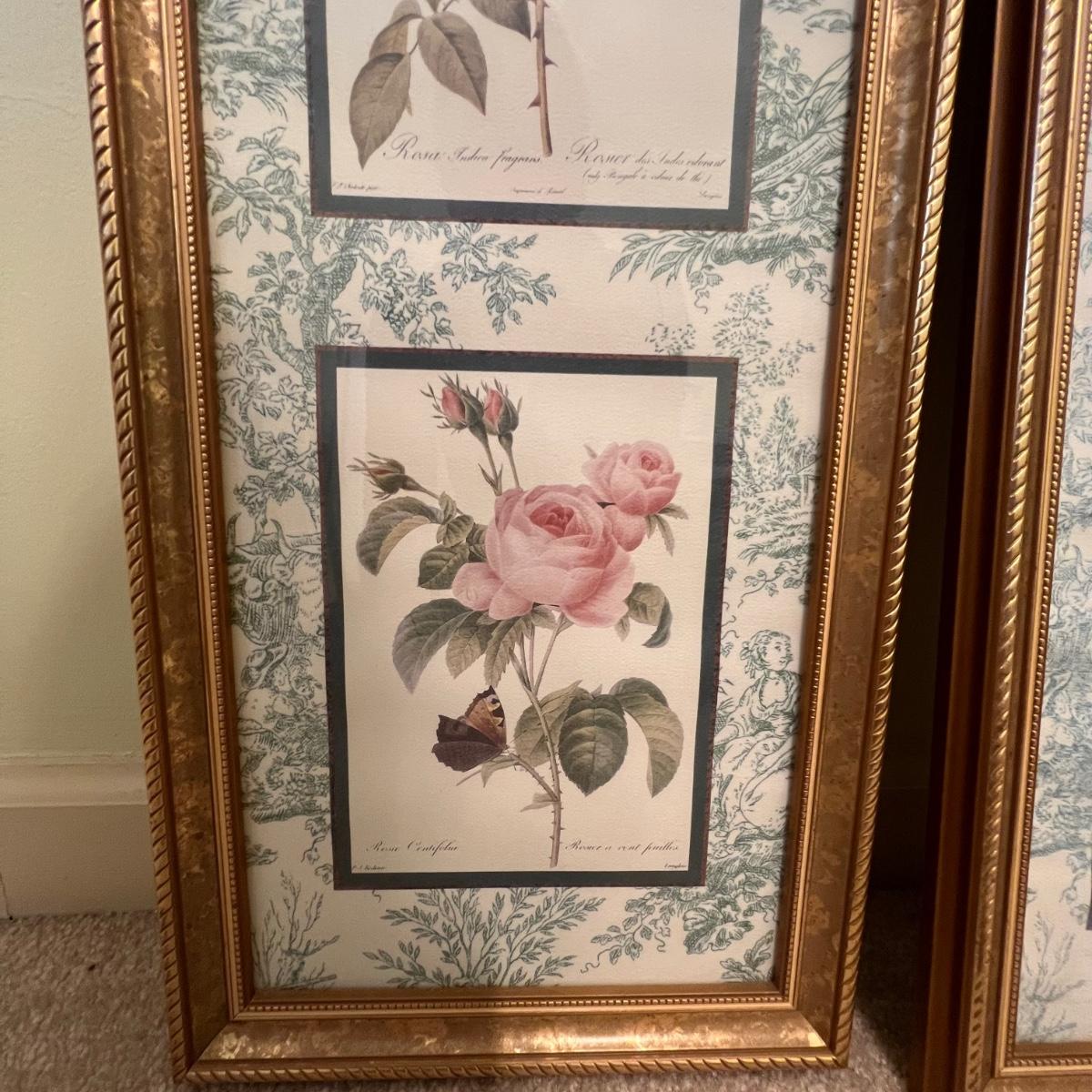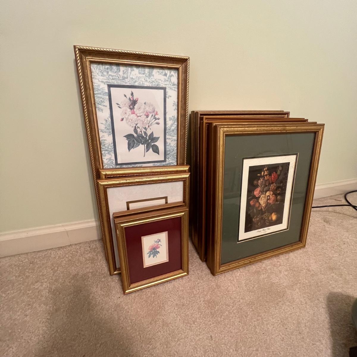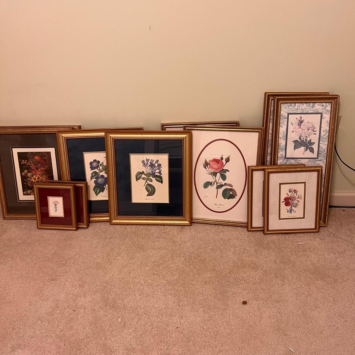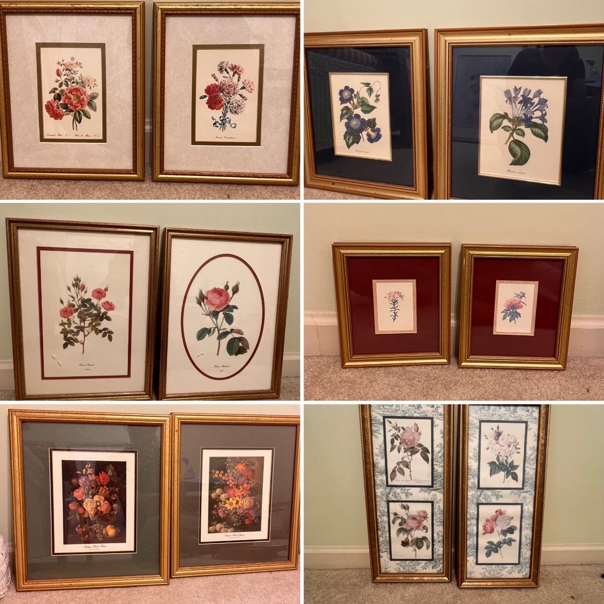 Six pairs of floral framed art for a total of twelve. All prints are under glass, matted and mounted in wooden frames with a gilded finish. Any white markings on glass are just sticker residue and should be easy to remove. The tallest frames measure 9.5” x 21.5”H.