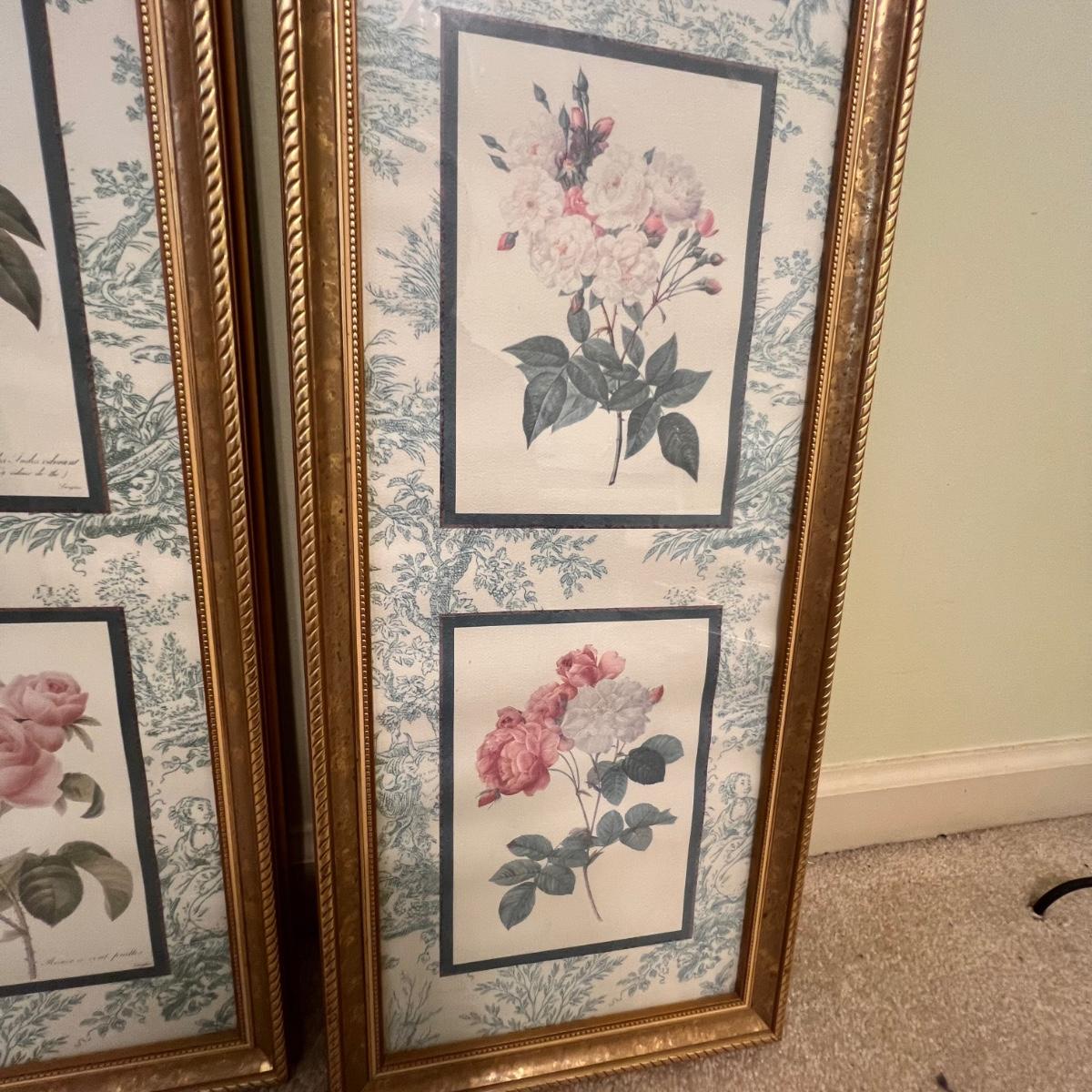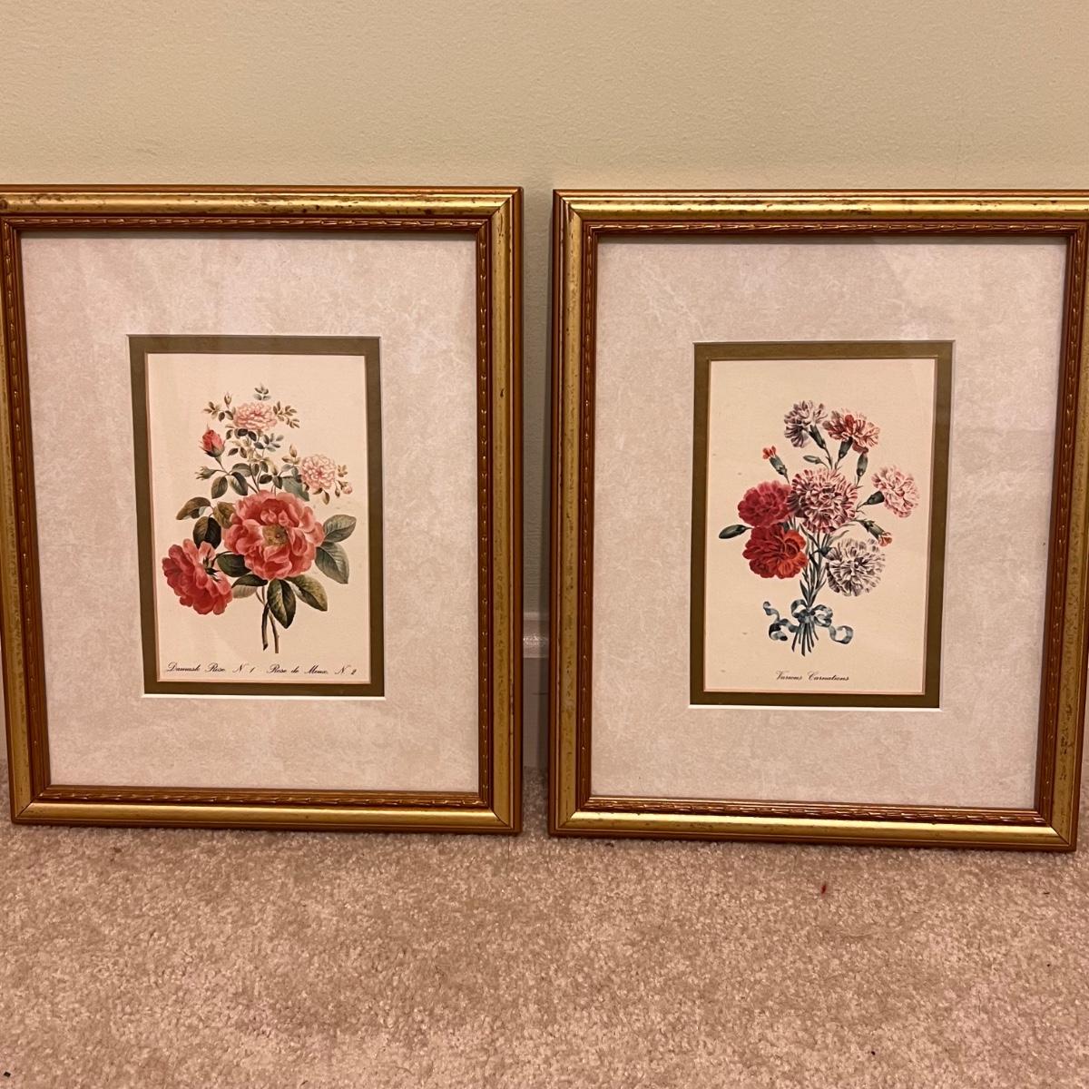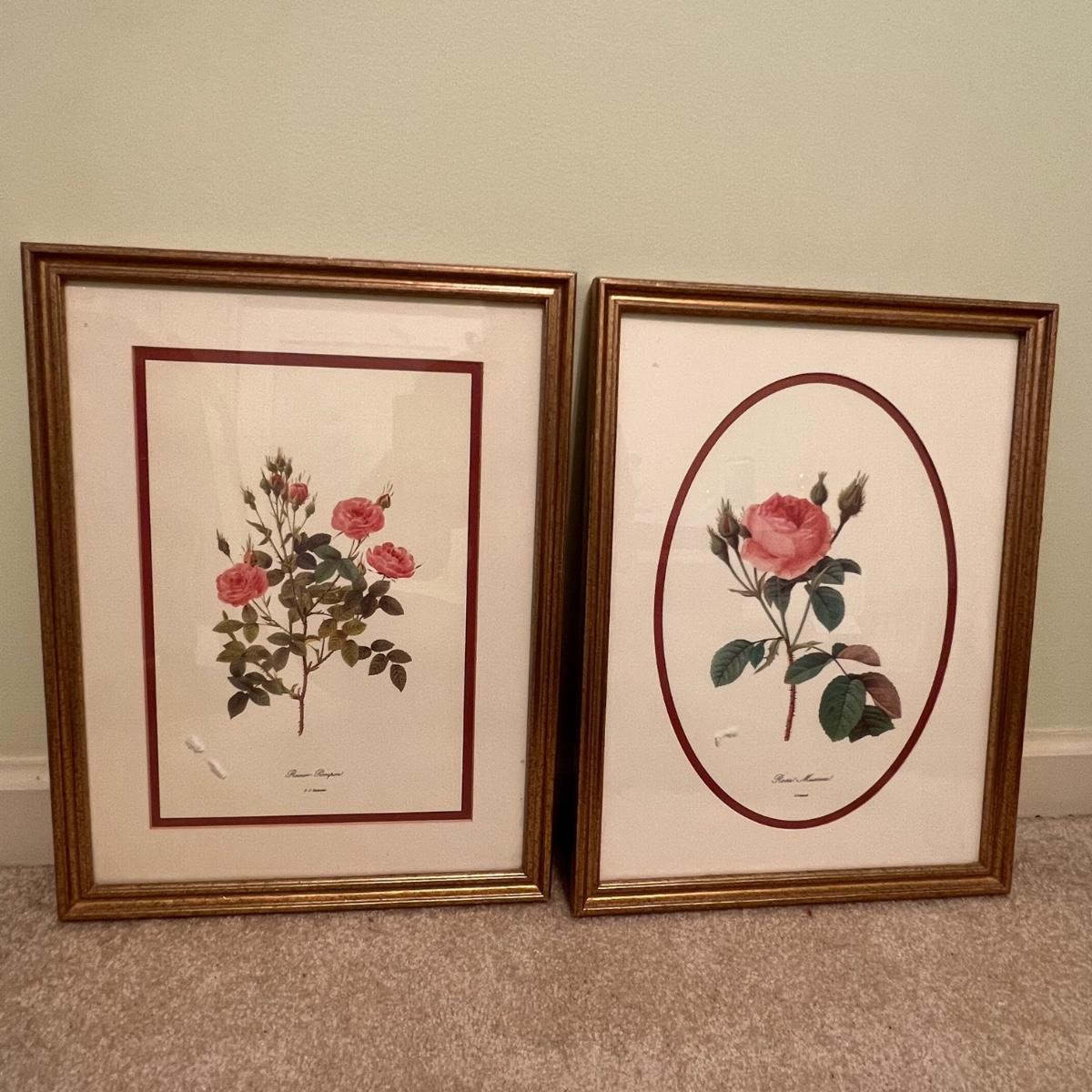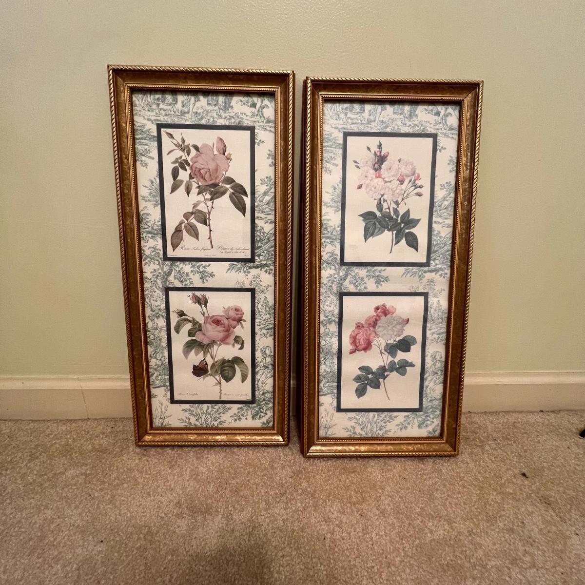 Six pairs of floral framed art for a total of twelve. All prints are under glass, matted and mounted in wooden frames with a gilded finish. Any white markings on glass are just sticker residue and should be easy to remove. The tallest frames measure 9.5” x 21.5”H.