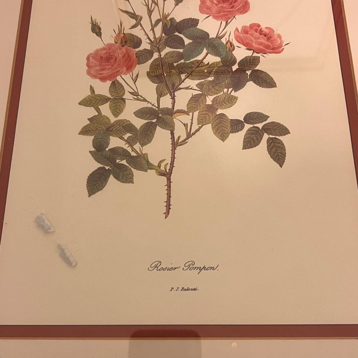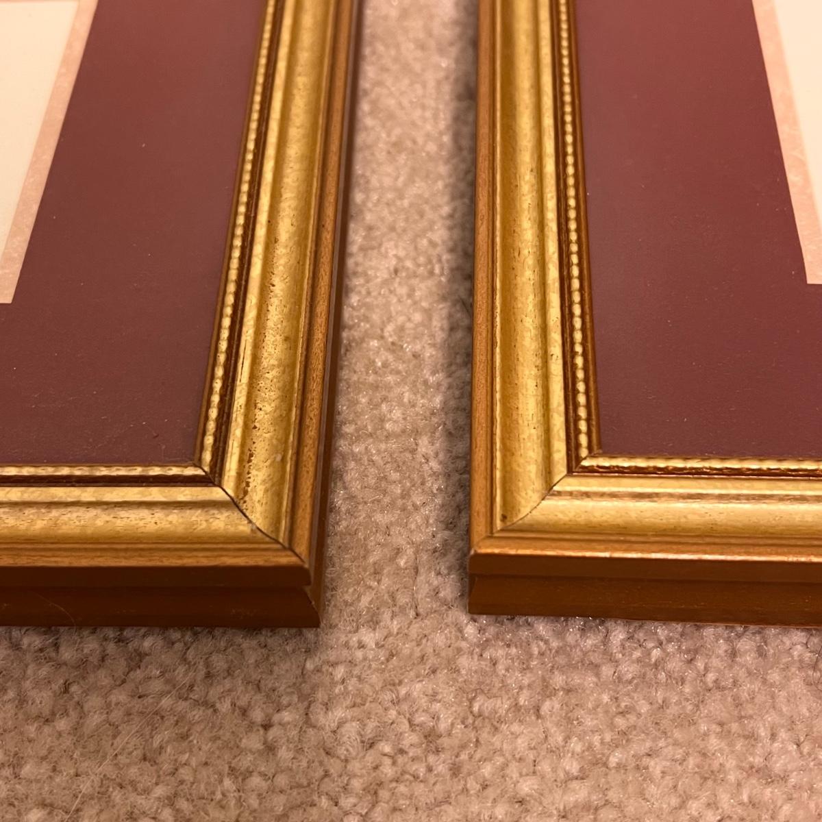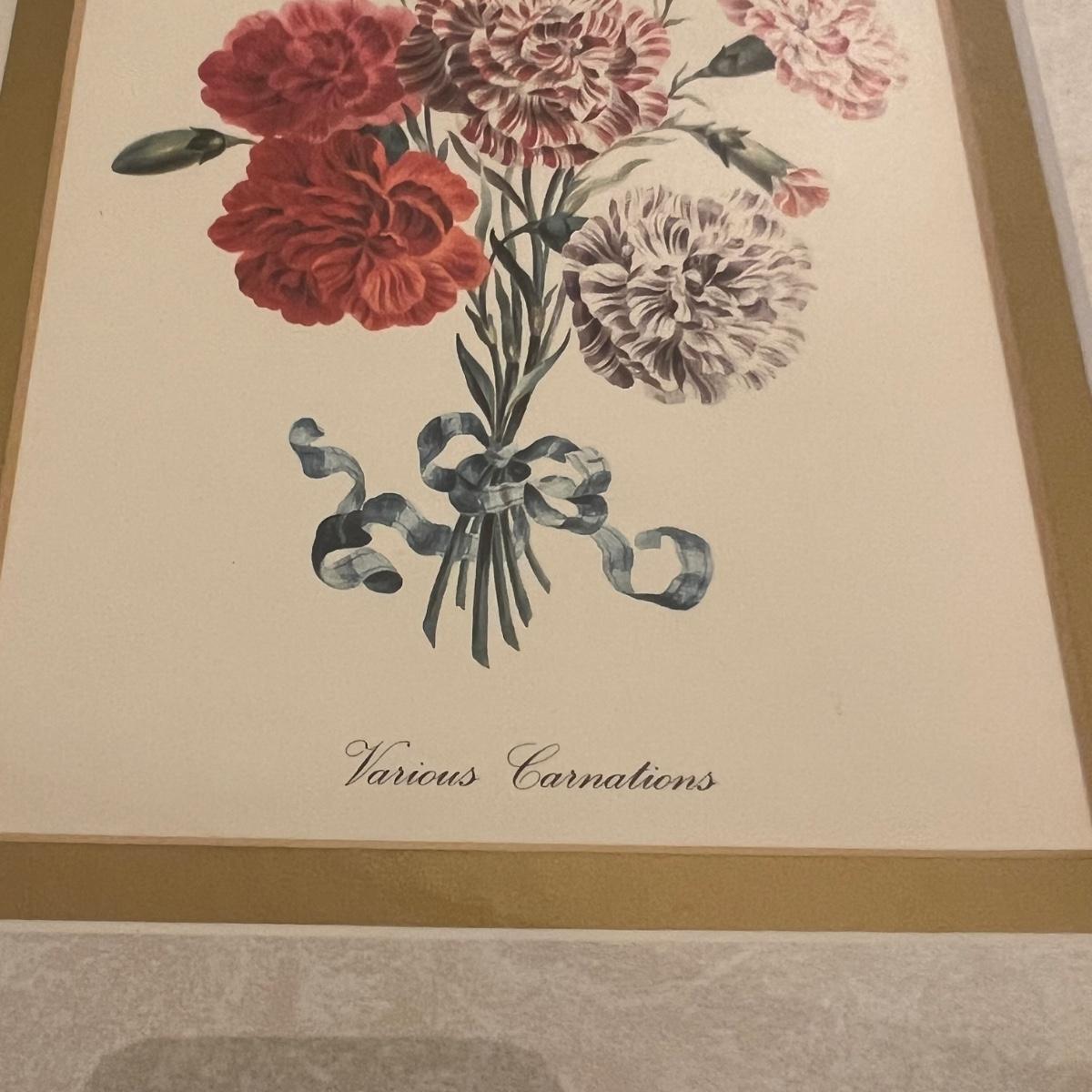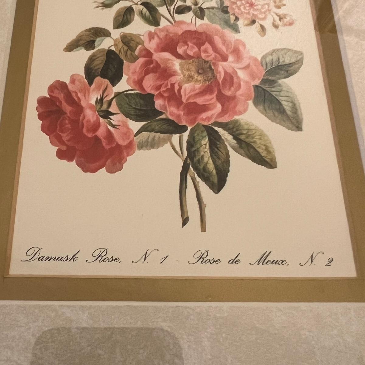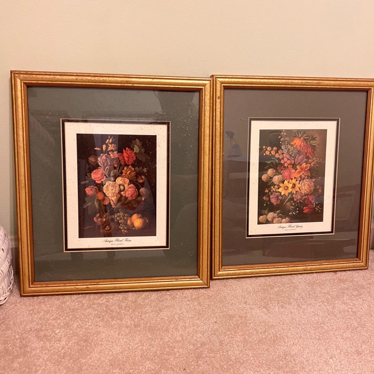 Six pairs of floral framed art for a total of twelve. All prints are under glass, matted and mounted in wooden frames with a gilded finish. Any white markings on glass are just sticker residue and should be easy to remove. The tallest frames measure 9.5” x 21.5”H.